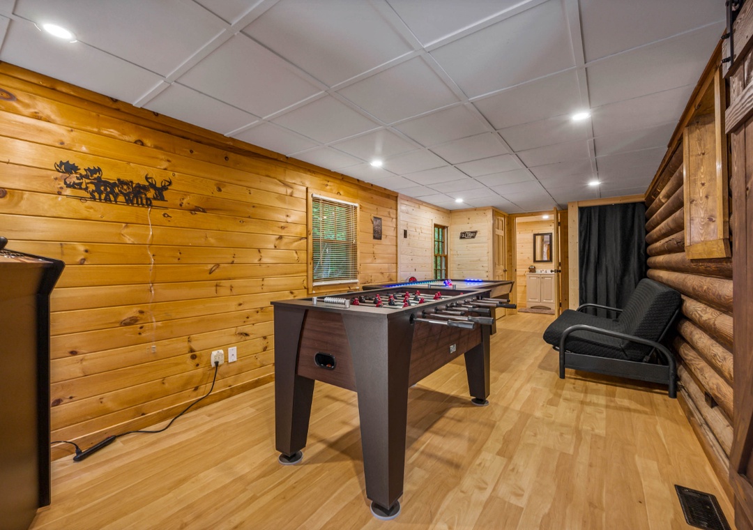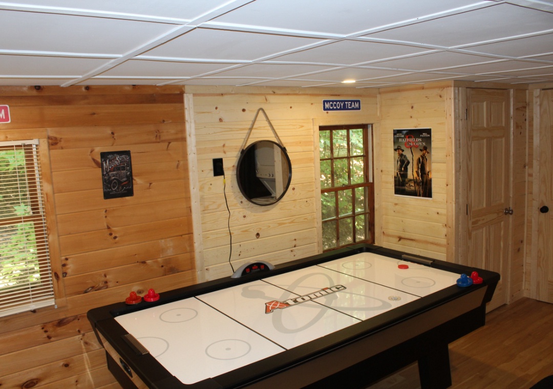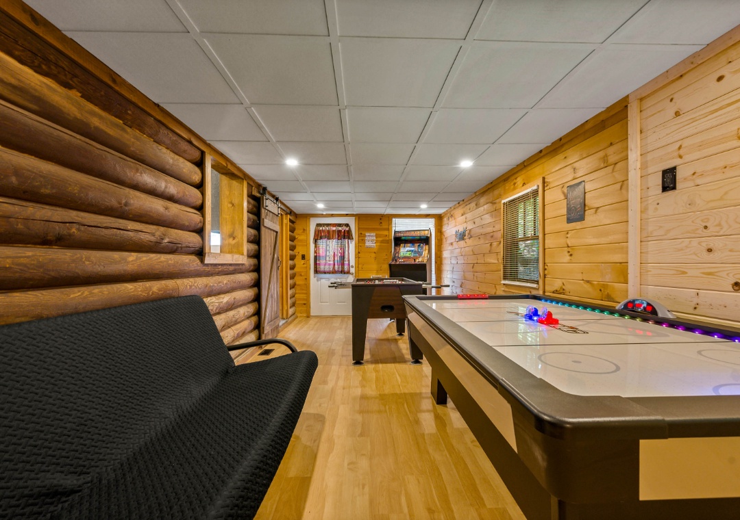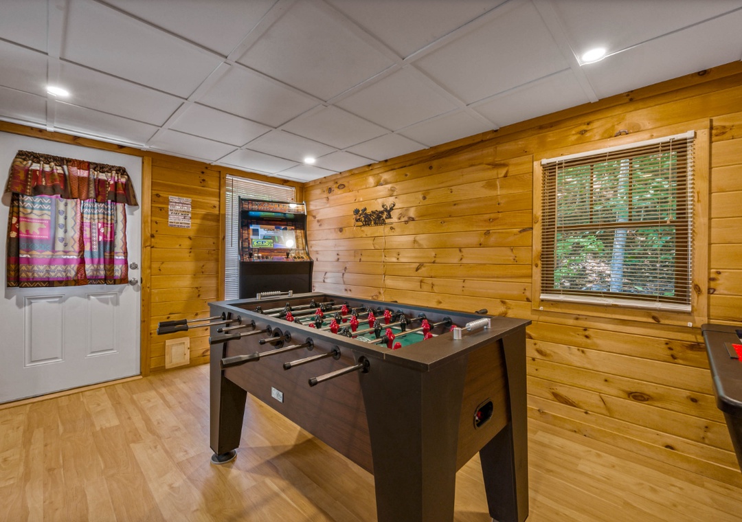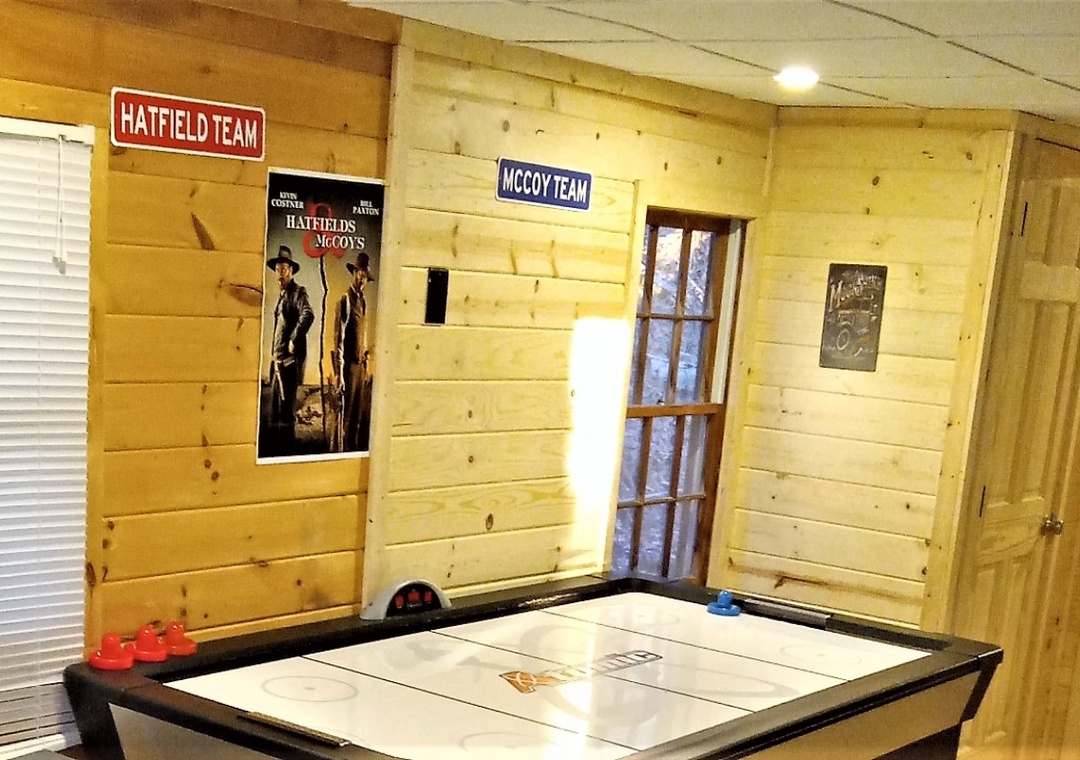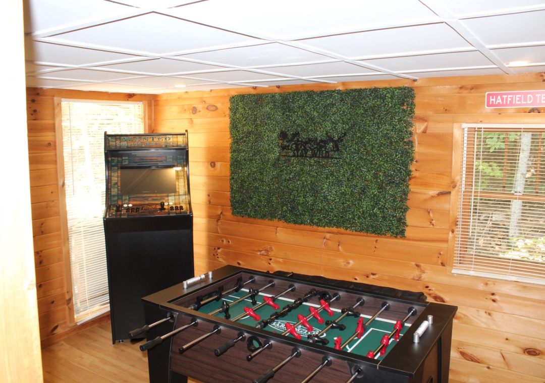 The dedicated game area is packed with options to keep everyone entertained for hours. Challenge your group to high-score battles on the arcade machine, keep the energy going with fast-paced matches on the foosball table, or turn up the competition with intense air hockey showdowns. There’s even corn hole for laid-back fun that brings everyone together. After an evening of games, the entertainment continues in the cozy living room. Set the mood with the glow of the electric fireplace while you stream your favorite movies, shows, or sports on the Google TV. Outside, the private hot tub on the back deck offers a relaxing way to recharge between game sessions. Soak under the stars, share stories from the day’s competitions, and enjoy the peaceful wooded setting that surrounds you. Fire up the propane BBQ grill and turn dinner into an event of its own, complete with outdoor dining and mountain air. For guests who love outdoor recreation, access to five private fishing ponds adds yet another activity to your stay. Spend the afternoon casting a line, enjoying the quiet thrill of the catch, and making the most of the natural beauty that makes the Smokies so special.