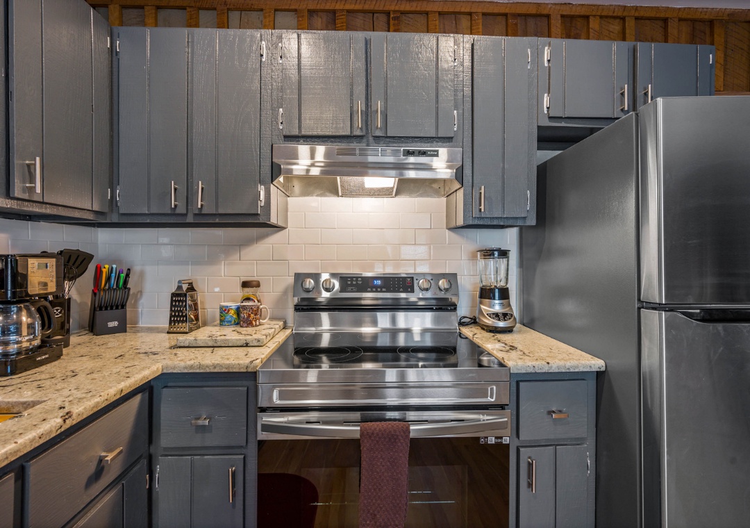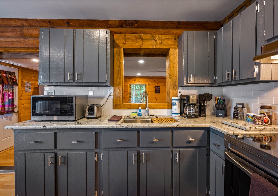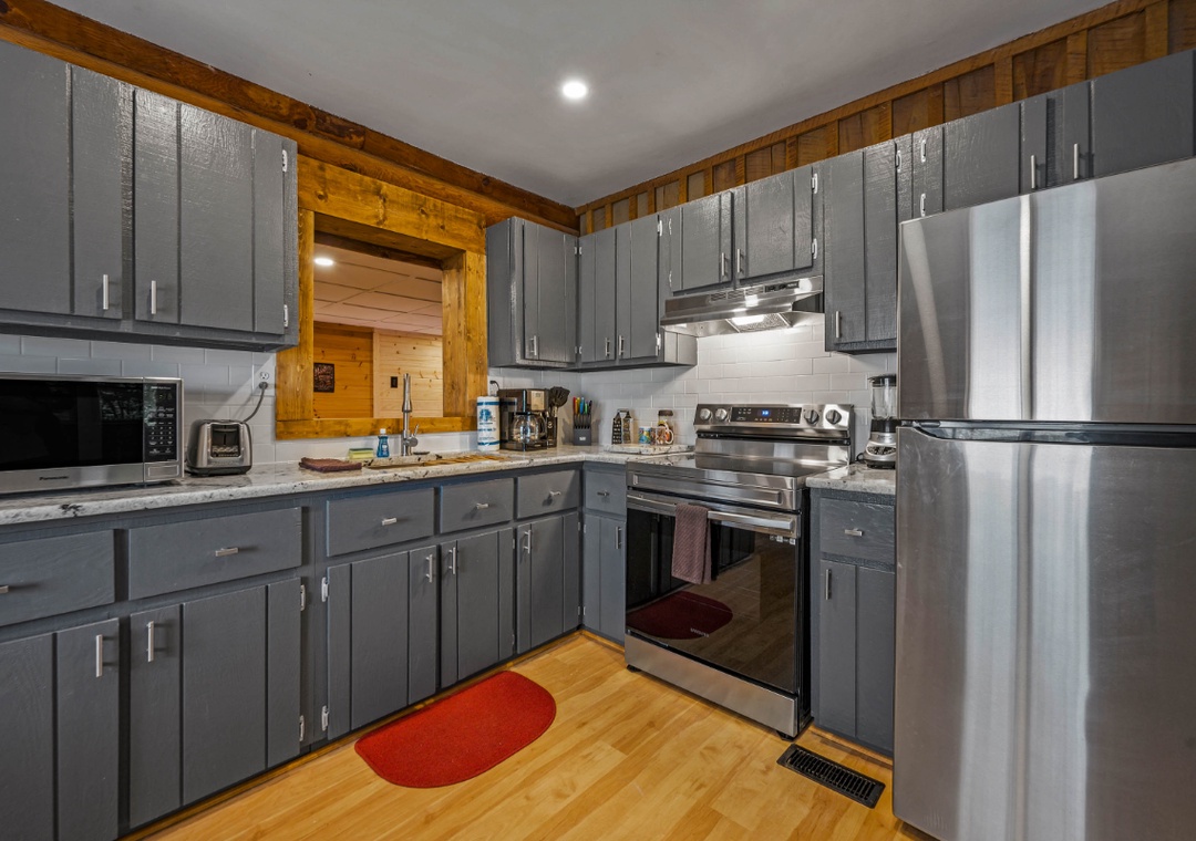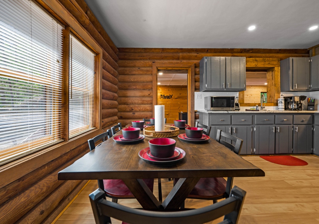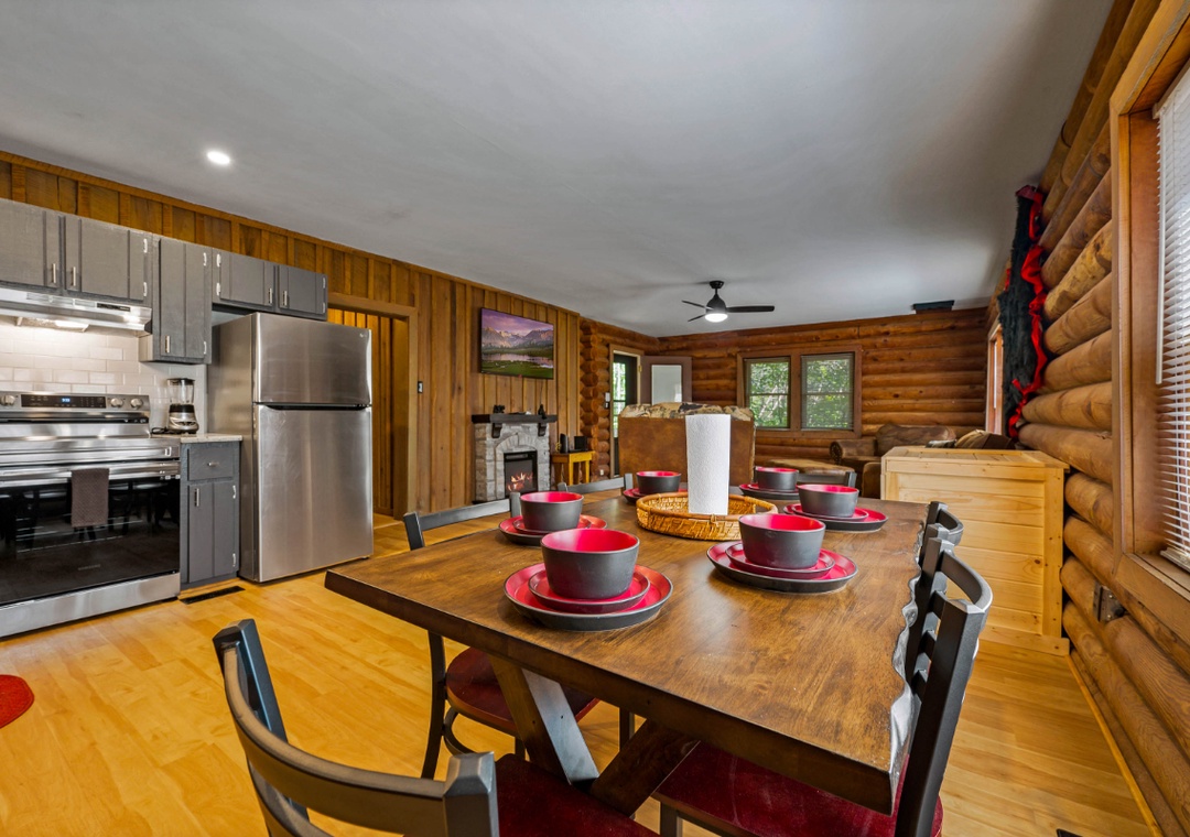 The fully-equipped kitchen boasts modern amenities, making it easy to prepare delicious meals for your family or friends. Well-appointed with a refrigerator, stove, microwave, and other kitchen appliances, perfect for making breakfast, lunch, or dinner throughout your stay! All pots, pans, glasses, plates, silverware, etc., are also there for you! Gather around the inviting dining table to savor your meal while enjoying the fresh mountain air.