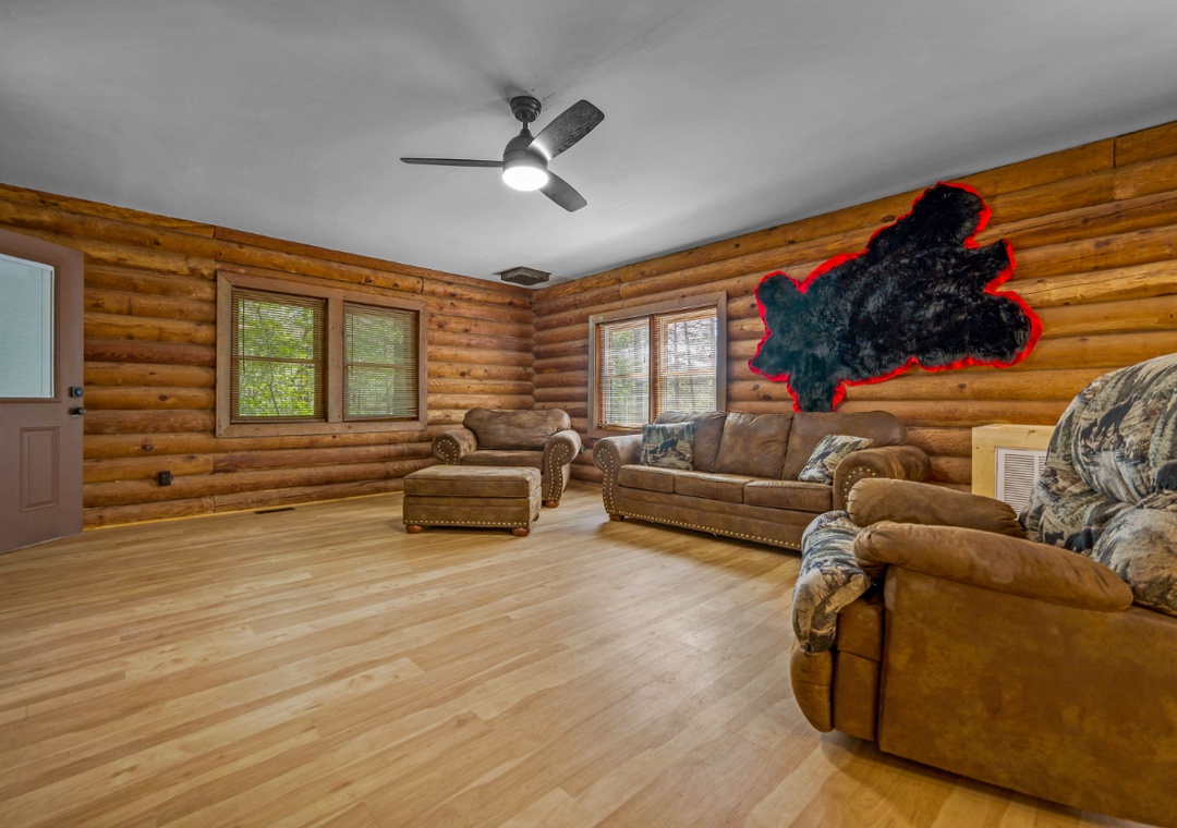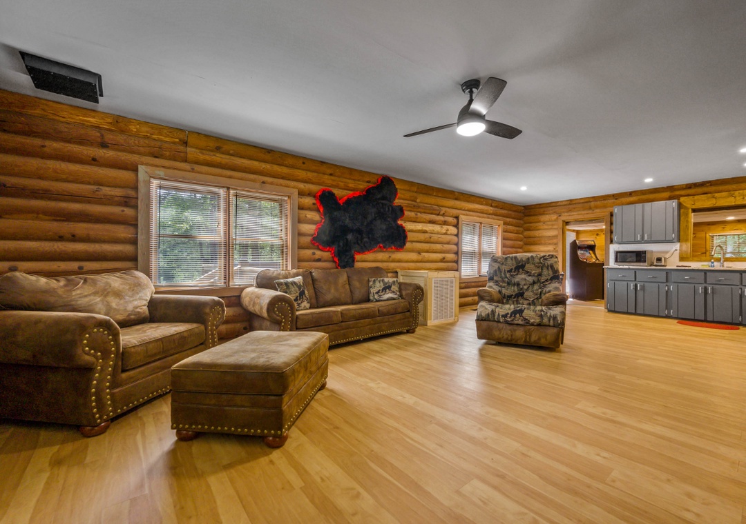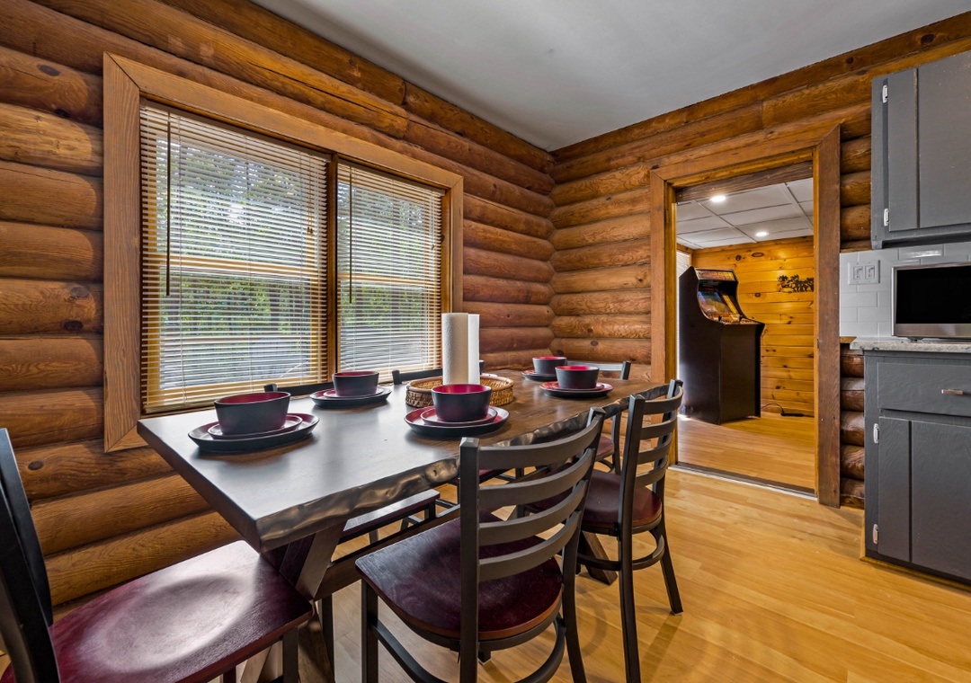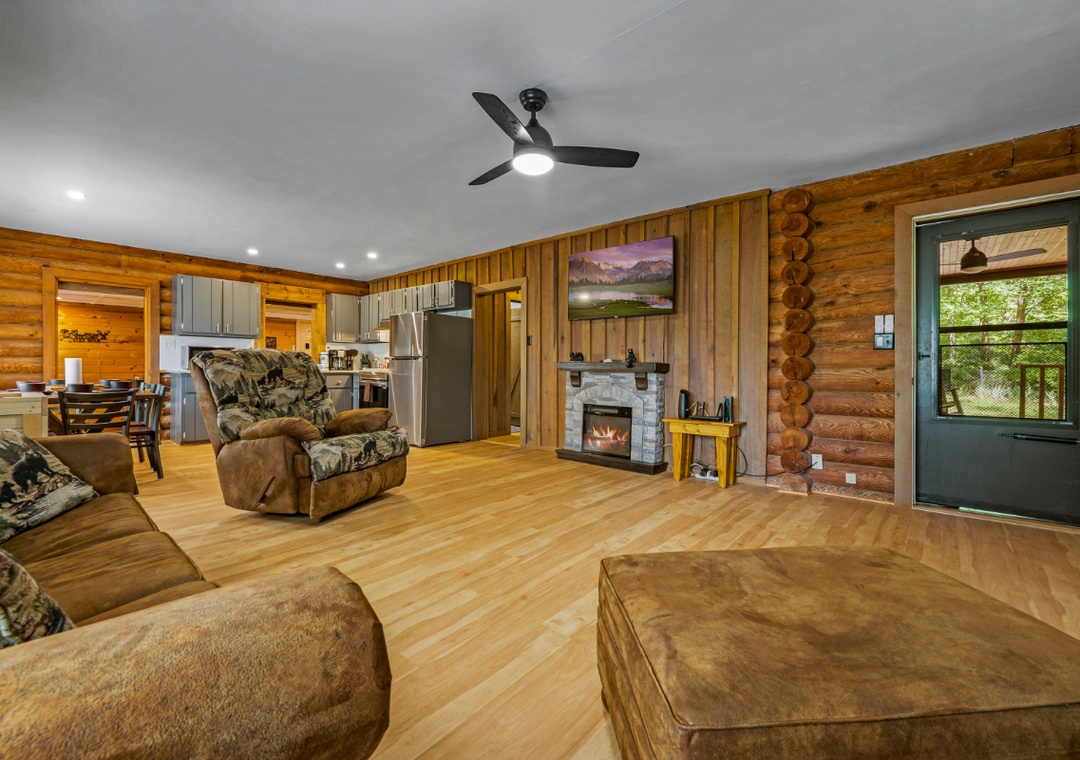 The living room is the heart of the cabin, offering a welcoming space to gather after a day of adventure or simply to enjoy a quiet evening inside. The Google TV and electric fireplace create the perfect atmosphere for movie nights, morning coffee, or long conversations. The open floor plan allows the living room to flow naturally into the dining area and kitchen, making it easy for everyone to stay connected. Just steps away, the game area transforms the cabin into your own private entertainment hub. Also, find both bedrooms that are designed with comfort in mind, offering restful spaces where you can recharge. Free WiFi is also available throughout the property.