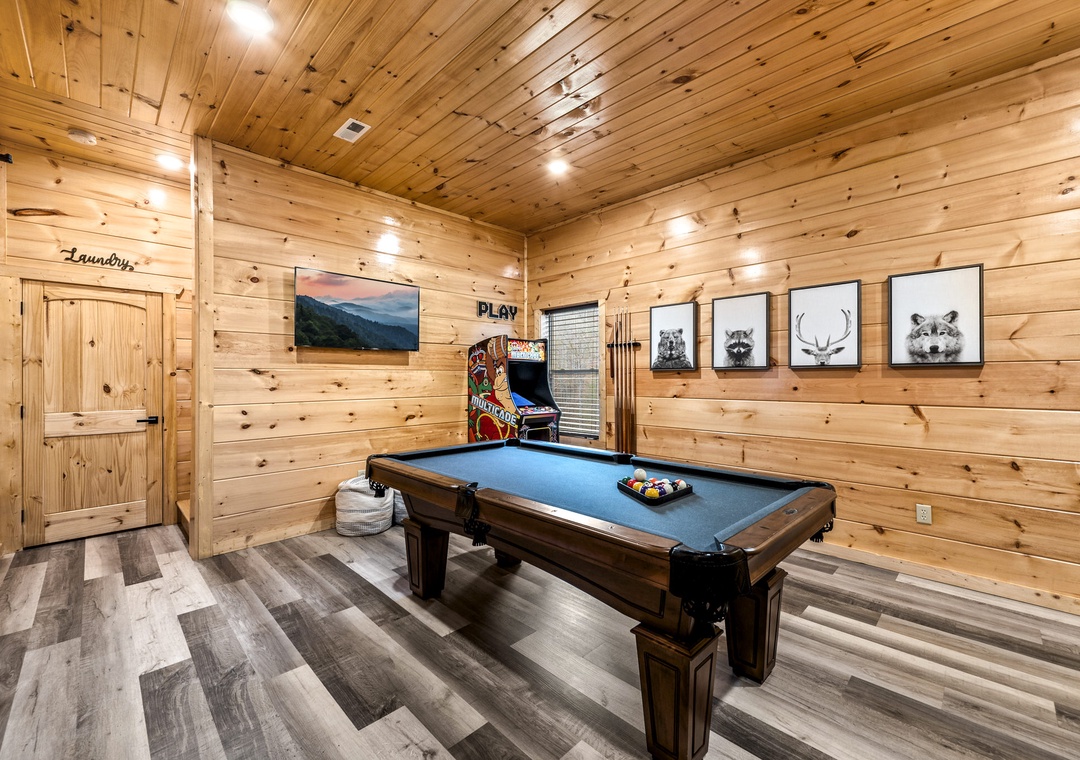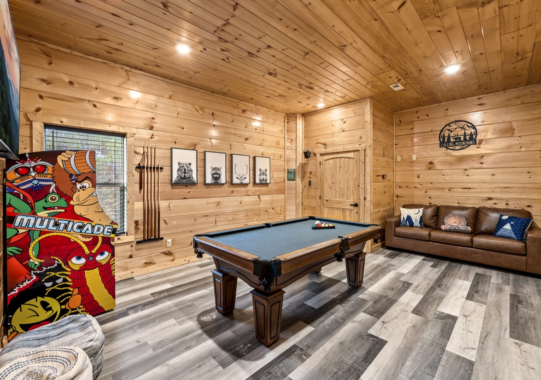 "Calling Mountains," is a haven for relaxation and fun, boasting an array of entertainment options that promise to elevate your vacation experience to new heights. Downstairs, you'll be greeted by a spacious game room, featuring a pool table and arcade, creating the perfect atmosphere for friendly competition and late-night laughs. Next to the game room is the heated indoor pool where you can dip into the refreshing waters, swim beneath the open sky through panoramic windows, or simply relax poolside, soaking in the serene ambiance of your private retreat. And let's not forget the bubbling hot tub, where you can soak away your cares while surrounded by the breathtaking beauty of the Smokies. As the sun sets over the horizon, Step outside onto the spacious deck and take a deep breath of crisp mountain air as you settle into a comfortable chair, letting the soothing sounds of nature wash over you. With its thoughtful layout and abundance of entertainment amenities, "Calling Mountains" ensures that every moment of your stay is filled with laughter, relaxation, and unforgettable memories.