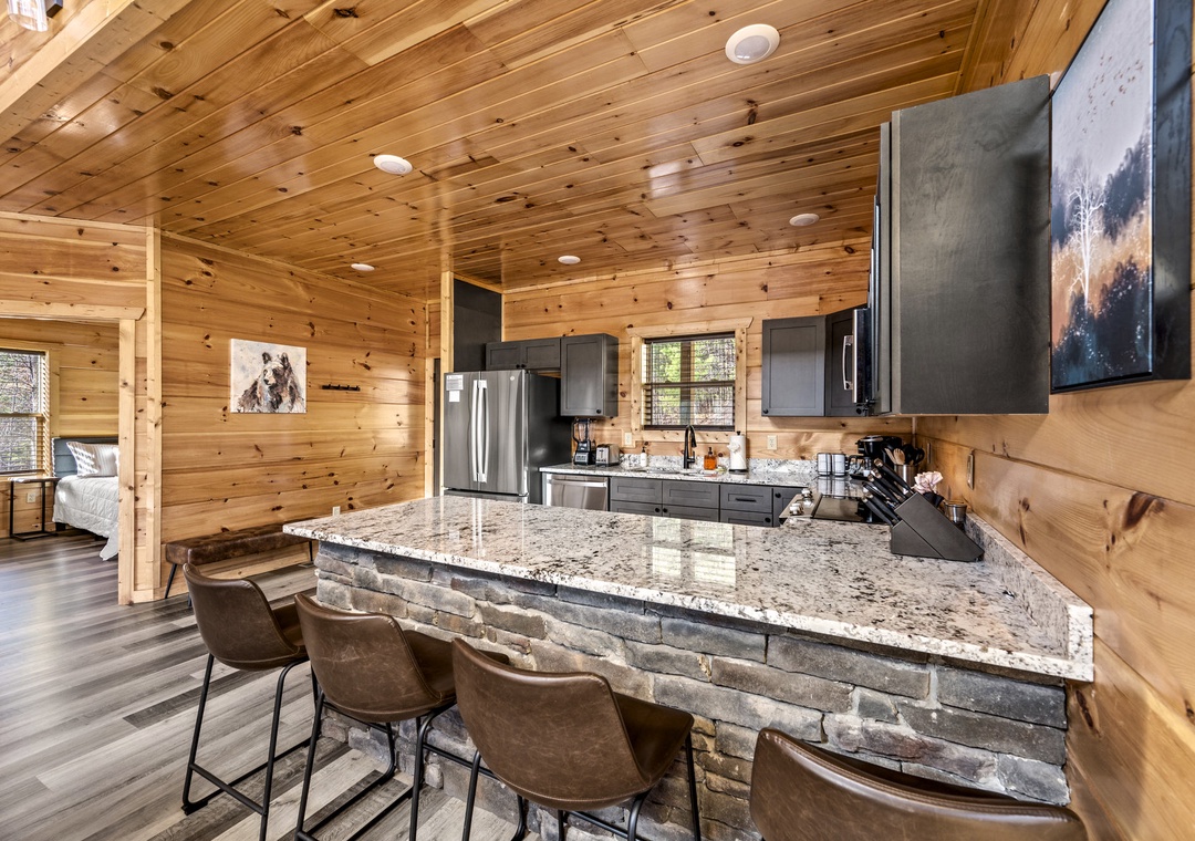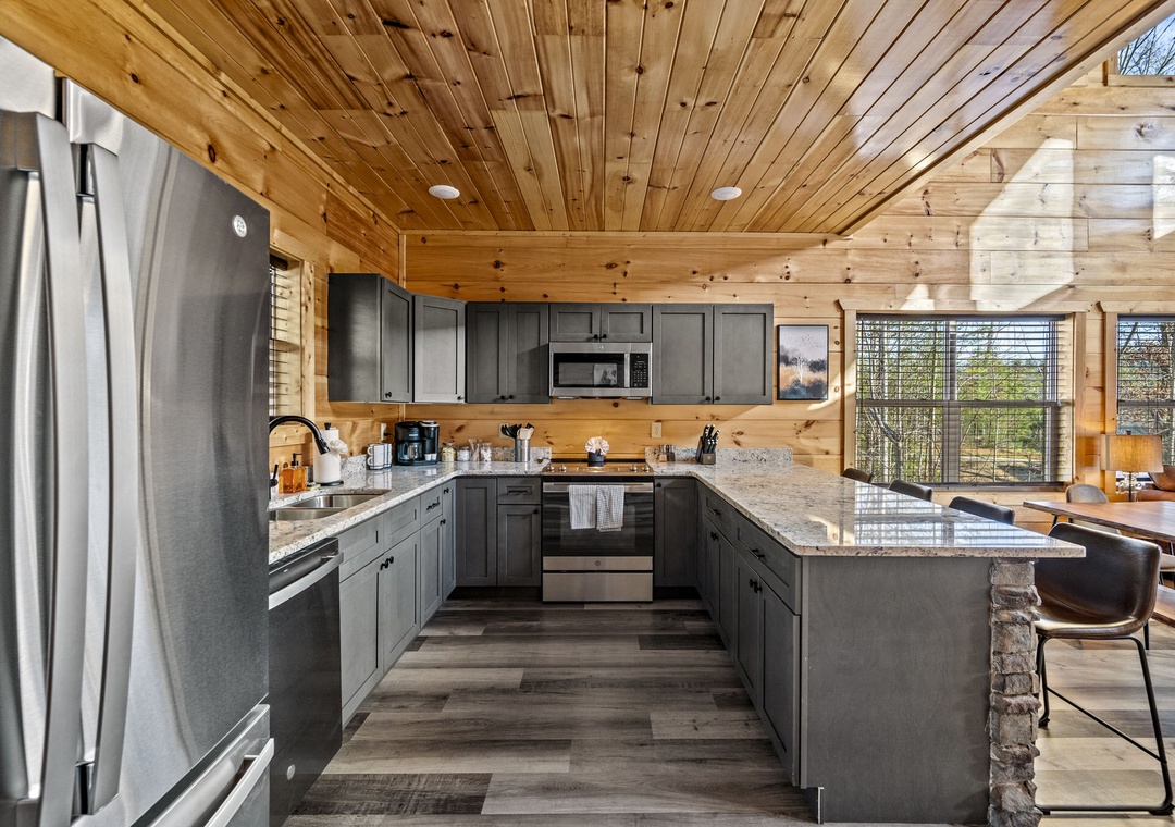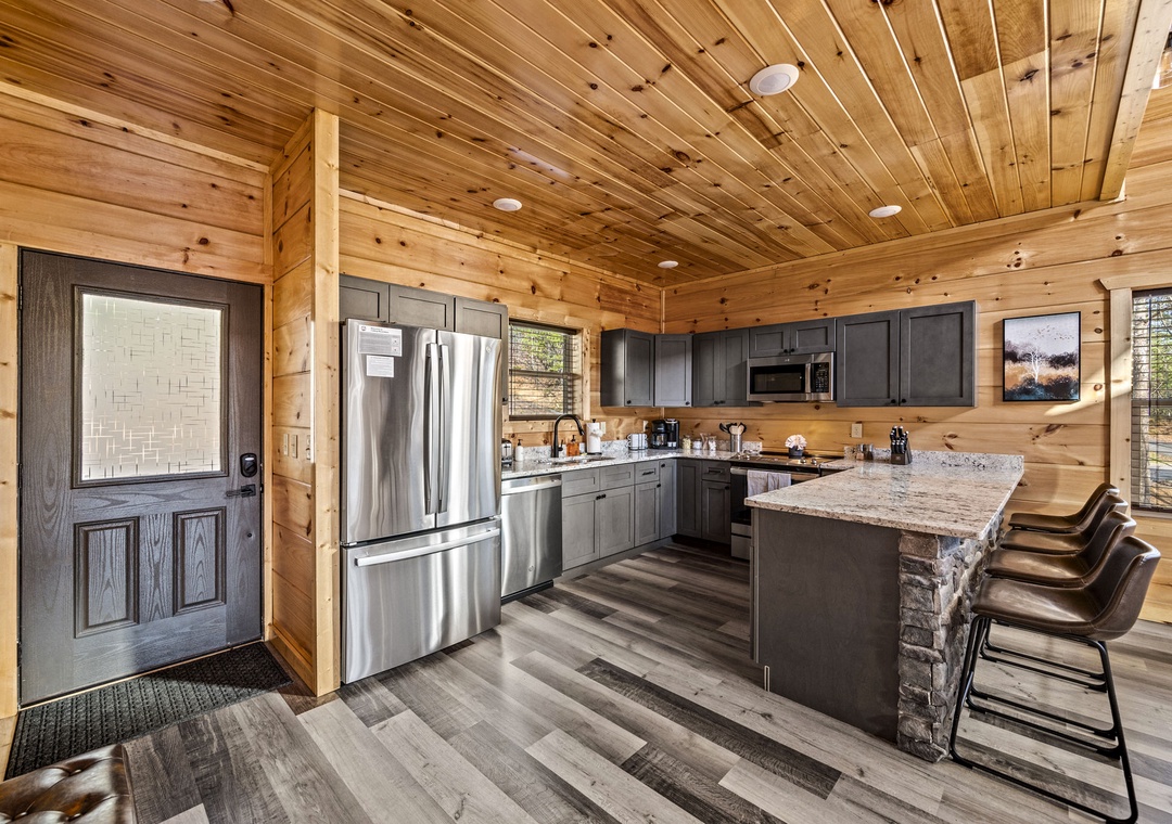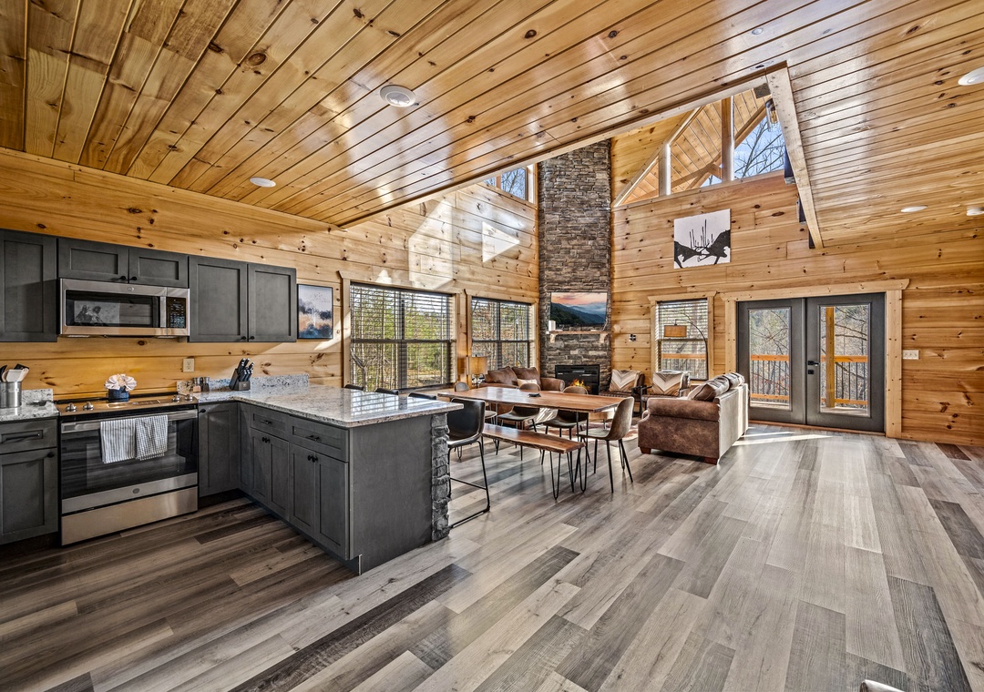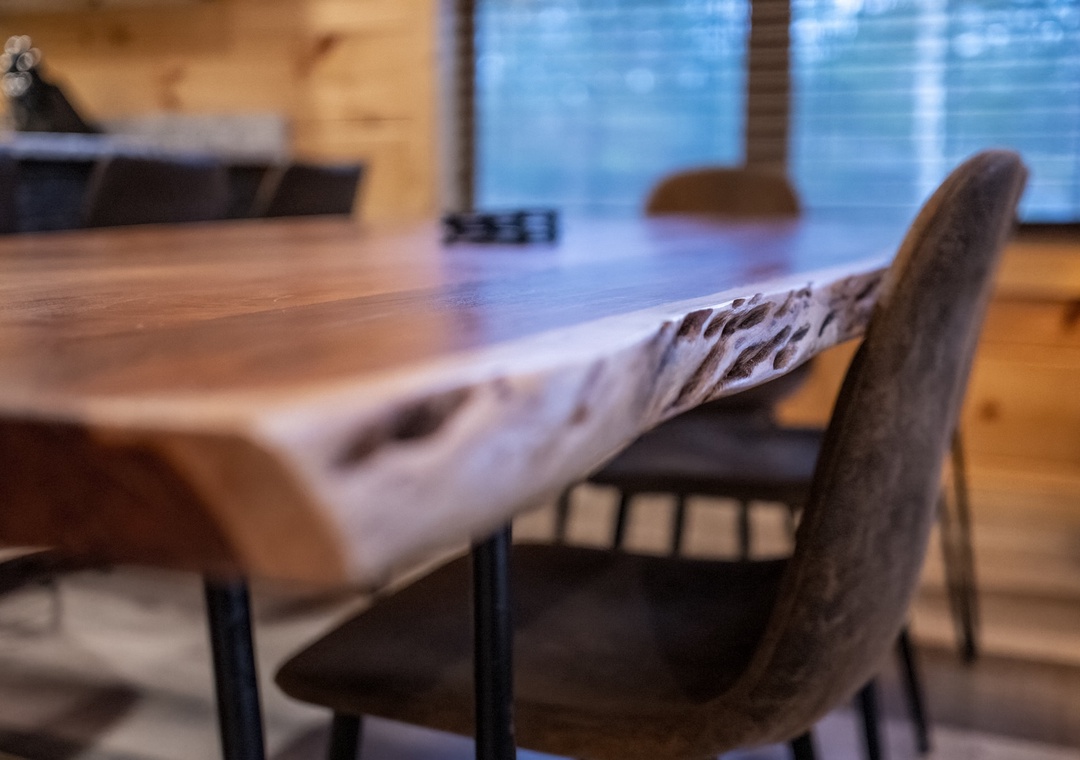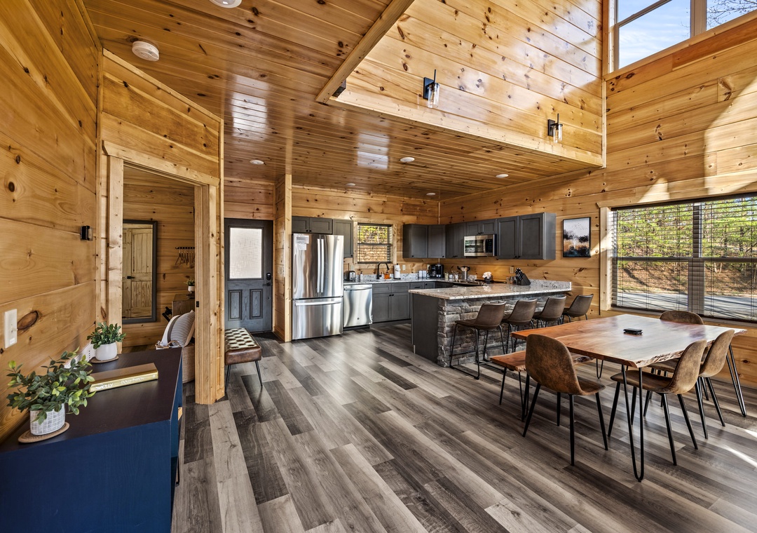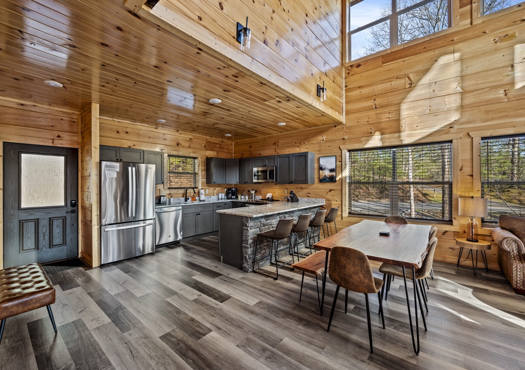 Our cabin features a fully equipped kitchen, where you can channel your inner chef and prepare delicious meals for the family. Well-appointed with a full-sized refrigerator, dishwasher, stove, microwave, and other kitchen appliances perfect for making breakfast, lunch, or dinner throughout your stay! All pots, pans, glasses, plates, silverware, etc. are also there for you! Adjacent to the kitchen, our cozy dining area offers a welcoming space with a large wooden table and comfy chairs, perfect for enjoying family meals or entertaining friends.