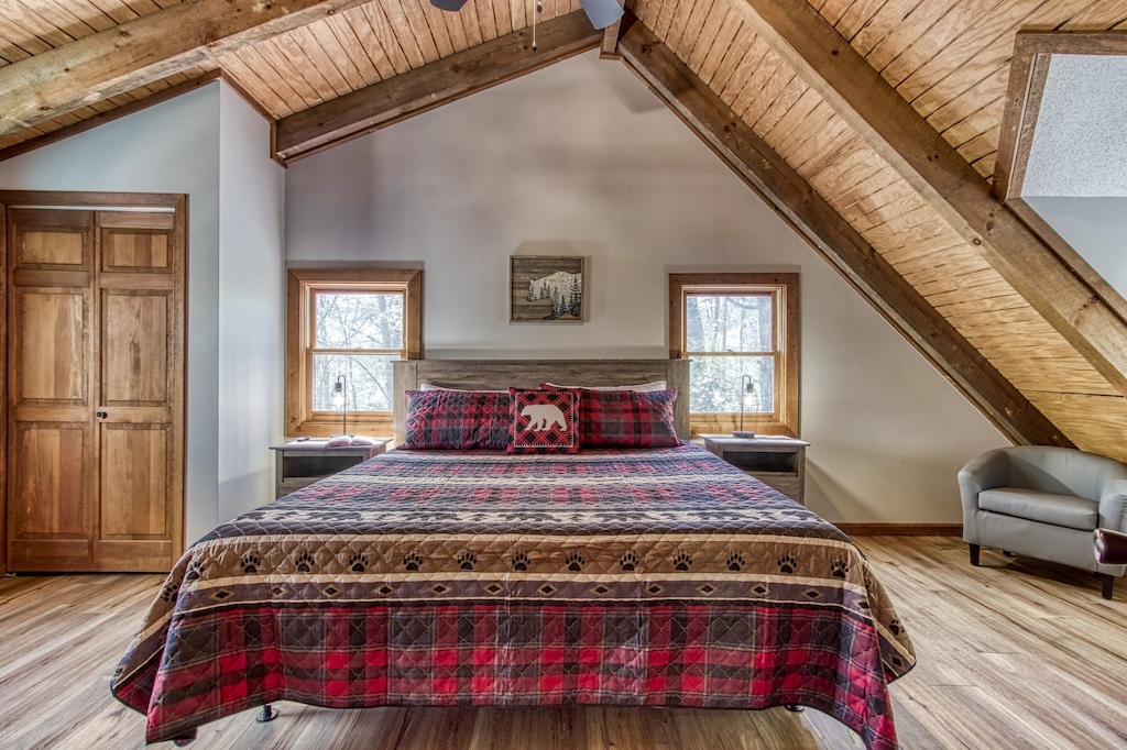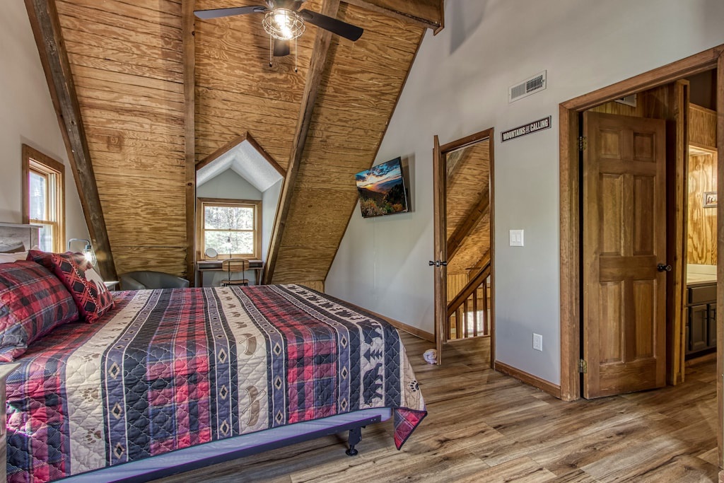 Bedroom #1 (upper level): King-sized bed + TV + private ensuite bathroom