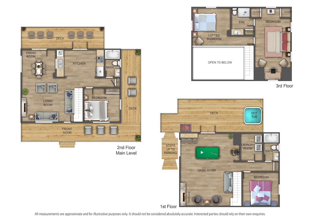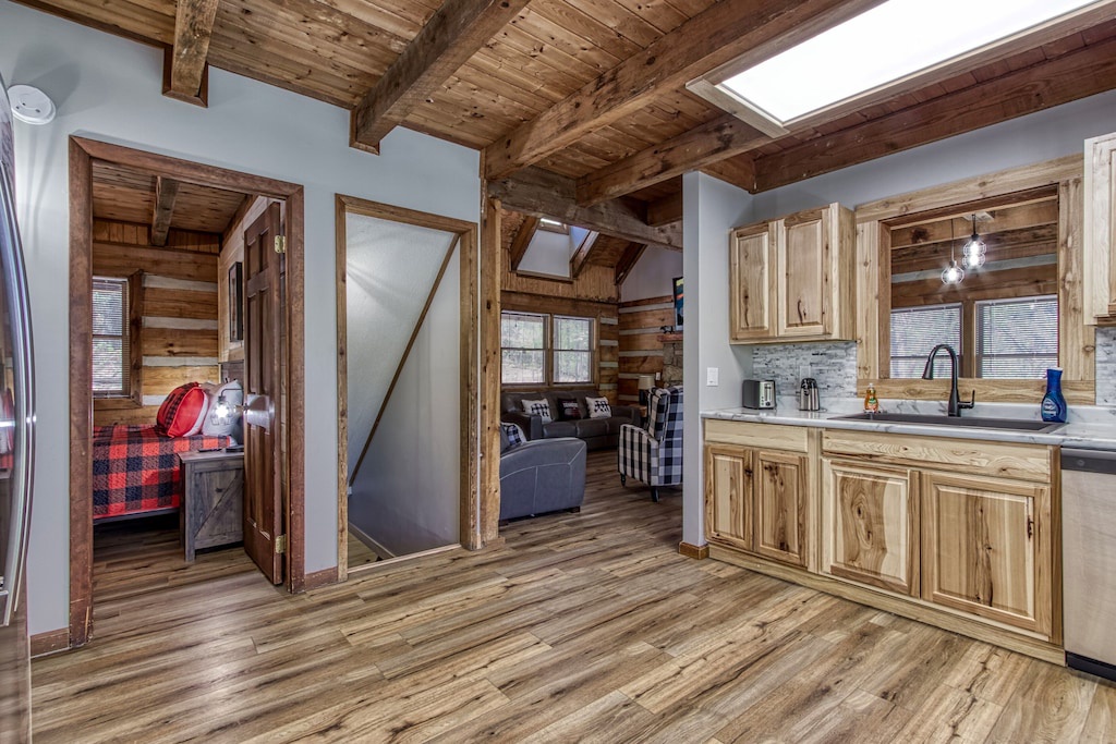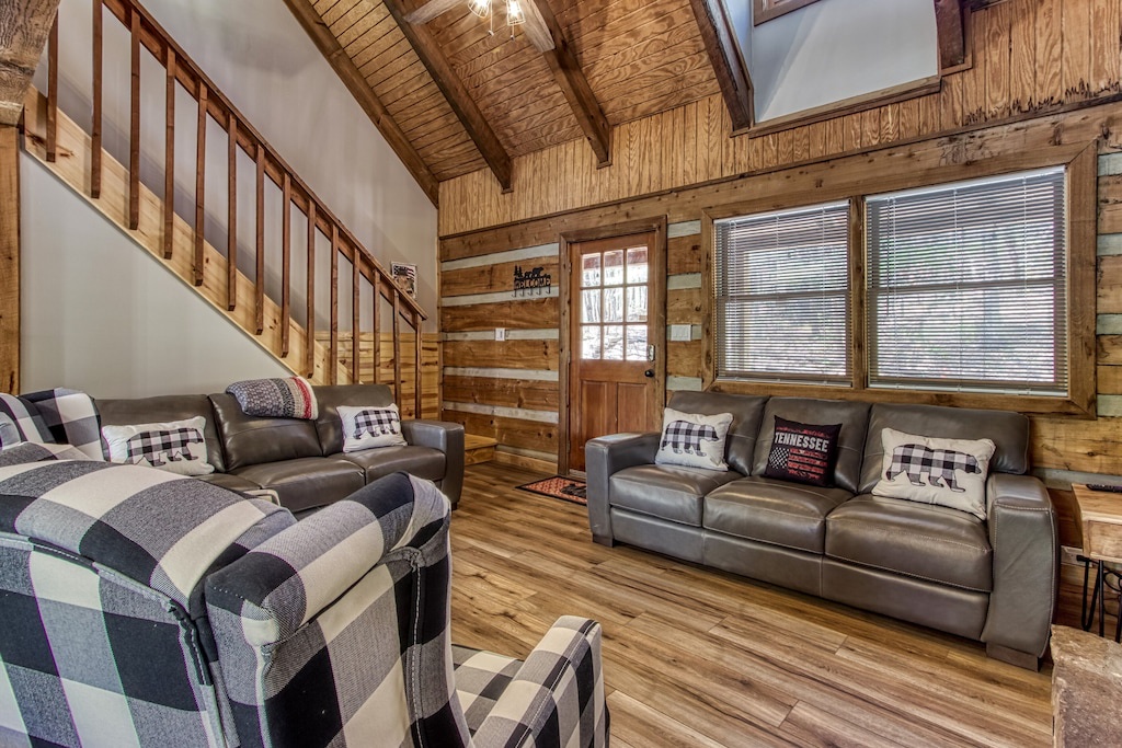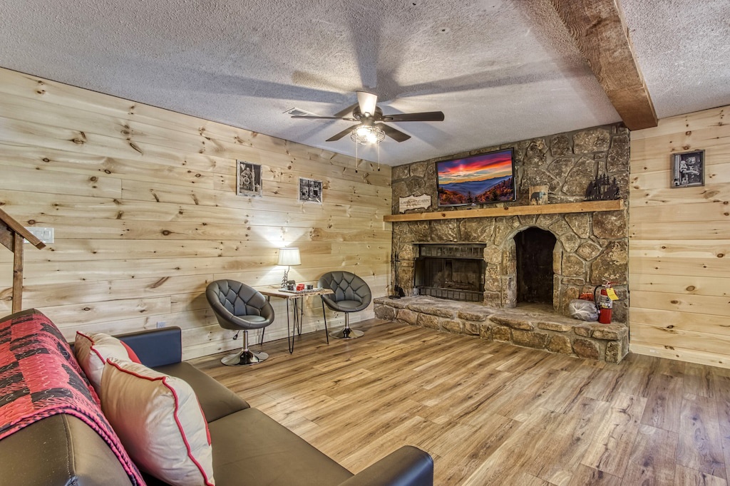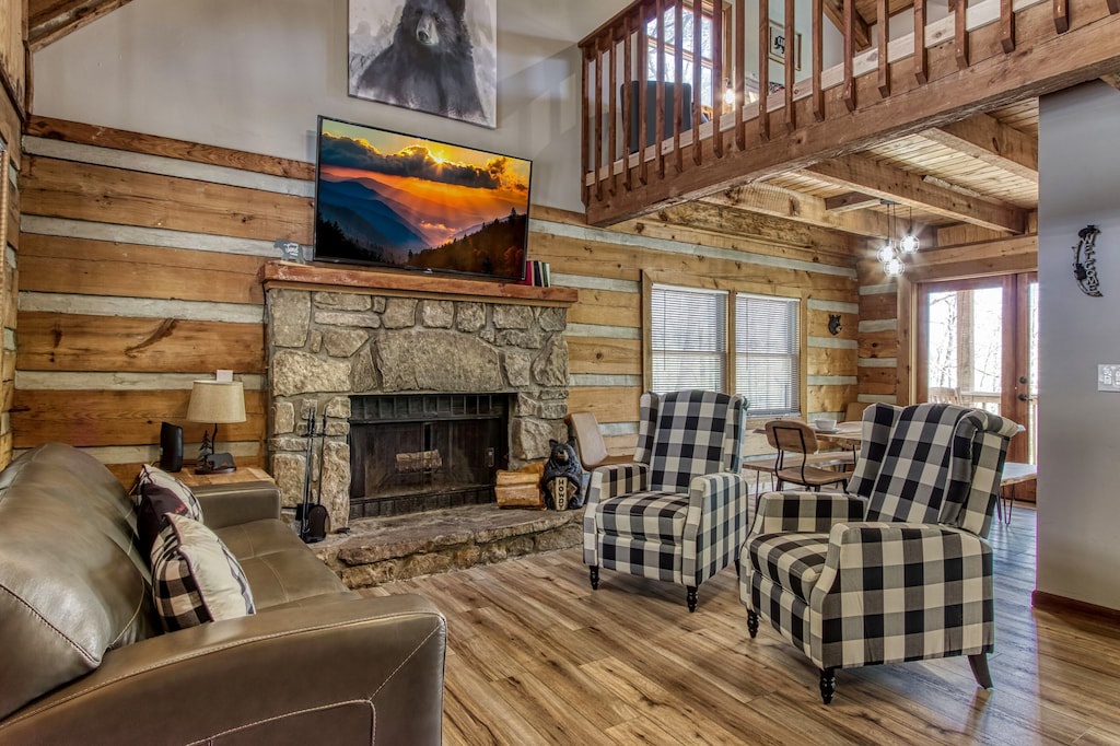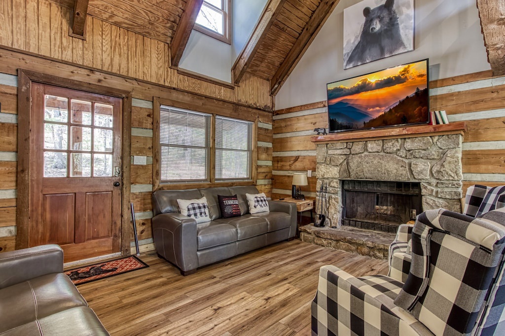 Cozy and fully furnished log cabin with large living room; four bedrooms + 3 baths; additional game room with living space; 2 indoor fireplaces; comfortable leather couches and sitting areas; pool table; arcade; TVs throughout the cabin; free Wi-Fi