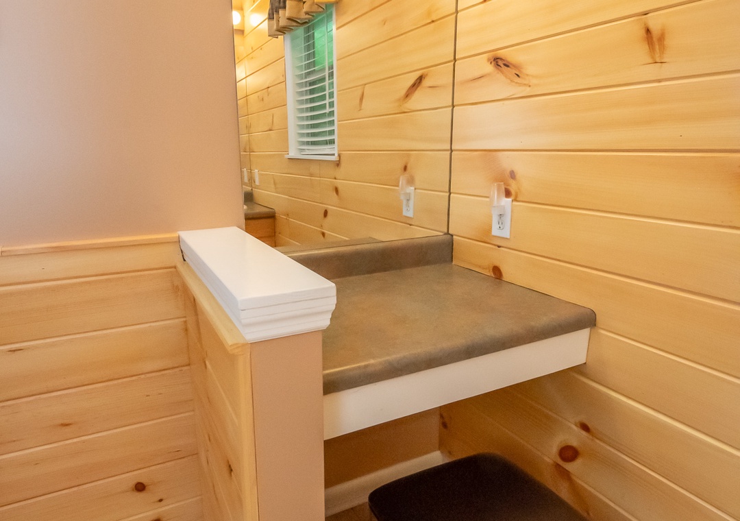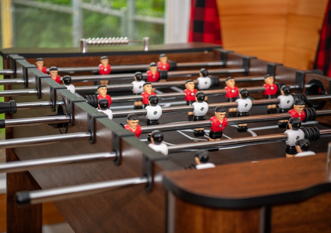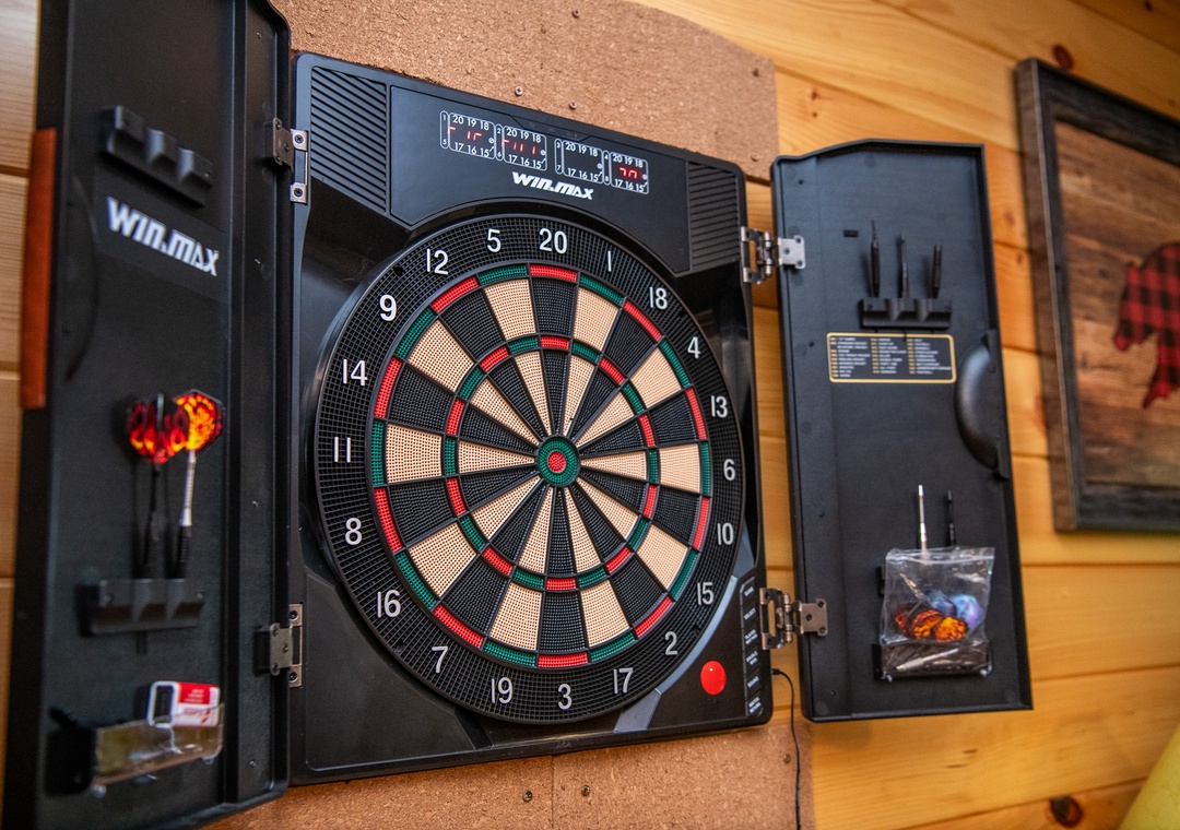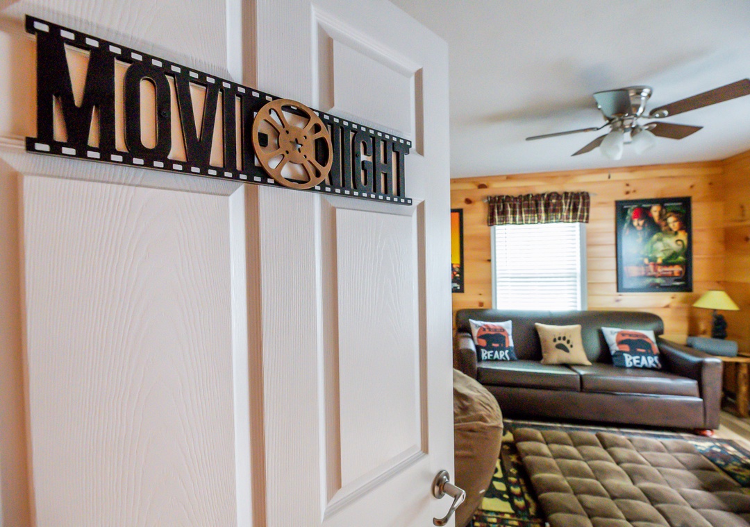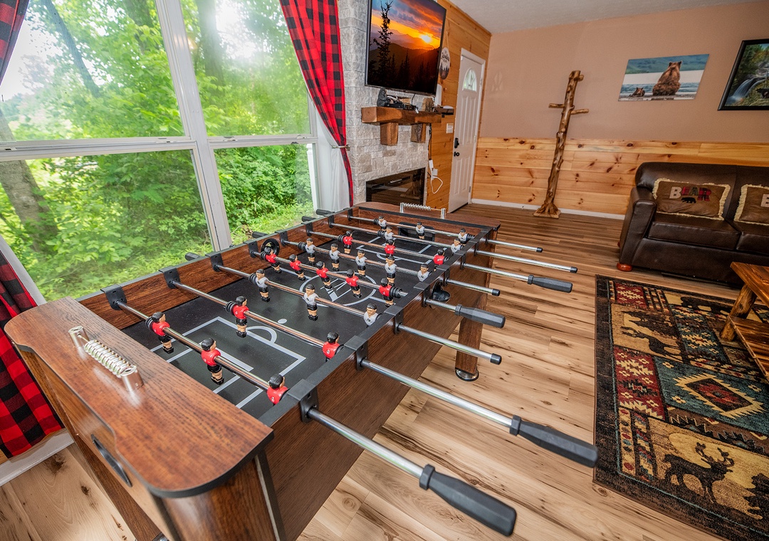 Our cabin is packed with entertainment options to keep you and your guests engaged throughout your stay. Experience movie nights like never before in the dedicated theater room, featuring a massive 75-inch TV and comfortable seating. Whether you’re catching the latest blockbuster or re-watching your favorite classics, this space provides a cinematic experience right at home. The spacious great room is perfect for gathering and relaxing. With cozy seating, an electric fireplace, and another large TV, it’s an ideal spot to unwind, chat, or enjoy game nights. It also has a Foosball table and darts for friendly competitions. Step outside into the fresh mountain air and discover even more entertainment options. Gather around the wood-burning fire pit under the stars and share stories and laughter with your loved ones or challenge your friends to a game of cornhole – a favorite pastime for guests of all ages. And for the ultimate in relaxation, indulge in the hot tub on the covered deck. Sink into the bubbling waters and let your cares melt away as you take in the breathtaking views of the Smoky Mountains.