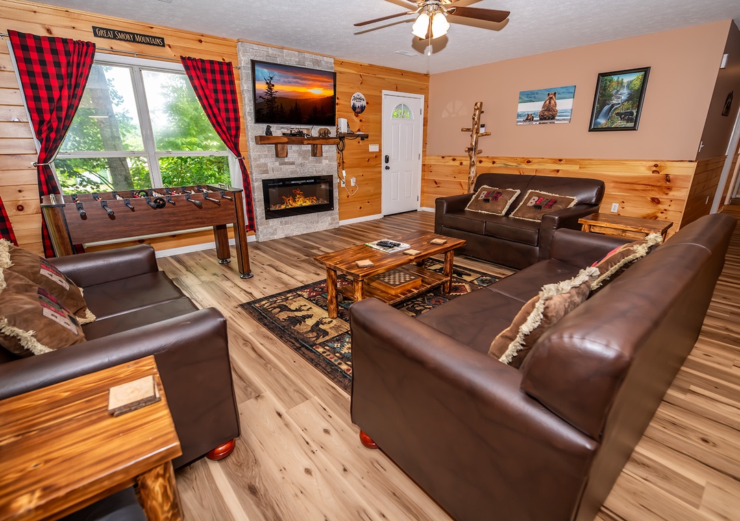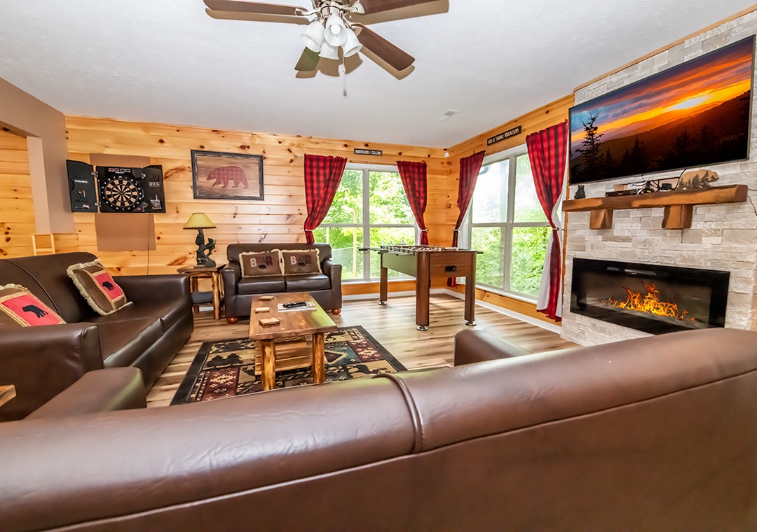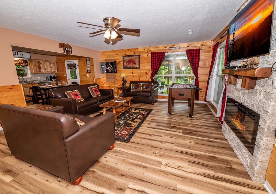 Step into the spacious great room, where rustic charm meets modern elegance. This inviting space features a plush seating area perfect for gathering with family and friends. The centerpiece is an electric fireplace that adds a cozy ambiance, ideal for relaxing after a day of mountain adventures. Ceiling fans keep the room cool and comfortable, while large windows flood the space with natural light and offer stunning views of the surrounding forest. Adjacent to the great room, the fully equipped kitchen awaits, boasting stainless steel appliances, ample counter space, and all the tools and utensils you need to whip up delicious meals. When it's time for indoor fun, challenge friends and family to a friendly game of foosball or darts, or retreat to the theater room for an immersive movie-watching experience on the impressive 75-inch screen. Free WiFi is also available throughout the property.