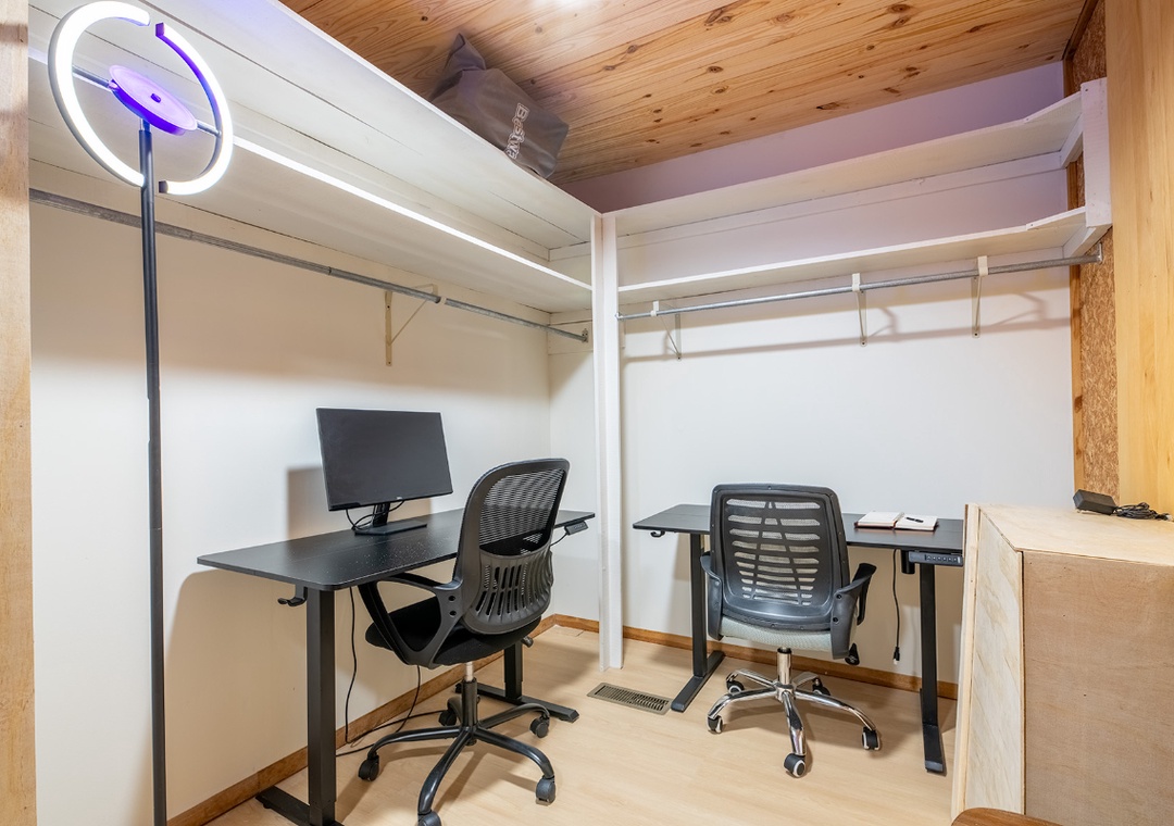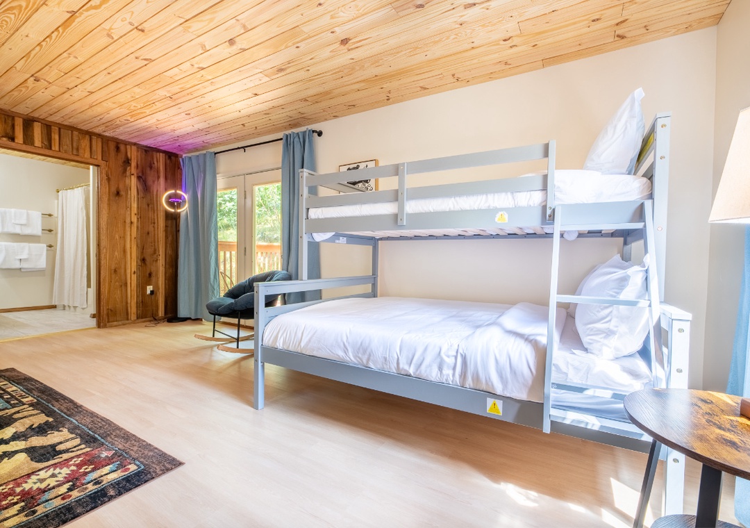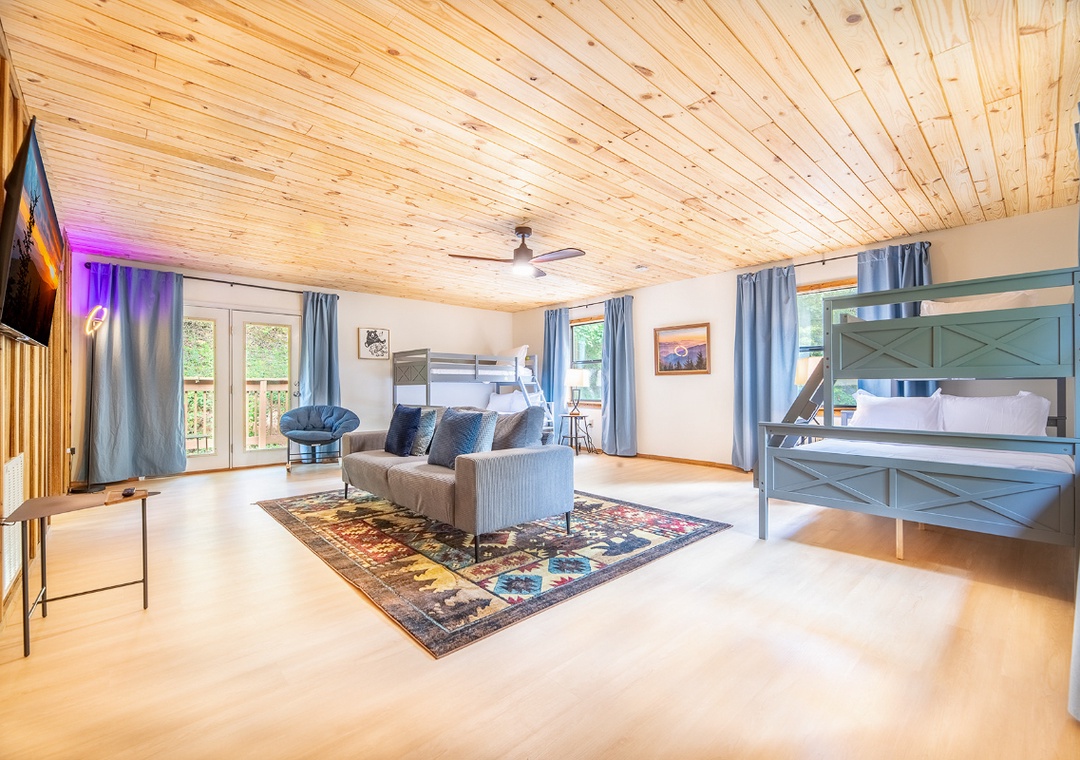 ✔ Bedroom 4 (Loft): Expansive space with two Twin-over-Full bunk beds, seating area with Roku TV, full bathroom (shower/tub combo), private balcony, large windows, and a dedicated office nook with desk for those who need to check in with work.