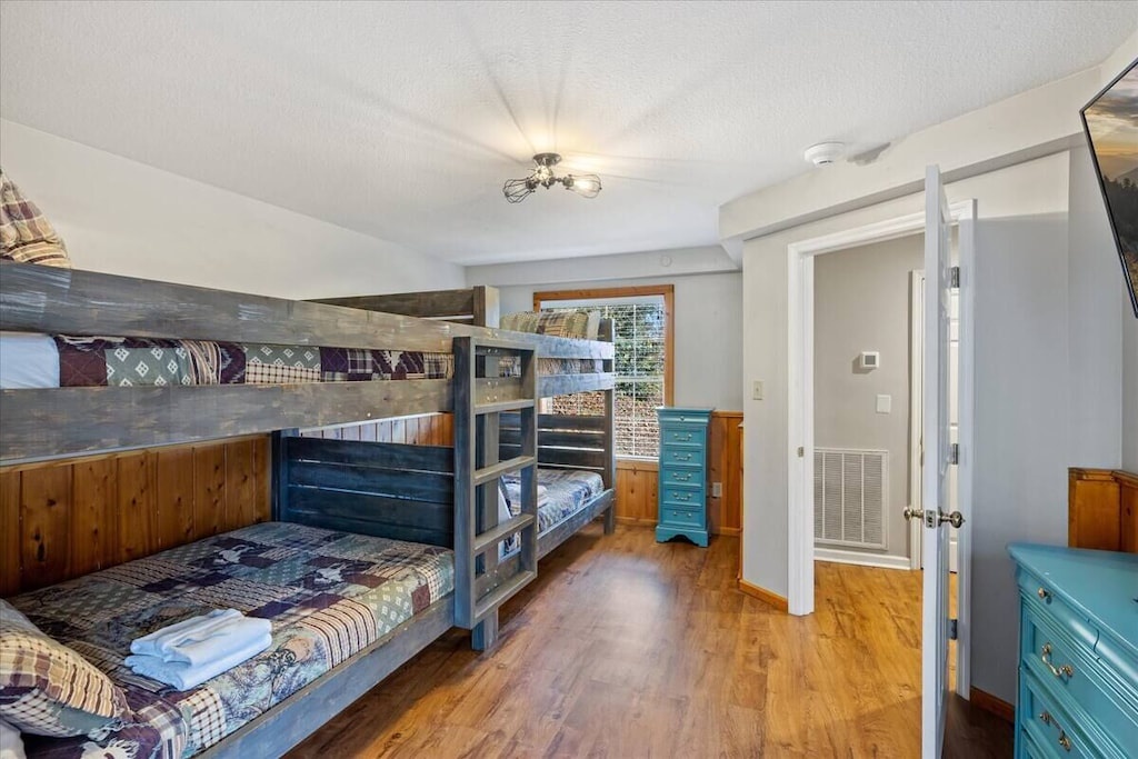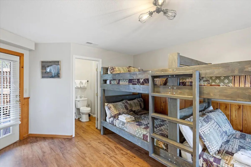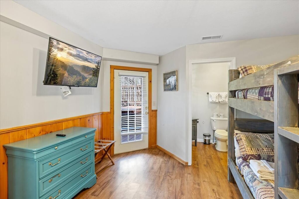 Bedroom #4: Spacious bunk-room with 2 sets of Full Bunk-Beds, flat screen TV and access to patio with Hot Tub; Perfect room for the kiddos or groups alike! Attached private bathroom