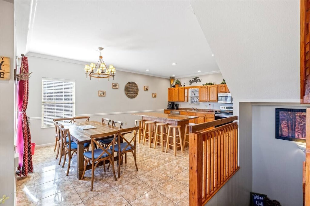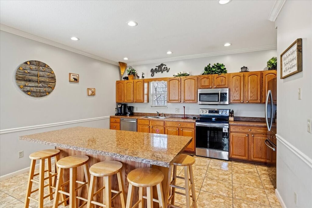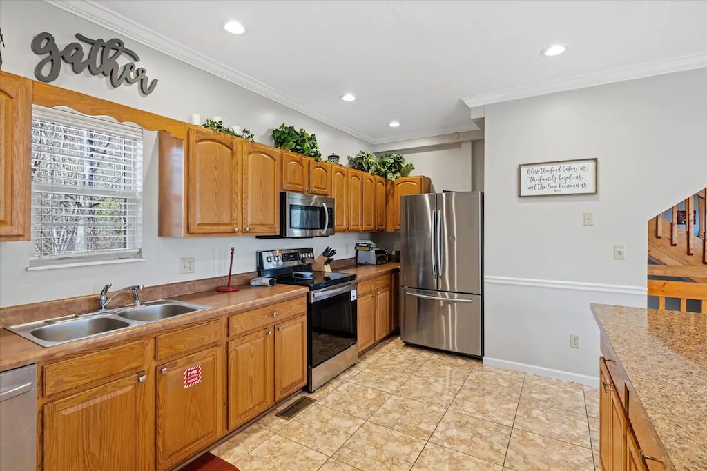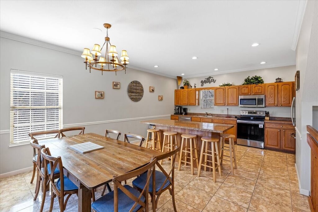 Fully equipped, open kitchen with modern stainless-steel appliances, full sized refrigerator, dishwasher, stove, microwave, and other kitchen appliances perfect for making breakfast, lunch or dinner throughout your stay! All pots, pans, glasses, plates, silverware, etc. are also there for you! There is a gorgeous wooden dining room table right off the kitchen, along with additional seating at the kitchen island, perfect for your entire family or group to dine and gather together.
