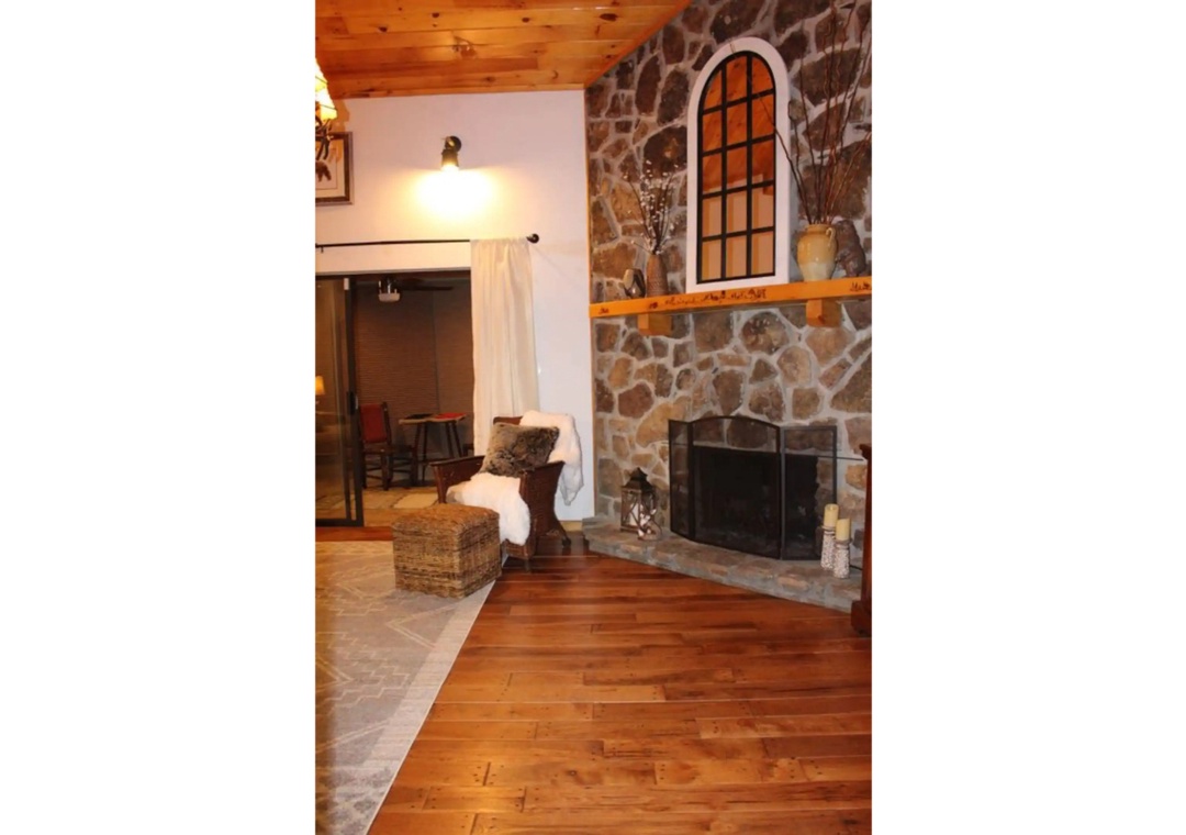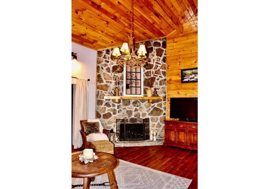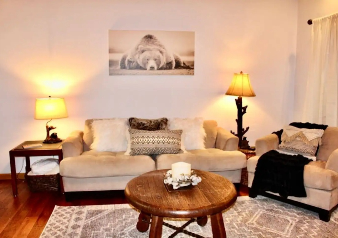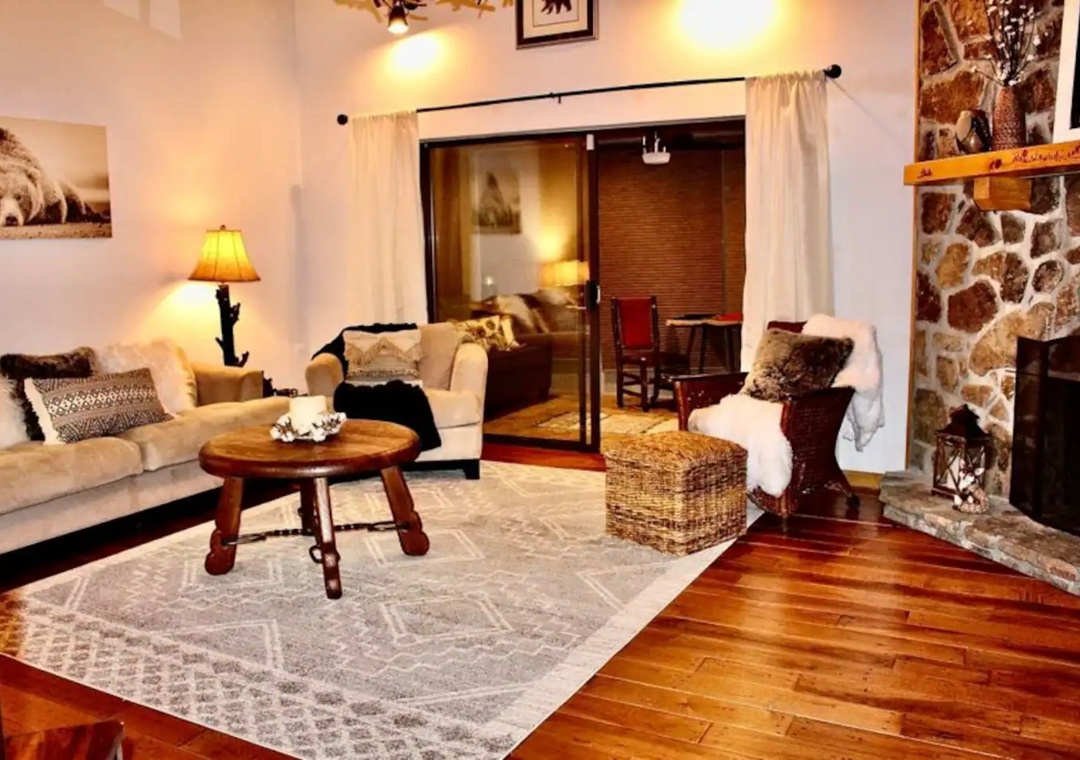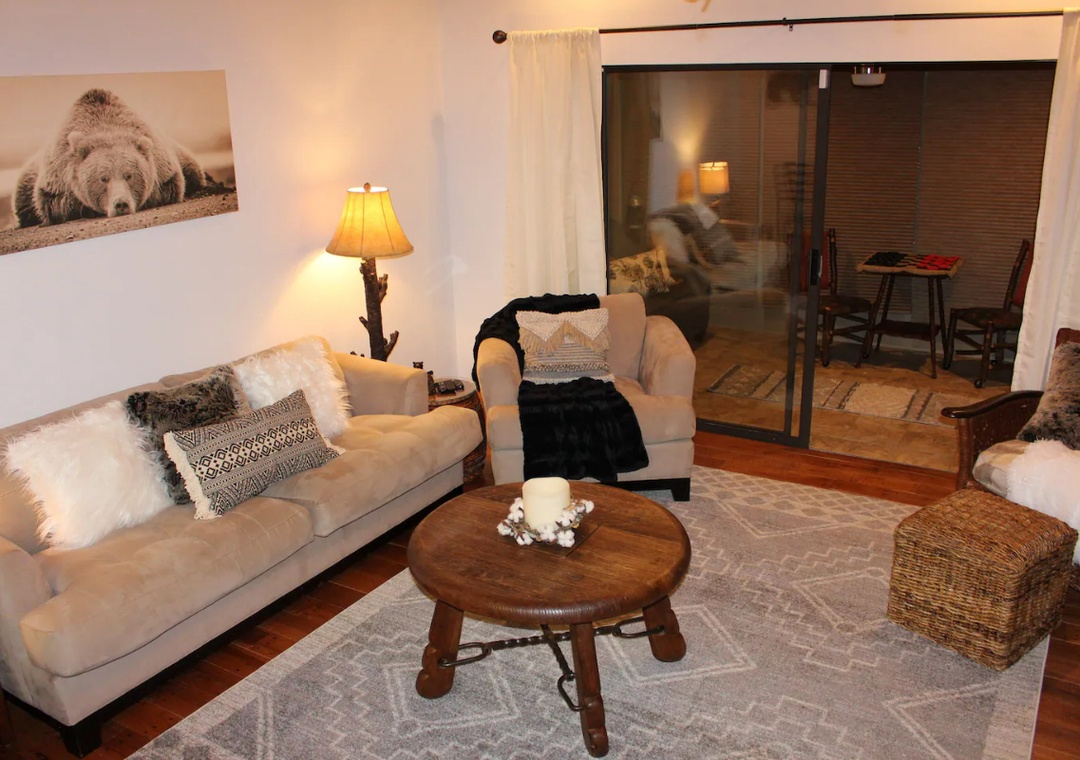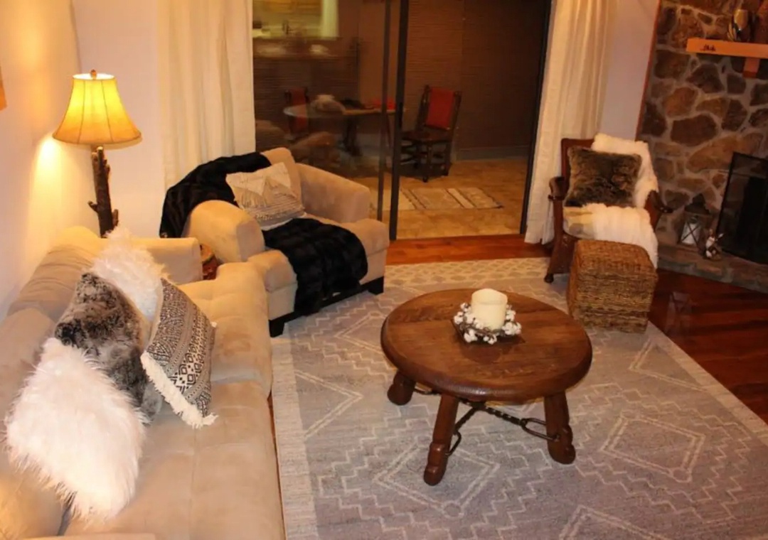Fully furnished mountain condo with modern and rustic decor; Spacious living room with large stone fireplace, perfect for cozy nights; Comfortable sleeper sofas in the living room; Screened porch