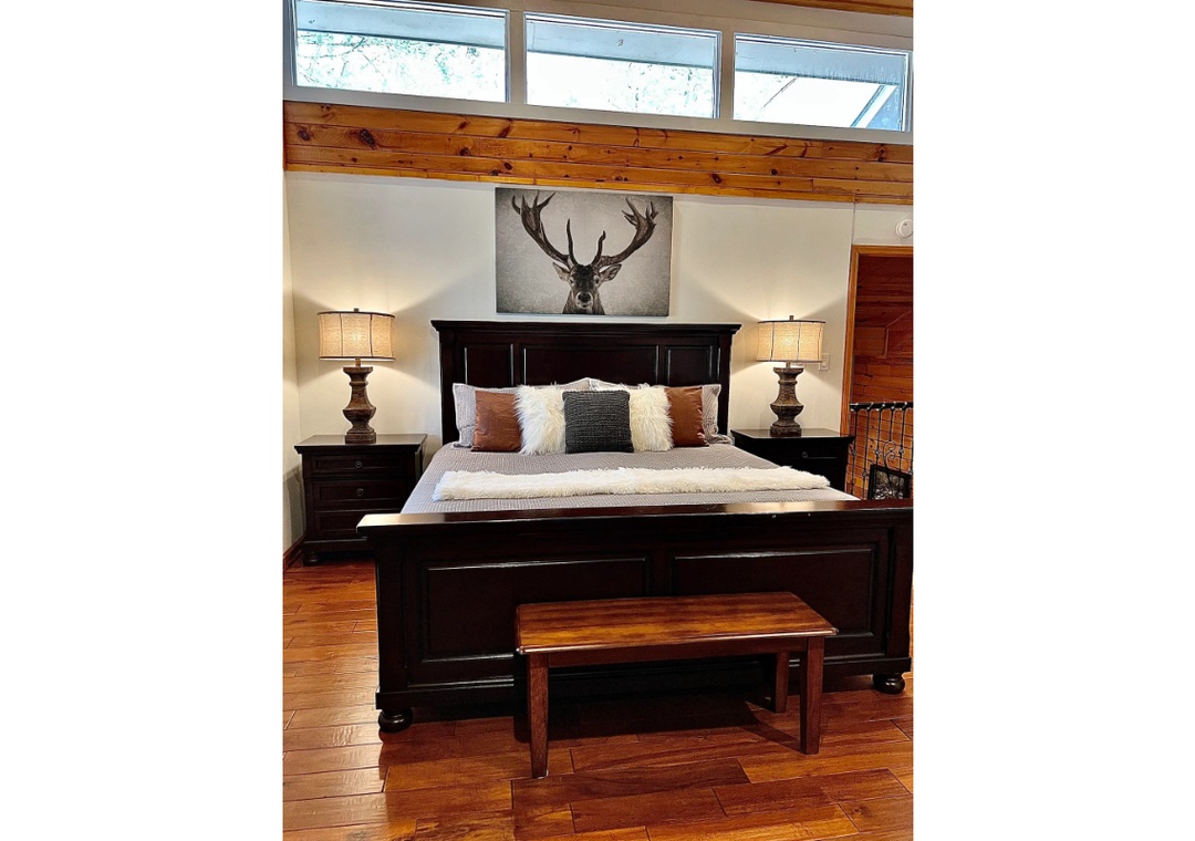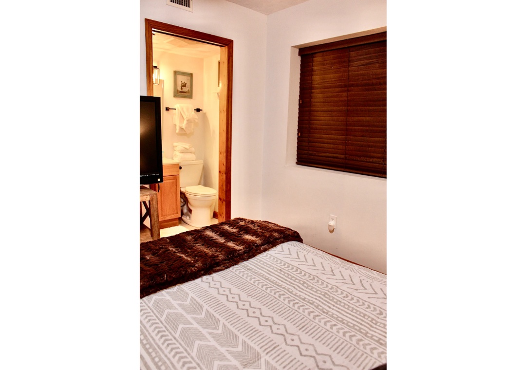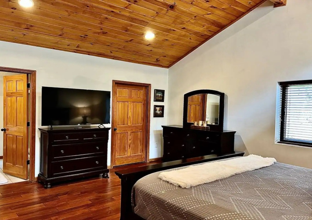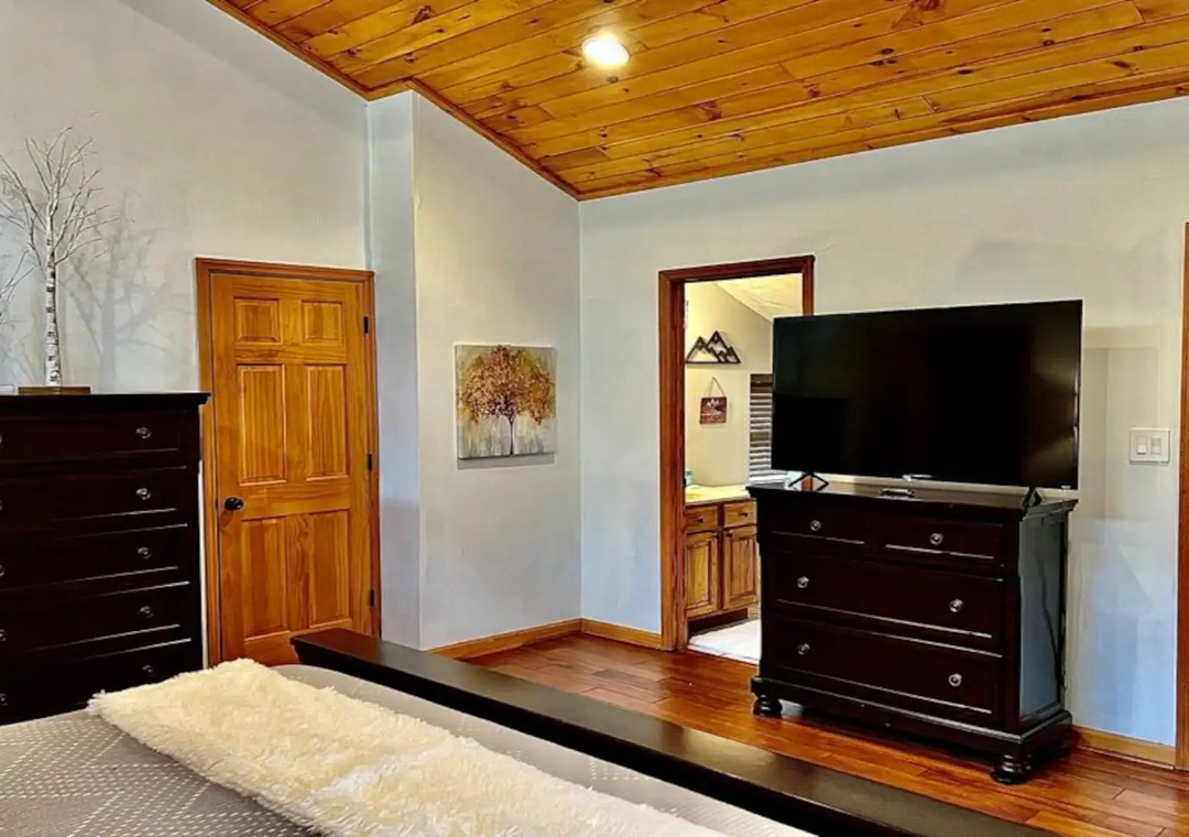 Bedroom #1: King-sized bed; Spacious and open bedroom with attached full bath; Large TV; Plenty of storage and dresser space; Wood floors