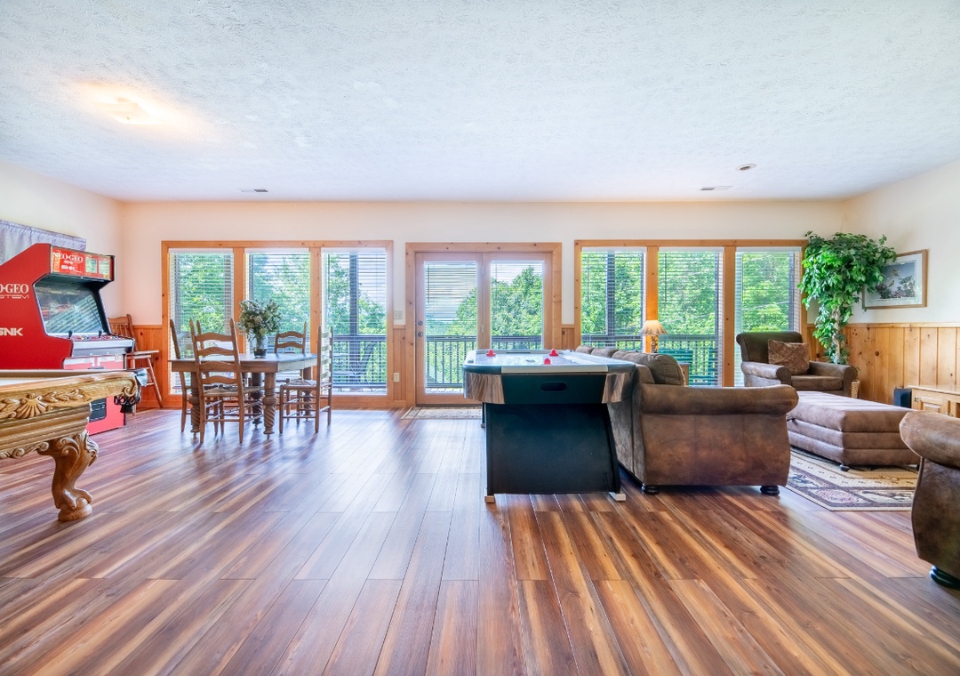 Start in the living area featuring a rustic wood-burning fireplace that sets the scene for cozy evenings after a day outdoors. Kick back on the comfortable seating and fire up the 40” Smart TV with DVD player, perfect for streaming your favorite series or popping in a classic movie for a relaxing night in. Downstairs in the game room, an air hockey table invites fast-paced fun and friendly competition. Nearby, a pool table offers hours of fun for beginners and experienced players alike. For those craving a bit of nostalgia, the arcade game brings a retro vibe with timeless favorites sure to spark joy and maybe even a little healthy rivalry. If kicking back and watching the big screen is more your style, the 65” Smart TV in the game room delivers a true cinematic experience. Step onto the front deck and you’ll find a bubbling hot tub waiting to melt your stress away. It’s the perfect way to relax sore muscles after a long hike or wind down in the evenings under the stars. Just around the corner on the side deck, fire up the propane grill and get dinner sizzling while friends gather around the al fresco dining area. Also, thanks to its location just minutes from Pigeon Forge, “Change of Attitude” gives you quick access to some of the best attractions in the Smoky Mountains. Explore Dollywood, catch a dinner show, ride a mountain coaster, or spend the day shopping and dining downtown without straying far from your mountain hideaway.