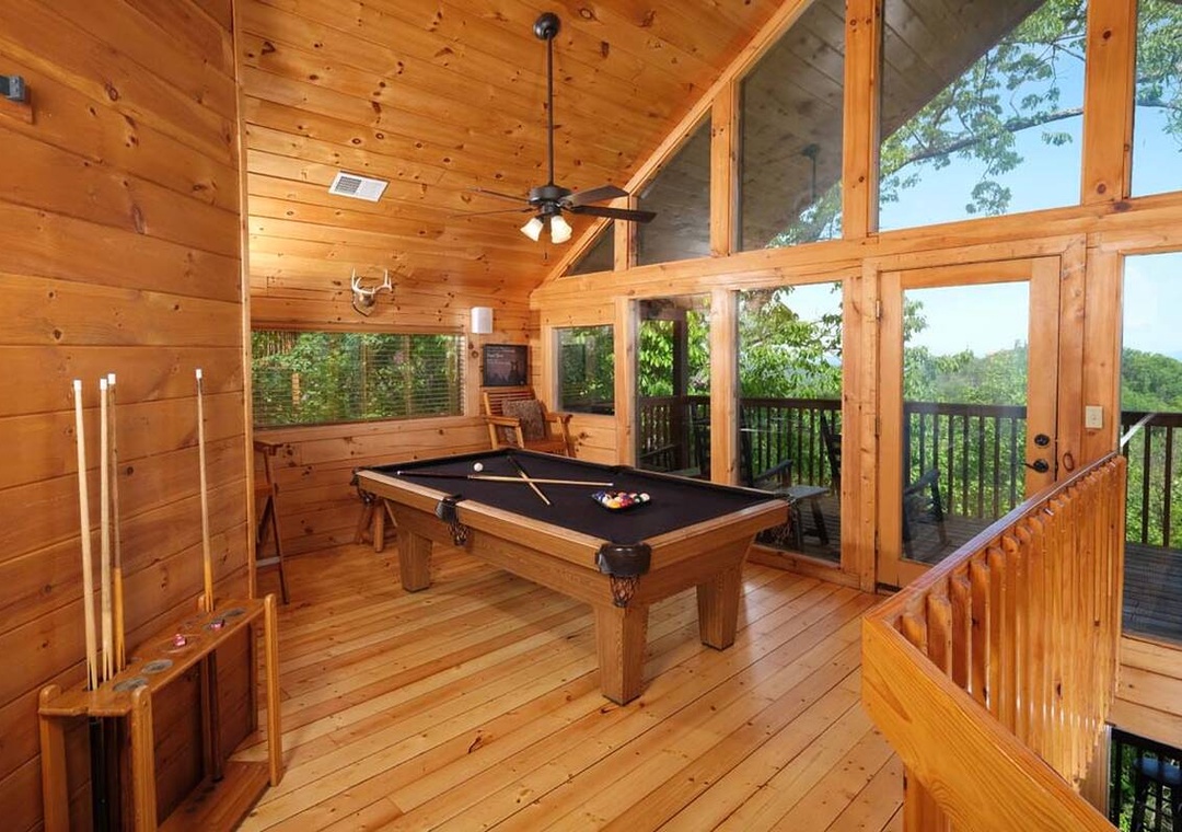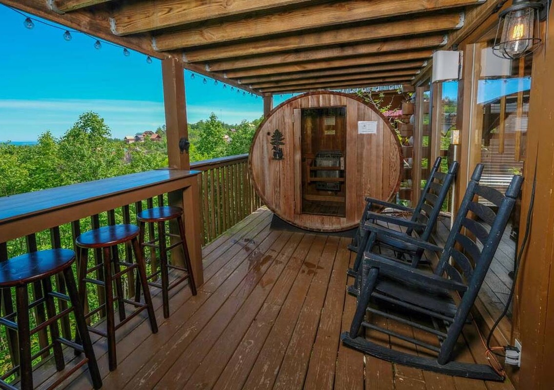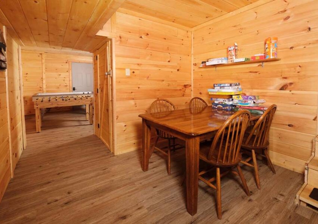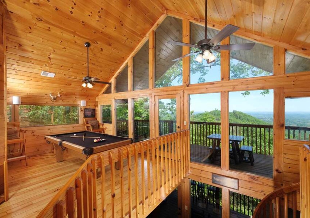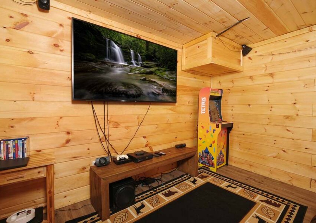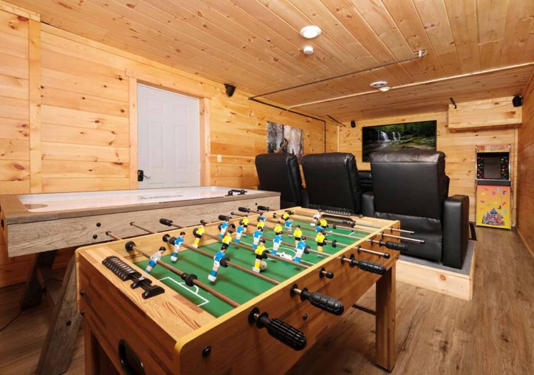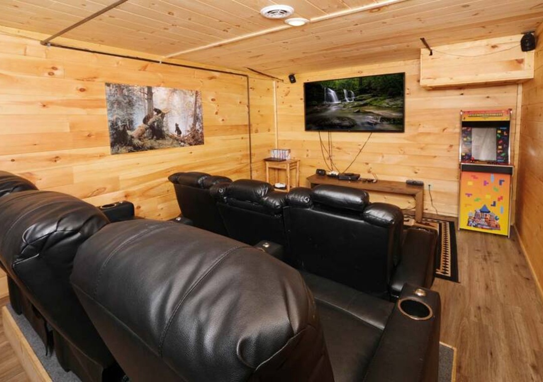 Our cabin is the perfect retreat for both outdoor and indoor fun! Featuring a roomy loft with cathedral ceilings and expansive windows where you can enjoy a game of pool while taking in the scenic views. Meanwhile, in the downstairs game room, ensure endless fun with foosball, air hockey, an arcade, and an Xbox 360. In addition, the in-cabin movie theater offers hours of movie entertainment with its plush theater-style seats and a 70” flat-screen TV. There are also board games and a separate space with a table for four to ensure that there's never a dull moment during your stay. Step outside onto the deck and you’ll know that Chubby Bear goes beyond the usual with a relaxing hot tub and a personal sauna for the ultimate relaxation. As part of the Eagle Crest community, you’ll also have access to a seasonal pool just half a mile from the cabin. Bring your bathing suits and pool toys for a refreshing dip. And as the day comes to an end, kick back in one of the outdoor seating areas on the deck and take in the gorgeous views while you sip moonshine or your evening glass of wine. Discover the perfect blend of comfort, entertainment, and natural beauty at Chubby Bear—a haven in the Smoky Mountains for an unforgettable mountain retreat!