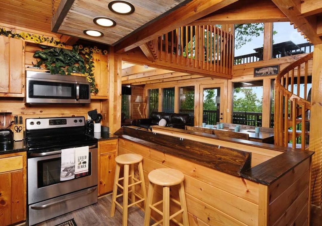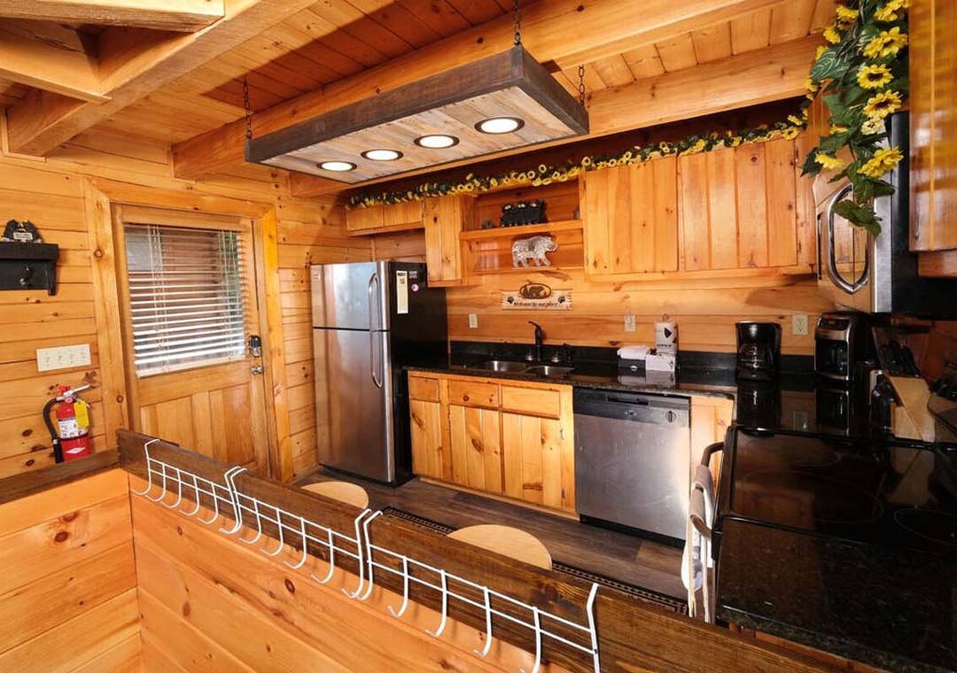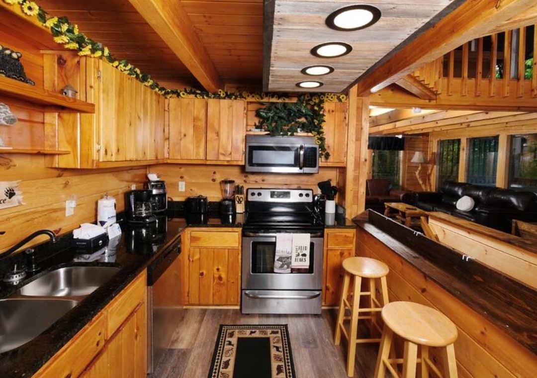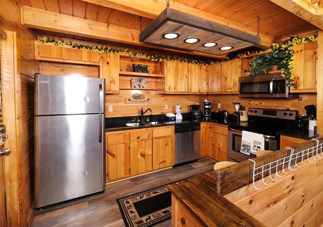 Chubby Bear's galley kitchen is a chef's delight, equipped with stainless steel appliances and granite countertops. Fully equipped with a full-sized refrigerator, dishwasher, stove, microwave, and other kitchen appliances perfect for making breakfast, lunch, or dinner throughout your stay! All pots, pans, glasses, plates, silverware, etc. are also there for you! There is a large wooden dining room table right off the kitchen, perfect for gathering to enjoy a meal while gazing out at the incredible mountain views.
