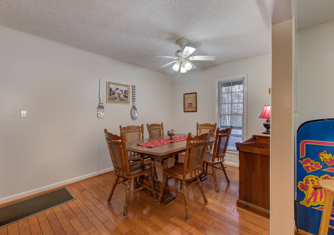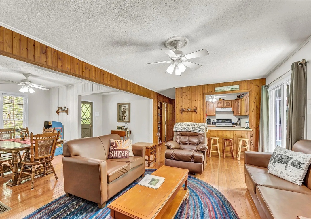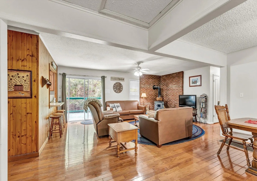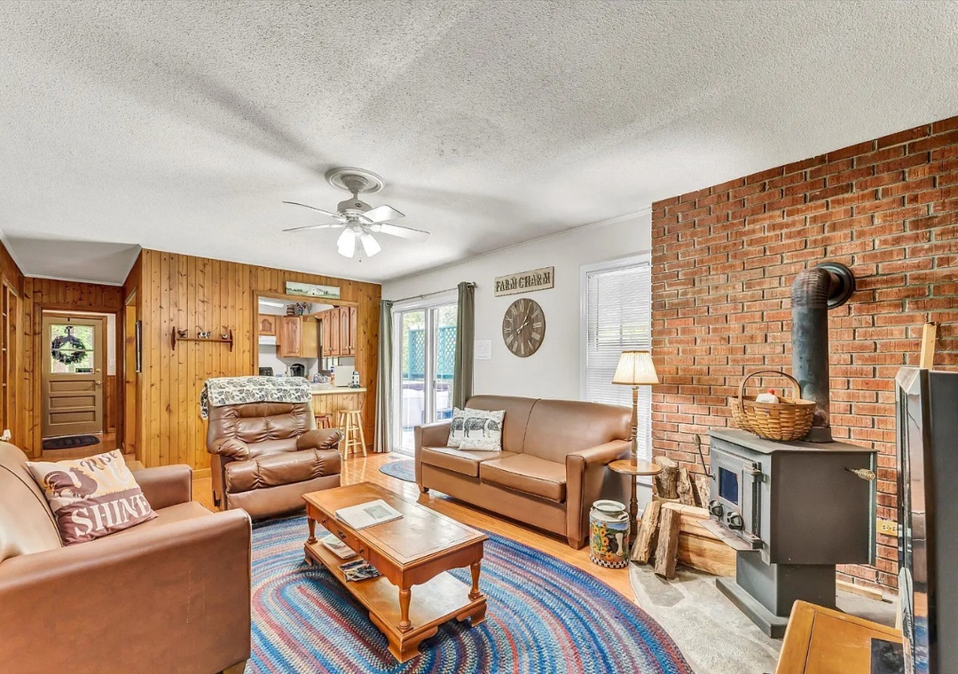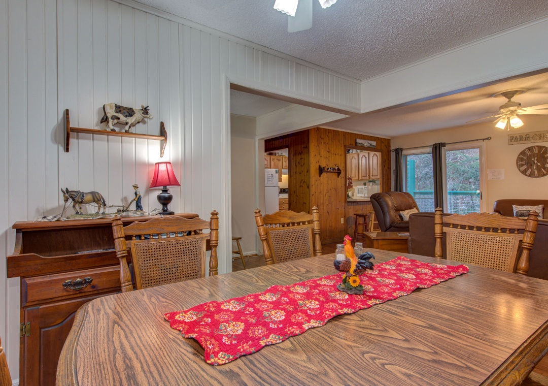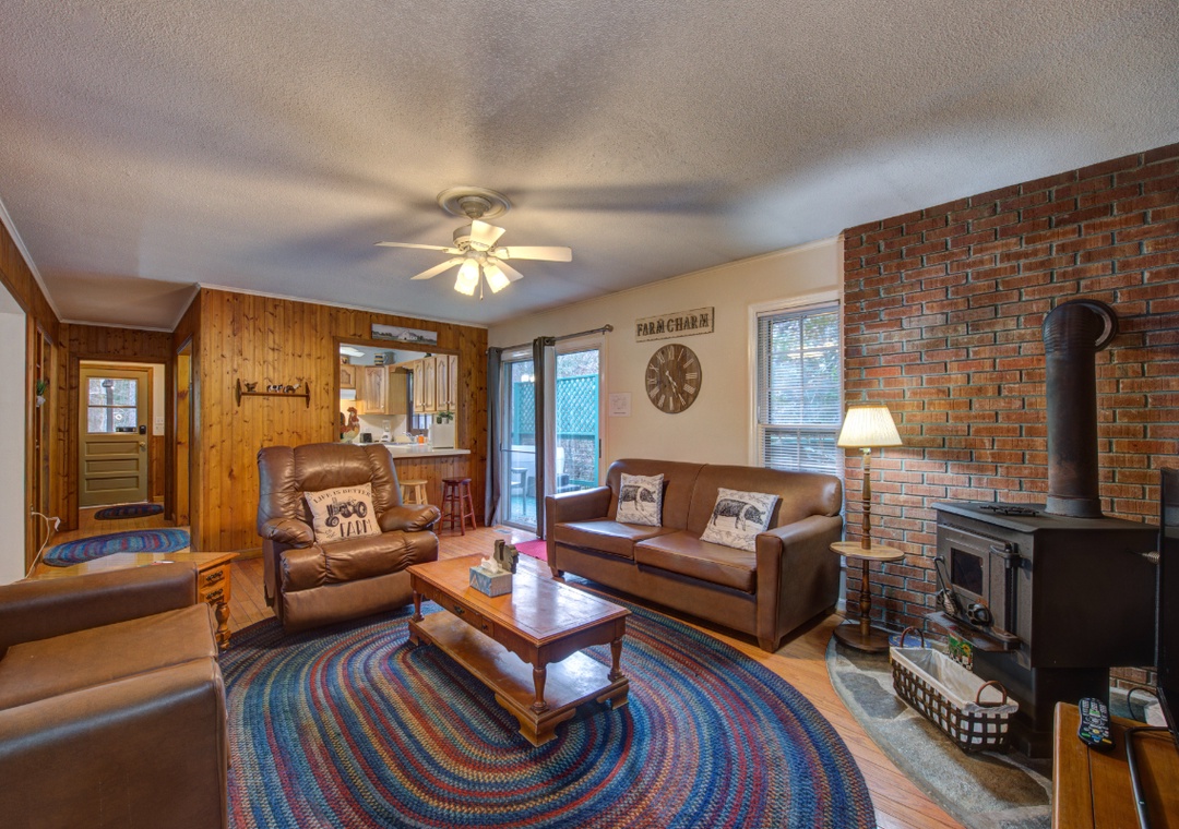 The heart of our home is the cozy living room, where a wood-burning stove provides the perfect glow for cool mountain evenings. Large windows frame the surrounding forest and let sunlight spill across the room, creating a bright yet intimate atmosphere. The open layout seamlessly connects the living area with the kitchen and dining room, making it easy for everyone to spend time together, whether you’re sipping morning coffee, prepping dinner, or enjoying a game night. The home is laid out on one convenient level, offering easy access to every room, including the laundry area and a small arcade space that adds a fun touch for guests of all ages. Free WiFi is also available throughout the property, ensuring that streaming, remote work, or keeping the kids entertained is effortless.