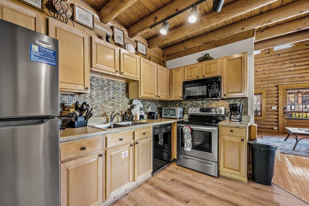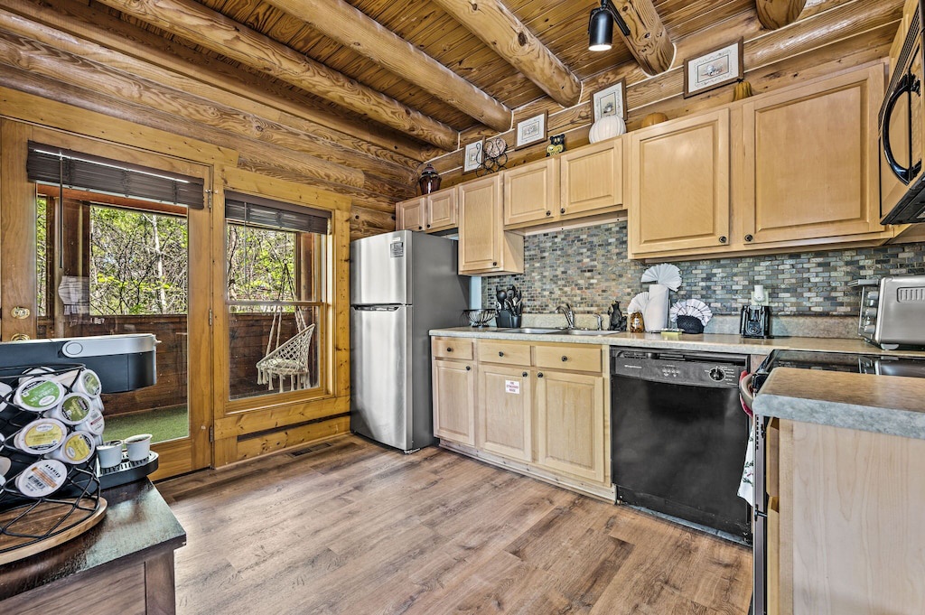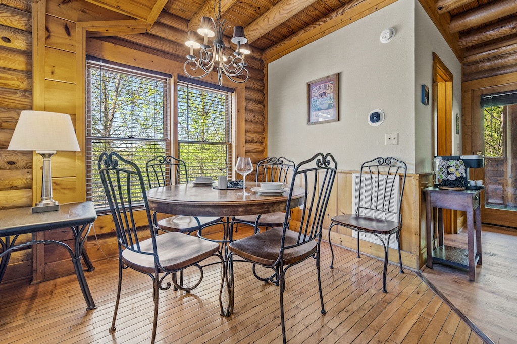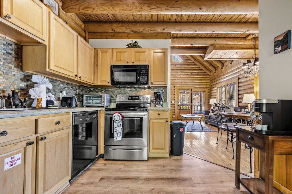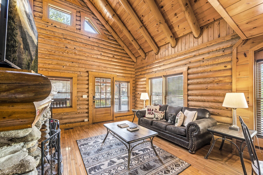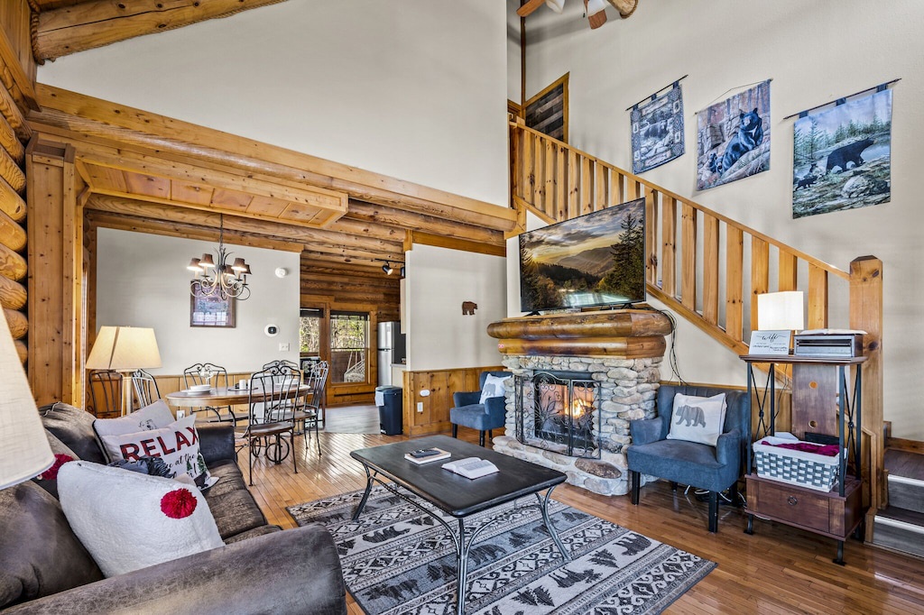 Gorgeous, fully furnished log cabin retreat with mountain décor and tons of amenities; Spacious living area with vaulted ceilings, fireplace, comfy couch and flat screen TV; Open floor plan with living and dining on the same level; Additional living space in downstairs bedroom; Modern and fully equipped kitchen; Wifi