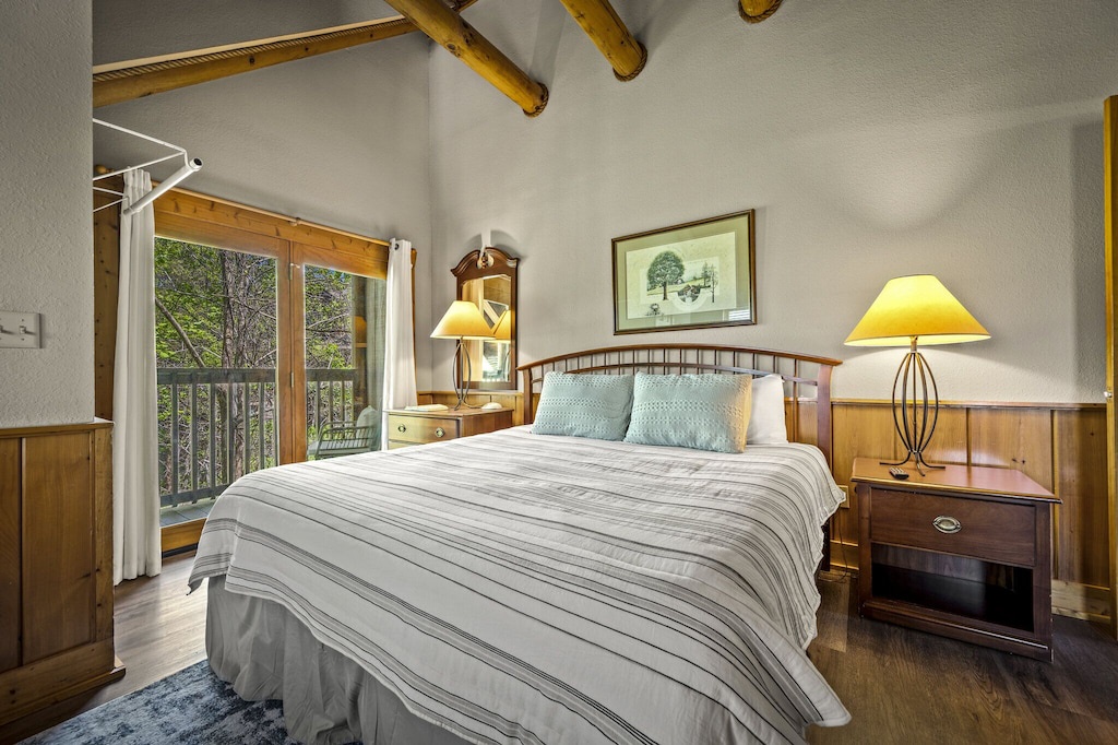 ✔ Bedroom #2 (Lower Level): Cozy bedroom with Queen-sized bed, sleeper sofa located in the additional living area which hosts an additional fireplace and flat screen TV; Attached full bathroom with walk-in shower; Private deck access