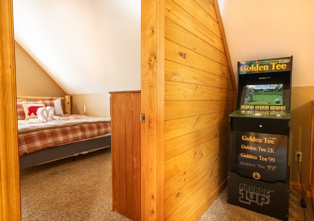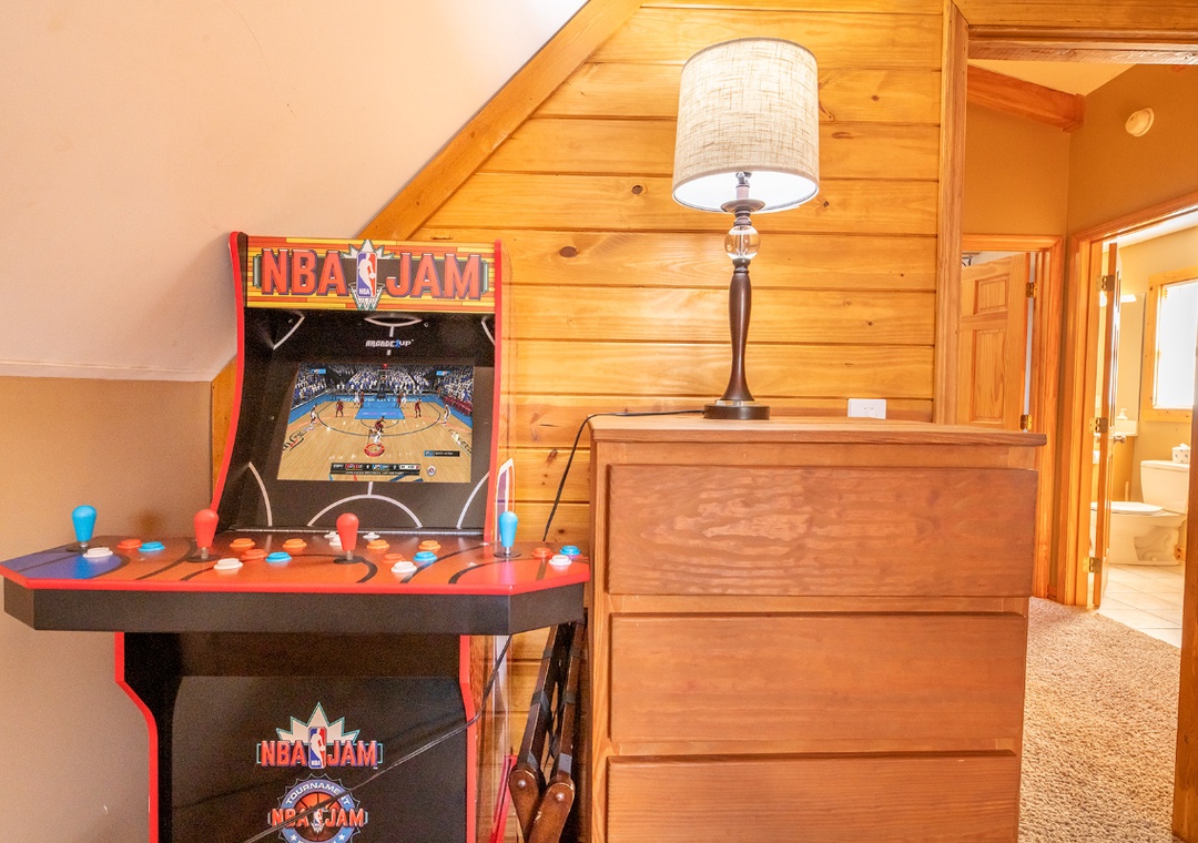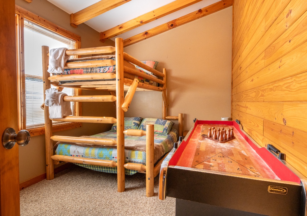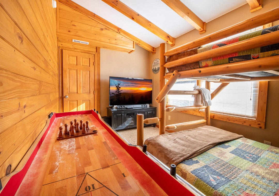 As you step inside, you’ll feel right at home in a warm, inviting space where comfort meets rustic elegance. The main living area offers a cozy fireplace, perfect for relaxing after a day of adventures. Enjoy watching your favorite movies or shows on the flat-screen TV, or sink into the comfortable seating as you soak in the warm ambiance. Also, find a shuffleboard table where you can spend a little time in friendly competition. For younger guests, there’s an arcade game area filled with multiple games, providing hours of fun for kids of all ages.