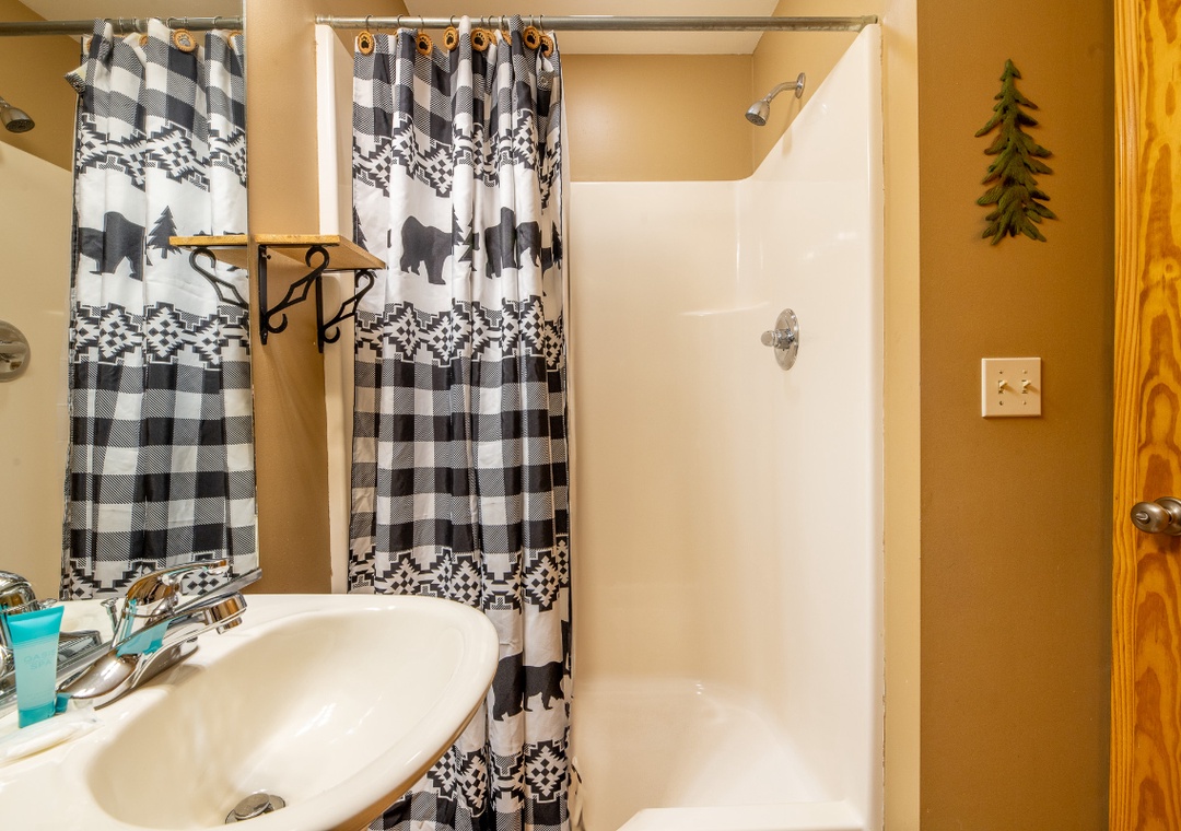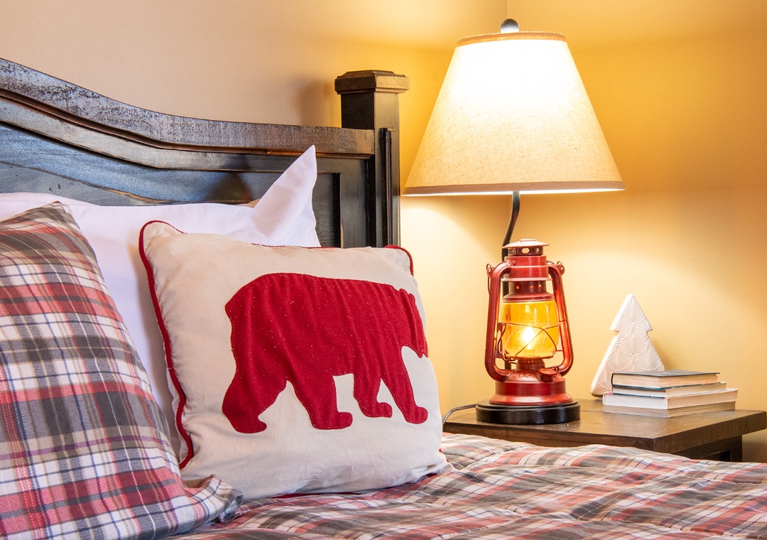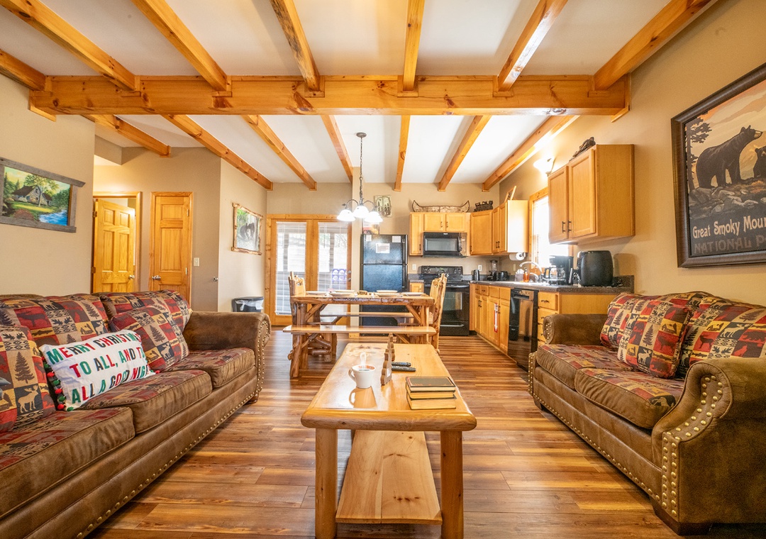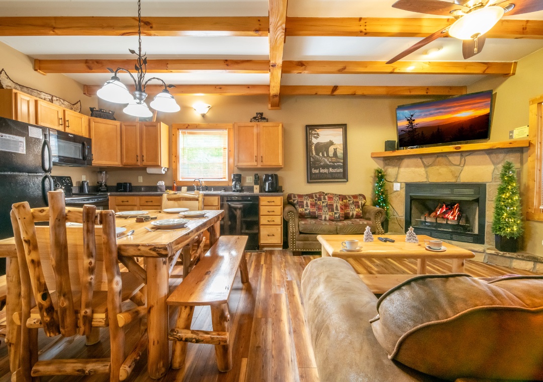 As you step inside, you’ll feel right at home in a warm, inviting space where comfort meets rustic elegance. The main living area offers a cozy fireplace, perfect for relaxing after a day of adventures. Enjoy watching your favorite movies or shows on the flat-screen TV, or sink into the comfortable seating as you soak in the warm ambiance. Also, find a shuffleboard table where you can spend a little time in friendly competition. For younger guests, there’s an arcade game area filled with multiple games, providing hours of fun for kids of all ages.