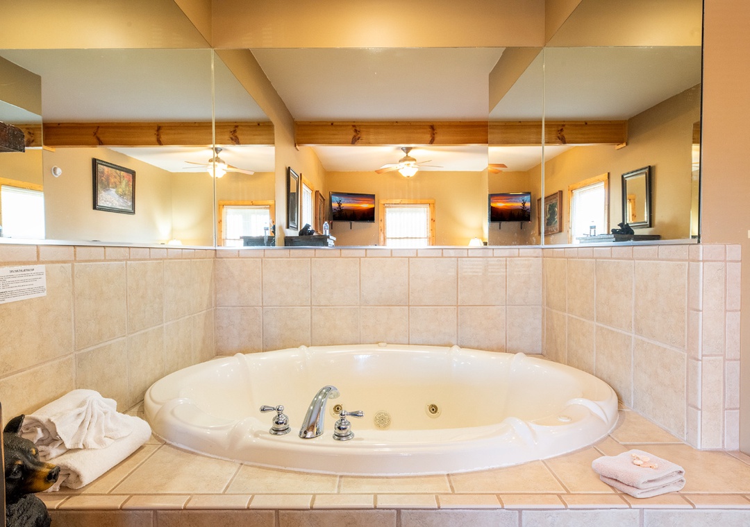 ✔ Bedroom #1 (Main Level): Spacious Bedroom with a King-size Bed, Flat-screen TV, and Jacuzzi Tub; Access to Full Bathroom with Stand-up Shower