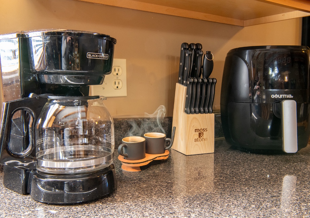 The fully-equipped kitchen at comes with everything you need to cook up your favorite meals. Complete with a full-sized refrigerator, dishwasher, stove, microwave, and other kitchen appliances perfect for making breakfast, lunch, or dinner throughout your stay! All pots, pans, glasses, plates, silverware, etc. are also there for you! Enjoy your creations on the dining table creating the perfect setting for shared meals and laughter.