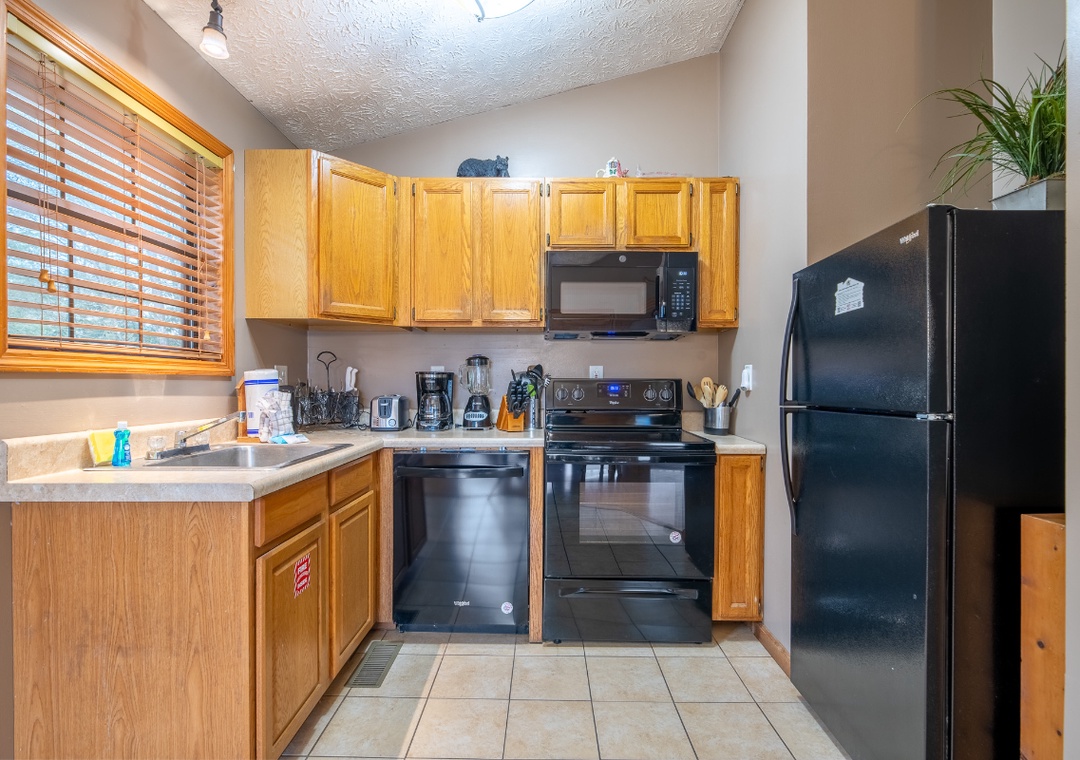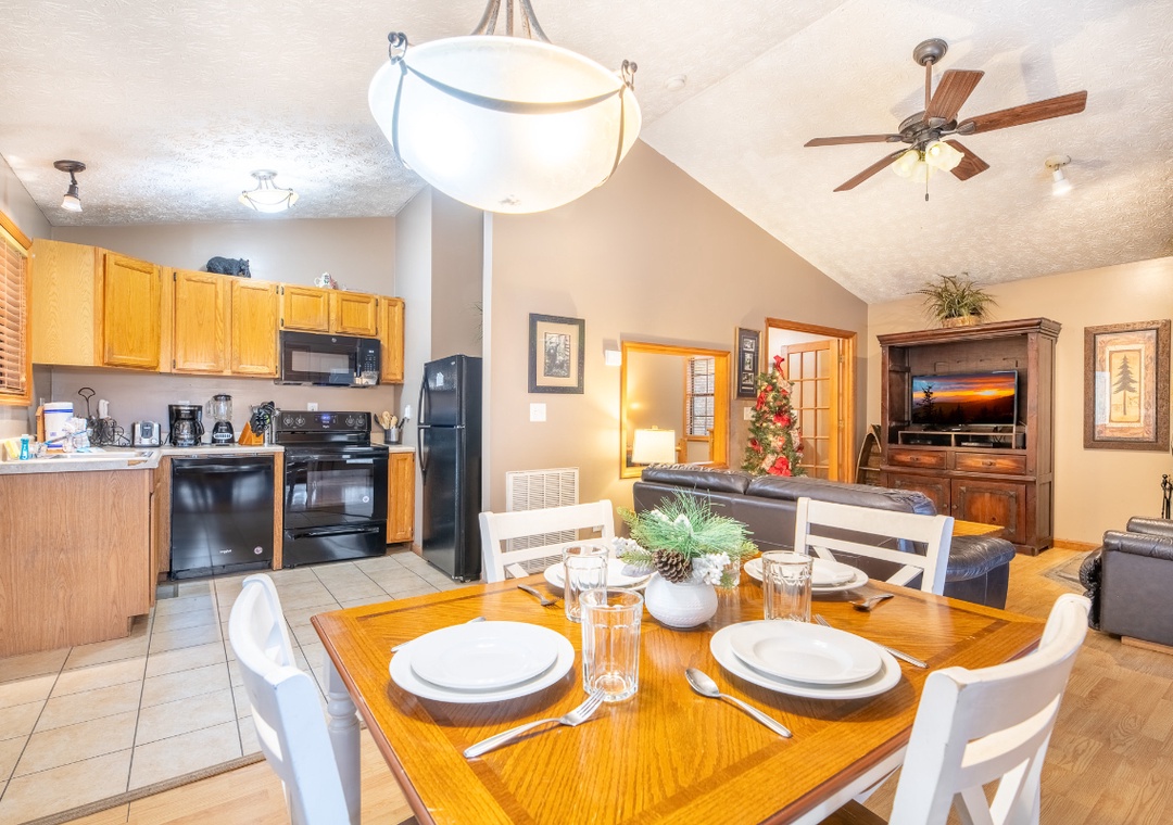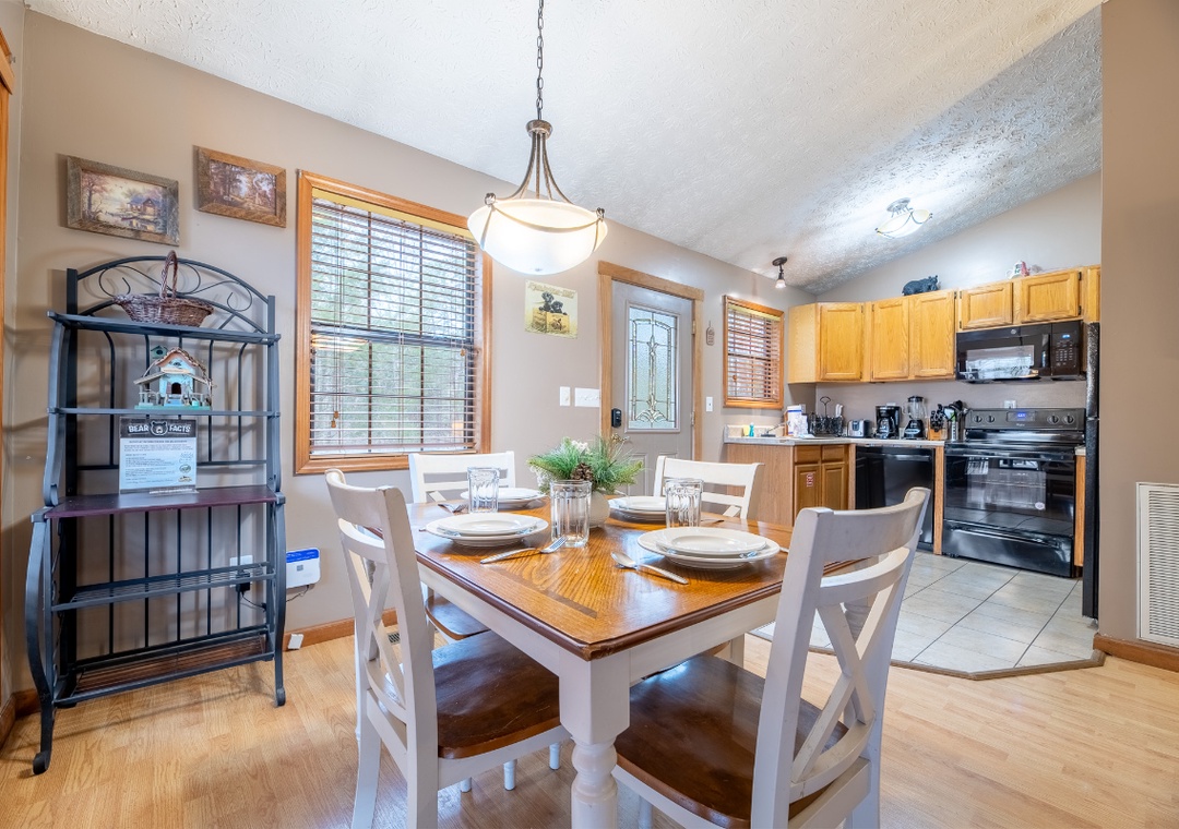 The fully-equipped kitchen boasts modern amenities, making it easy to prepare delicious meals for your family or friends. Well-appointed with a refrigerator, stove, microwave, and other kitchen appliances, perfect for making breakfast, lunch, or dinner throughout your stay! All pots, pans, glasses, plates, silverware, etc., are also there for you! Just steps away, the dining area provides a welcoming place to sit, savor, and connect.
