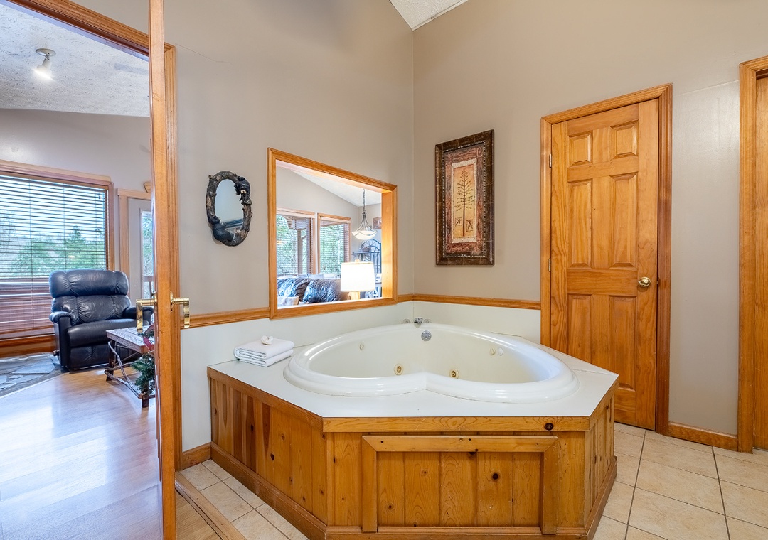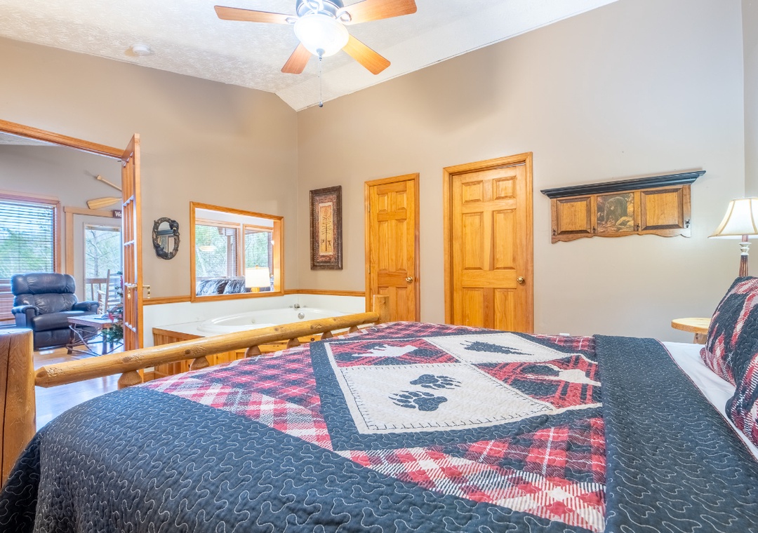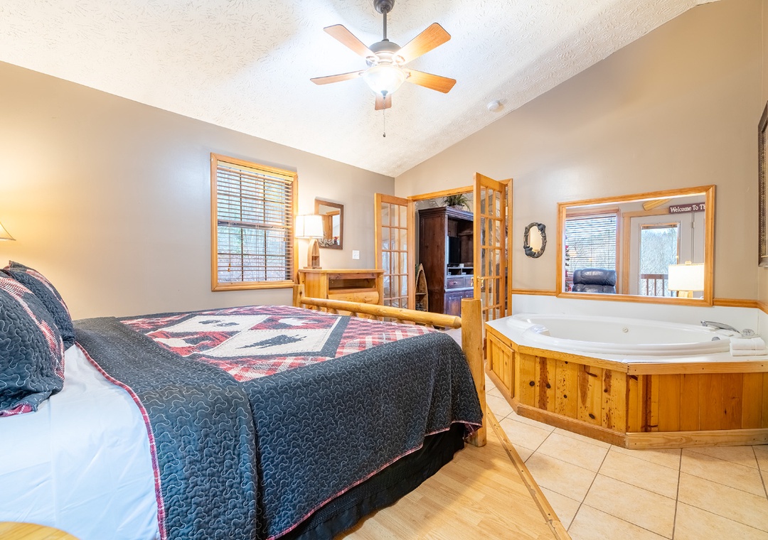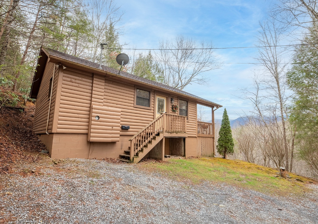 The living room serves as the heart of your entertainment experience. A comfortable seating area invites you to settle in and unwind, while the wood fireplace adds warmth and ambiance that instantly elevates movie nights and late-night conversations. The TV is equipped with a DVD player and dish box, giving you a wide range of viewing options for lazy afternoons, rainy days, or romantic evenings in. Entertainment continues beyond the living room and into the bedroom, where relaxation becomes an experience of its own. The in-room jacuzzi tub offers a unique way to unwind together, turning evenings into spa-like escapes. Step outside to the side porch, and you’ll find your private hot tub perfect for both daytime relaxation and nighttime stargazing. The hot tub offers endless enjoyment as you soak beneath the open sky, surrounded by trees and fresh mountain air. Outdoor entertainment is made even better with the charcoal BBQ grill, allowing you to cook and dine together in the fresh mountain air. Easy 15-minute drive to downtown Gatlinburg and well worth it for the solitude, view, and peacefulness. Country market, country restaurant, and laundromat located 2 miles from the cabin - no need to drive to town.