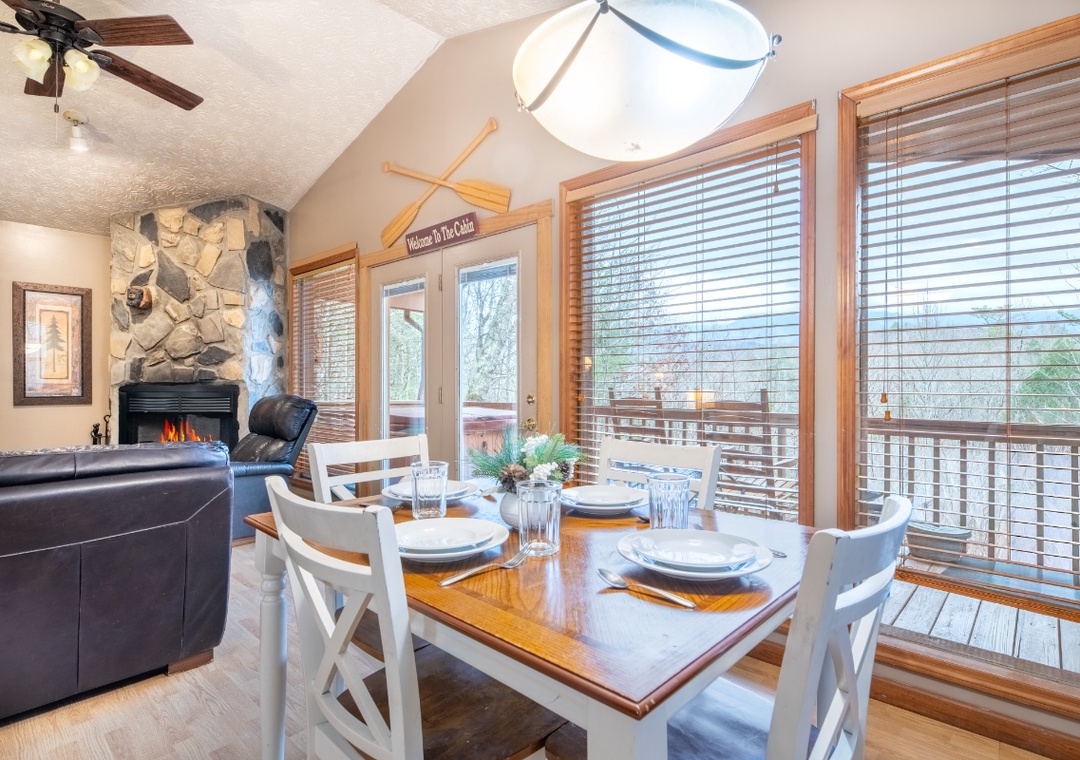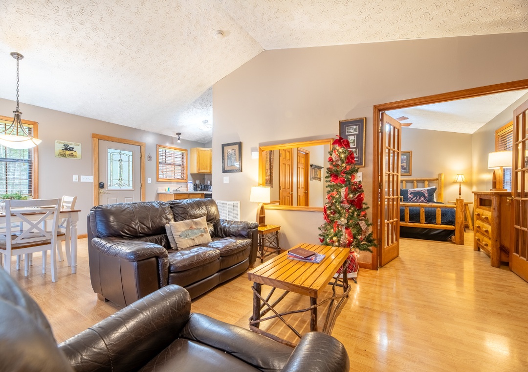 The living room serves as the heart of the cabin, offering a comfy loveseat and recliner to enjoy the view or a good movie. The wood fireplace adds both warmth and ambiance, making cool mountain evenings the perfect excuse to curl up together with a blanket and a glass of wine. At the same time, the TV with DVD player and dish box provides entertainment without distracting from the cabin’s calm, romantic feel. The open layout allows you to move effortlessly from the living room to the kitchen and dining area, where breakfast can turn into lingering coffee dates. The jacuzzi tub located in the bedroom invites you to soak in warm, bubbling water while enjoying the privacy and comfort of your surroundings. Free WiFi is also available throughout the property.