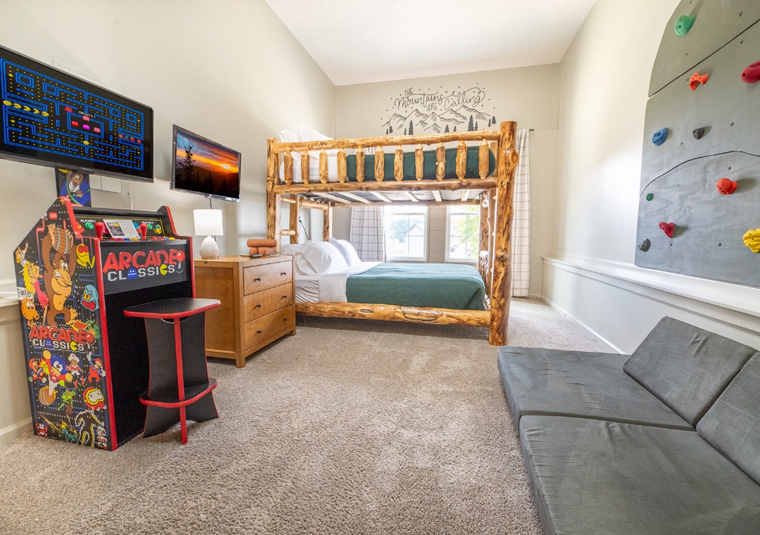 ✔ Bedroom #1 (Main Level): Inviting Bedroom with a Queen-over-Queen Bunk Bed, a Climbing wall, an Arcade, and a Flatscreen TV; Access to a Half Bathroom