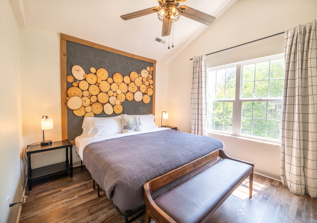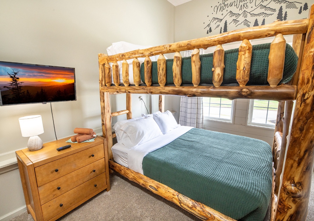 As you step inside, you’re welcomed by a warm and inviting atmosphere that radiates comfort. The expansive open-concept living area serves as the heart of the lodge, featuring a beautifully appointed space where you can relax and unwind. The living room flows seamlessly into the dining area and kitchen, fostering a sense of togetherness. The dining table comfortably seats your entire group, perfect for enjoying home-cooked meals or celebratory dinners. The adjacent kitchen is a chef’s delight, equipped with modern appliances, ample counter space, and all the utensils you need to prepare meals with ease. Also, find each of the four bedrooms which are designed to provide a peaceful retreat after a full day of Smoky Mountain exploring. Free WiFi is also available throughout the property.
