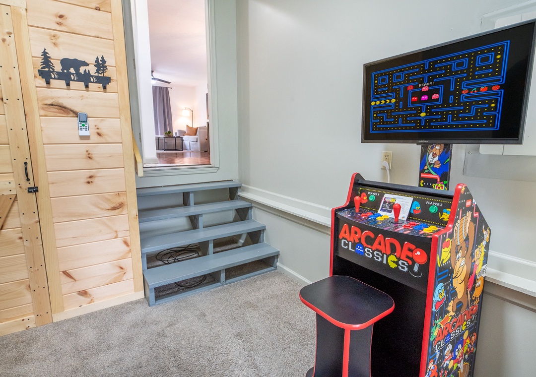 Start at the main level which features a spacious living area where you can gather around and enjoy quality time together. For a unique twist on indoor entertainment, the main level bedroom features its very own little climbing wall for a fun activity for the kids. It also features a fantastic arcade, making it the perfect spot for some nostalgic gaming fun. Upstairs, a cozy reading nook awaits. This charming space is perfect for curling up with a good book, enjoying a quiet moment, or catching up on some well-deserved relaxation. It’s an ideal retreat for those who enjoy a peaceful corner to escape to, whether for a few moments of solitude or a longer, leisurely read. Then step outside onto the private backyard designed for fun and relaxation. Dip into the hot tub for a soothing soak or challenge your family and friends to a lively game of Cornhole. The outdoor dining area is also perfect for dining al fresco, creating an ideal setting for summer evenings under the stars. “Dreaming Bear” is also strategically located for those who want to experience the best of the Smoky Mountains. Just minutes away from the bustling town of Sevierville and Pigeon Forge, you’ll have easy access to a variety of shops, restaurants, and local attractions.