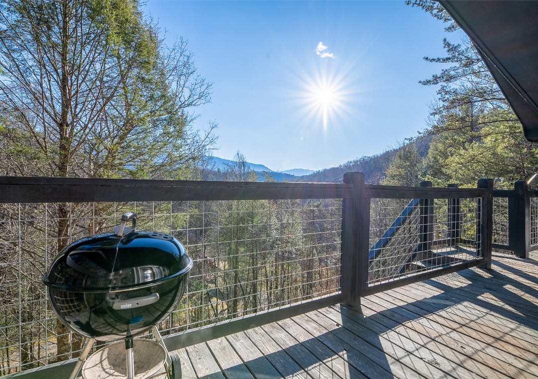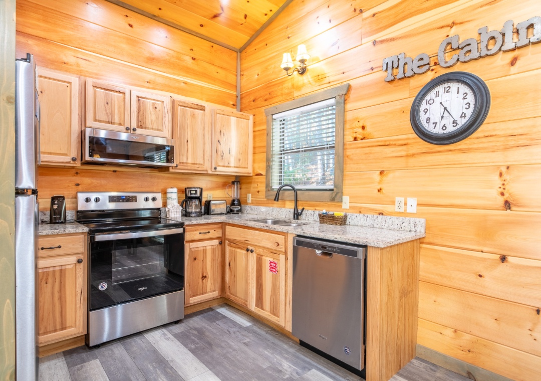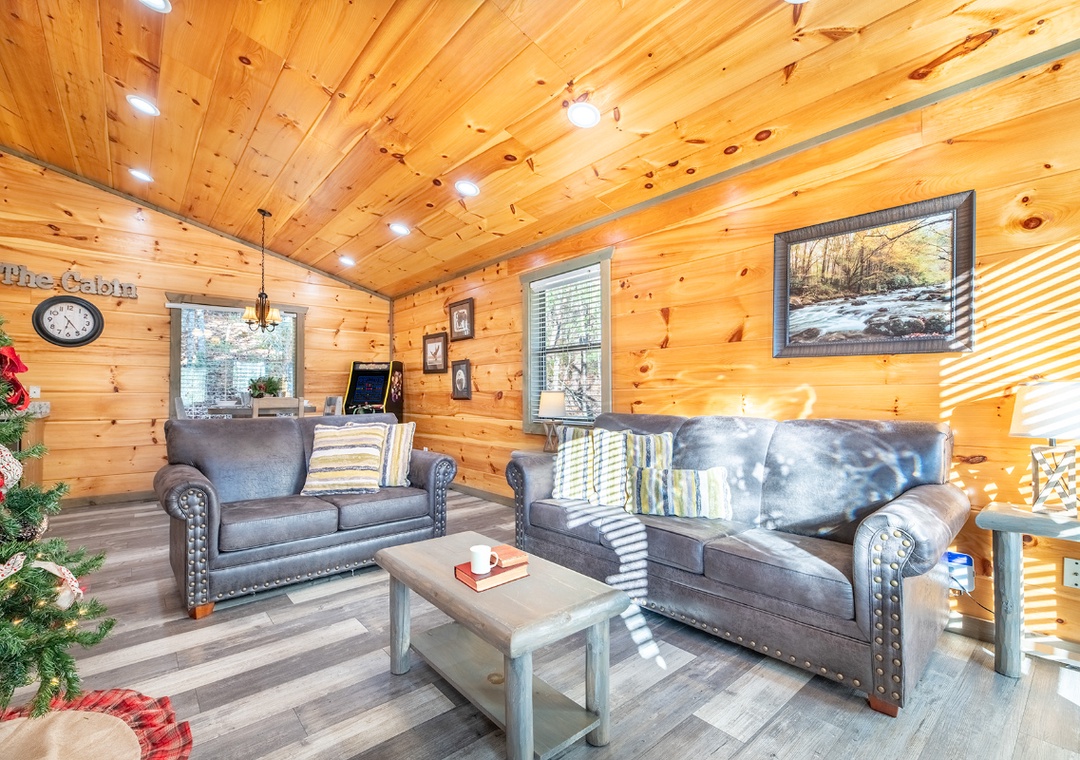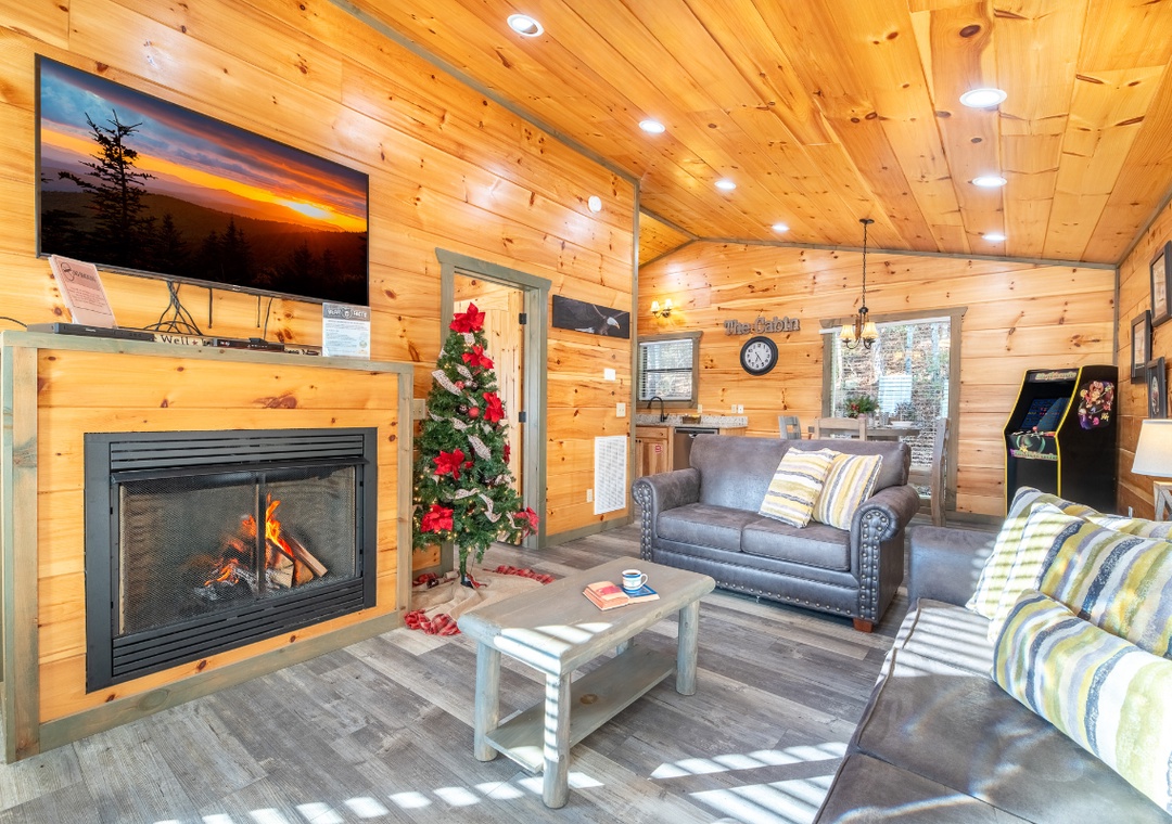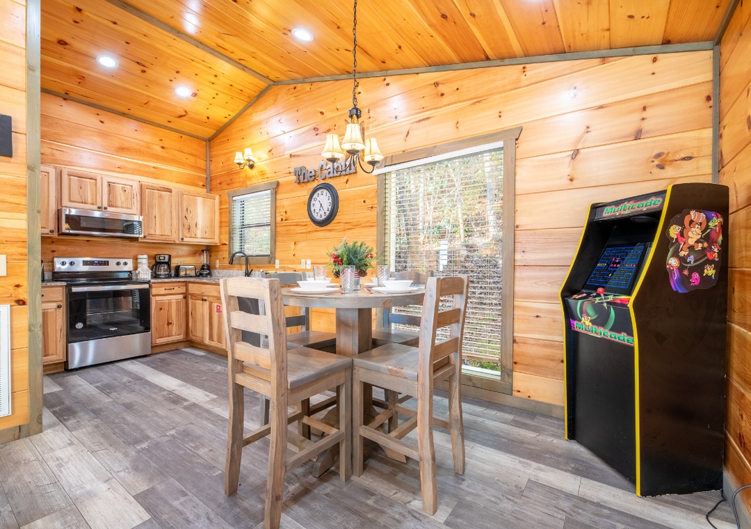 In the living room, sink into plush seating and enjoy movie nights or your favorite streaming shows on the large Roku TV w/ DVD player. The propane fireplace adds ambiance while you unwind with a glass of wine or simply enjoy time together. For a nostalgic twist, the Multicade arcade brings classic 1980s fun right into the living room. Challenge each other to Ms. Pac-Man, Galaga, Donkey Kong, and many other retro favorites. Outside is where the large private deck becomes your personal front-row seat to sweeping mountain views. The private hot tub offers the chance to soak and relax while surrounded by nature and total privacy. The deck is also ideal for lounging with a book, sipping a drink, or simply watching the mountains change colors throughout the day. You can also fire up the charcoal grill and enjoy cooking meals together. When you’re ready to explore beyond the cabin, downtown Gatlinburg is just a 15-minute drive away, offering shows, attractions, shopping, and dining. You’re also only a few miles from the Greenbrier entrance to the Great Smoky Mountains National Park, making it easy to mix cabin entertainment with outdoor adventures.