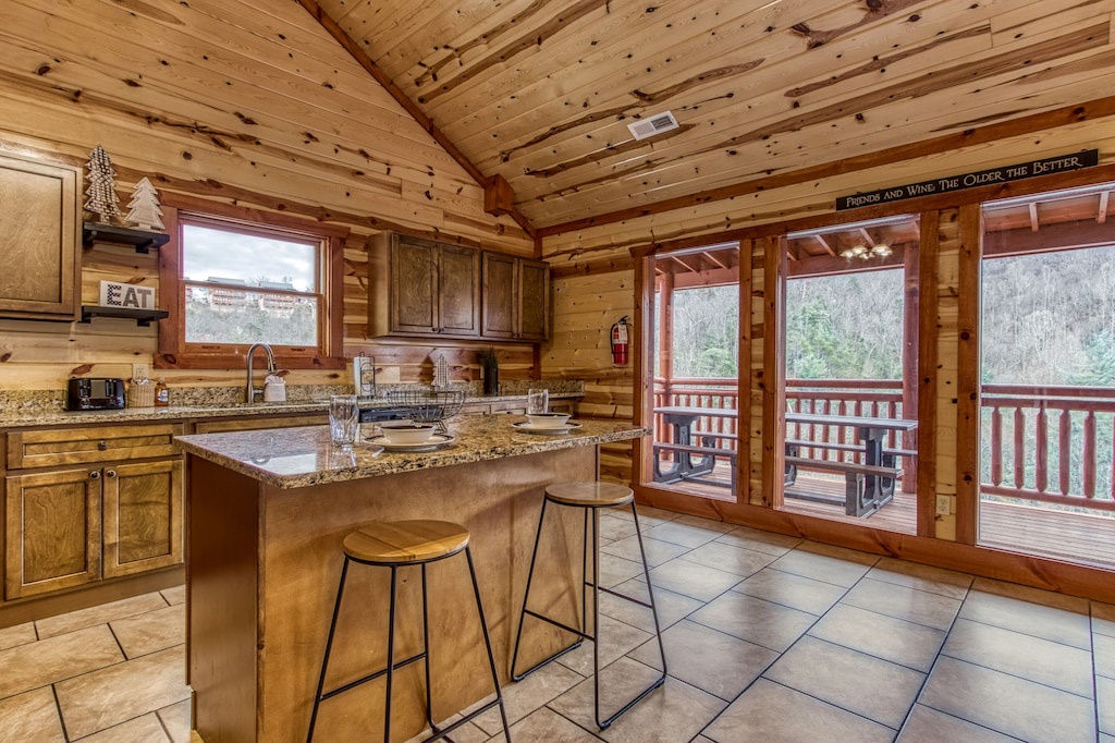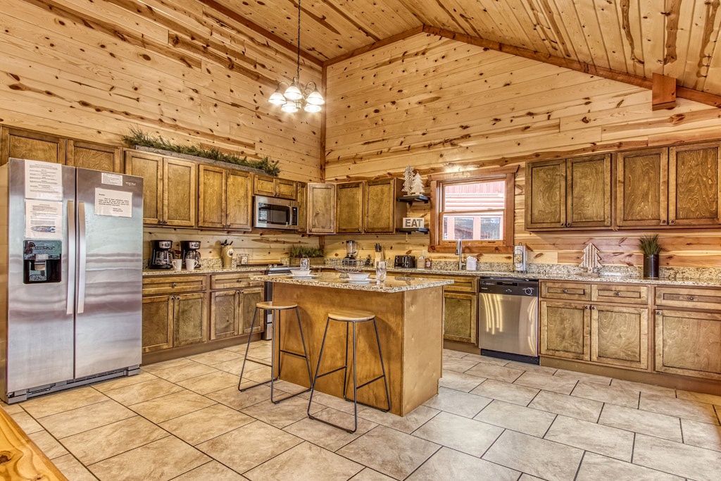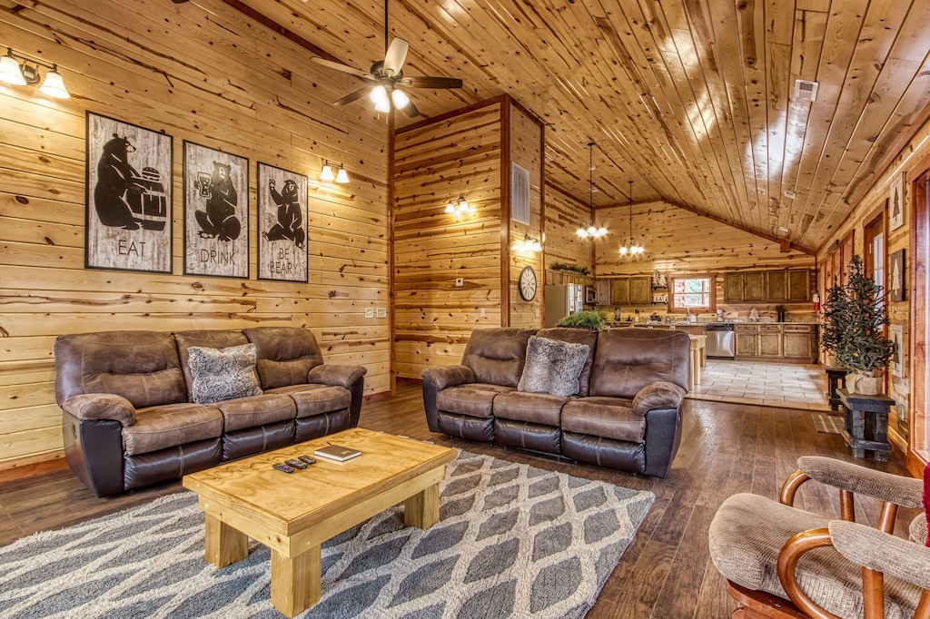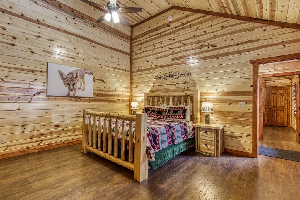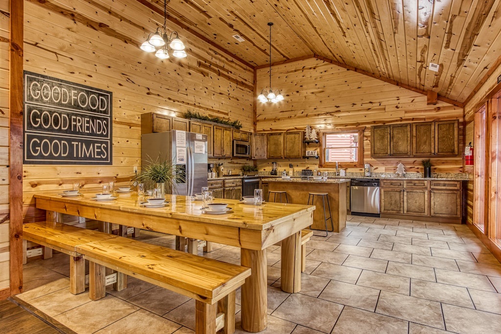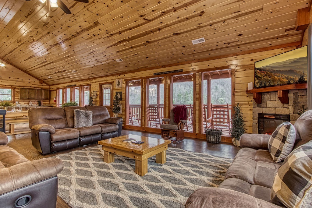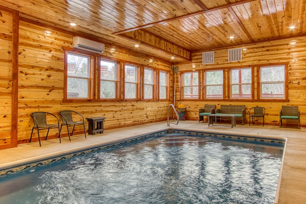 Fully furnished cabin, smart TVs in all bedrooms, large living area with high ceilings, wood floors, fireplace, fully furnished kitchen with large dining room table, updated appliances and finishes, separate game room and theater room, indoor pool!
