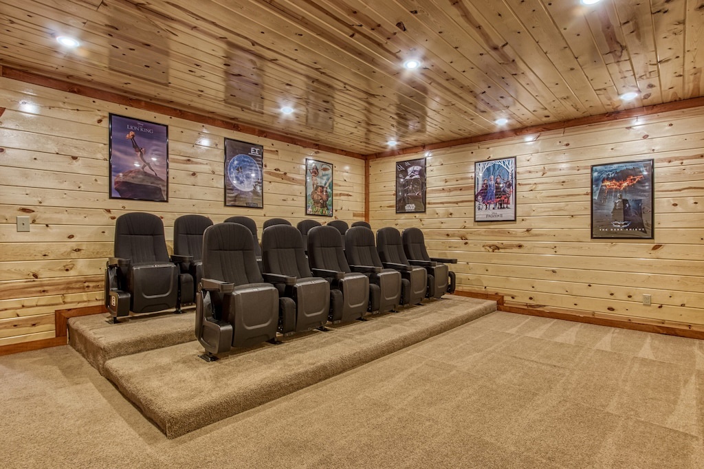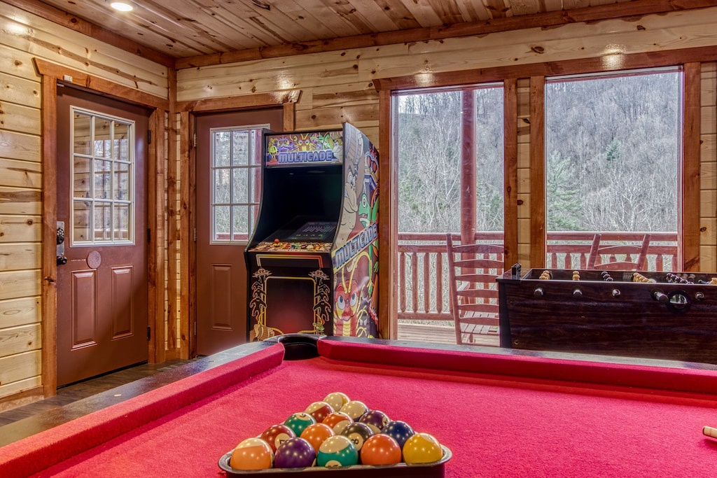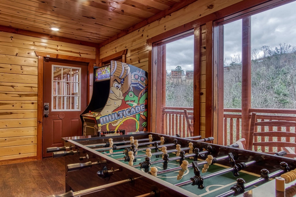 As to entertainment, you won’t even have to leave the cabin if you don't want to! Splash into your private indoor pool for swimming year-round, soothe your muscles in the bubbling hot tub, or host movie nights in the theater room with a big screen TV with plush chairs. You even have your own game room where you can play arcade games, shoot pool, and challenge someone to a round of foosball! Entertainment continues with TVs in all the bedrooms, along with wireless internet. ★★