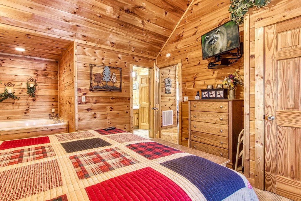 Bedroom One (main level): King-sized bed + TV + jacuzzi tub in the room + private bathroom