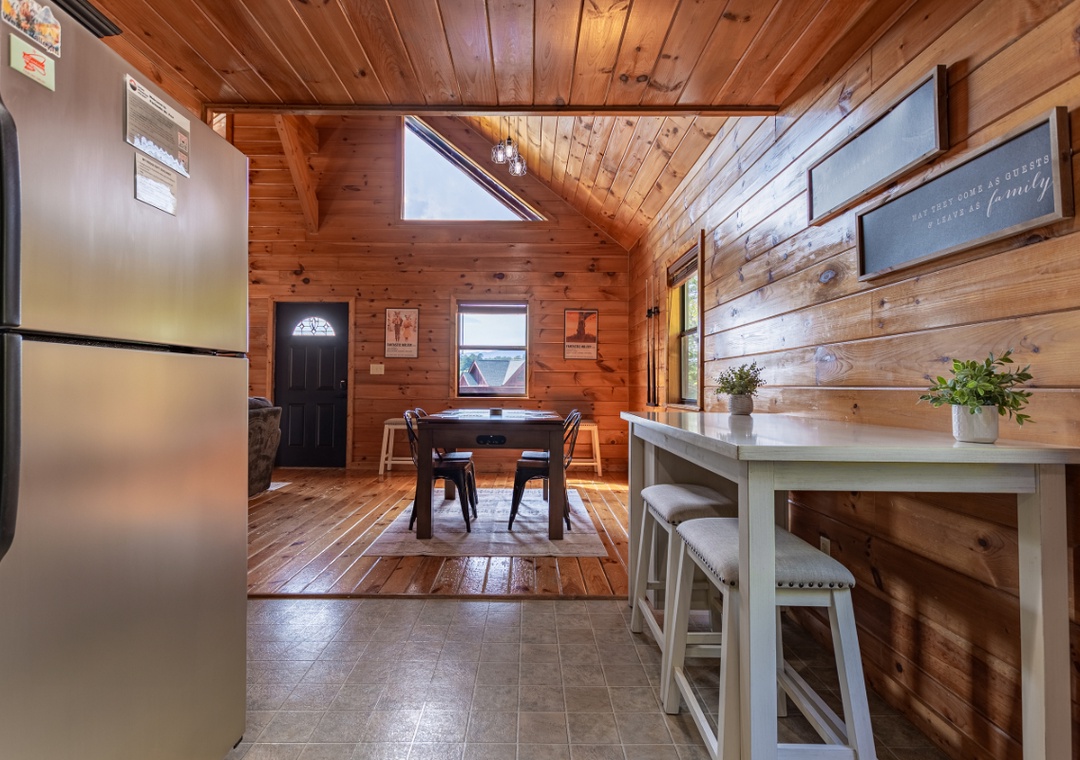 Upon entering, you'll be embraced by the warm and inviting atmosphere of the living room, where a gas fireplace creates a soothing focal point. This area is perfect for curling up on the plush sofas with a good book or enjoying a movie night with loved ones. Our cabin also features two beautifully appointed bedrooms, each designed to ensure a restful night’s sleep. For your entertainment, "Fantastic Mr. Fox" comes equipped with an assortment of board games, ensuring that there’s never a dull moment indoors. It also features a well-appointed kitchen and dining area, ideal for preparing and enjoying home-cooked meals. Share your meals at the dining table, which offers a cozy spot to gather and enjoy each other’s company. Free WiFi is also available throughout the property.