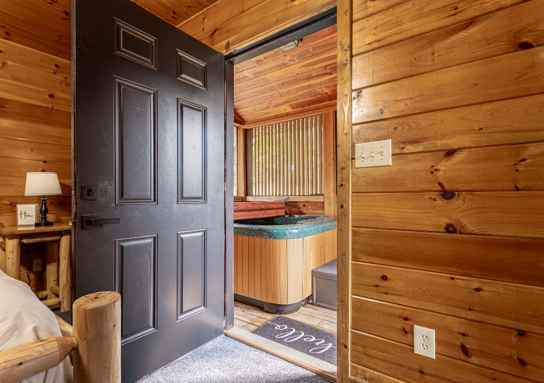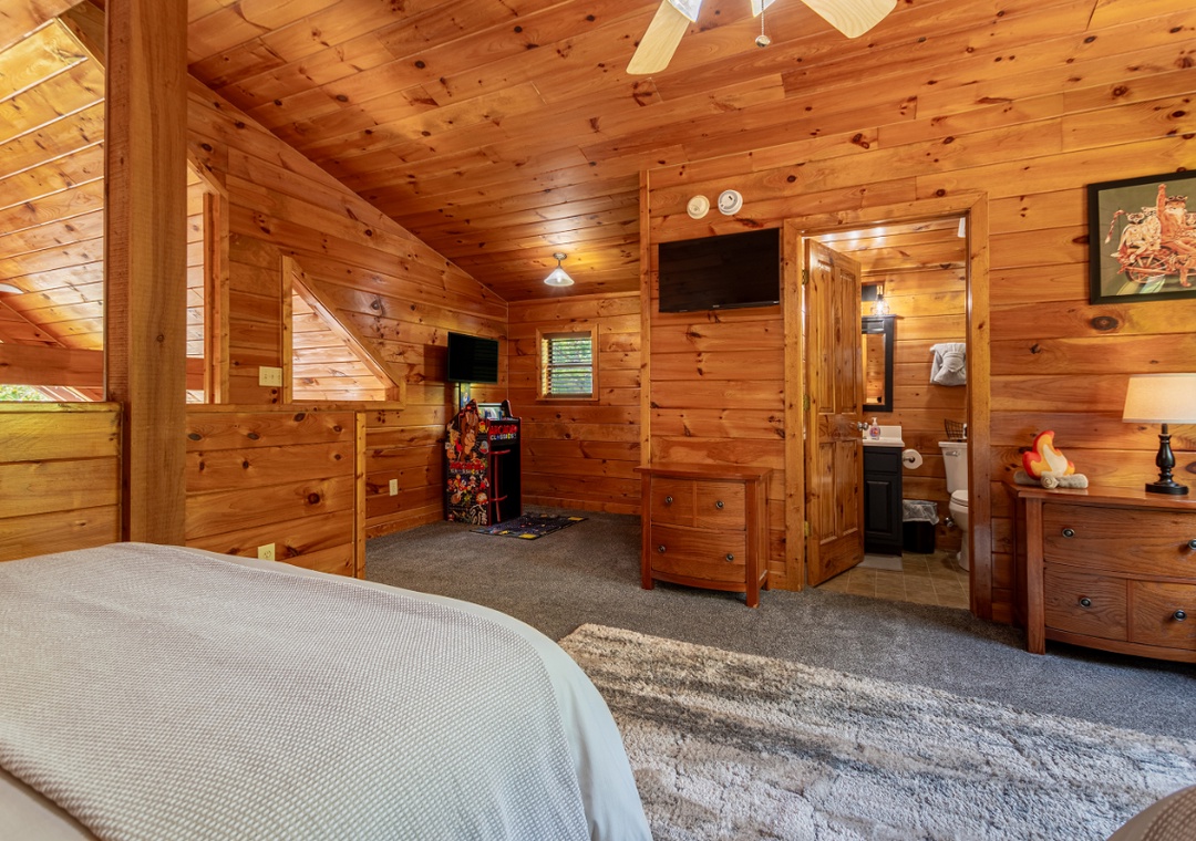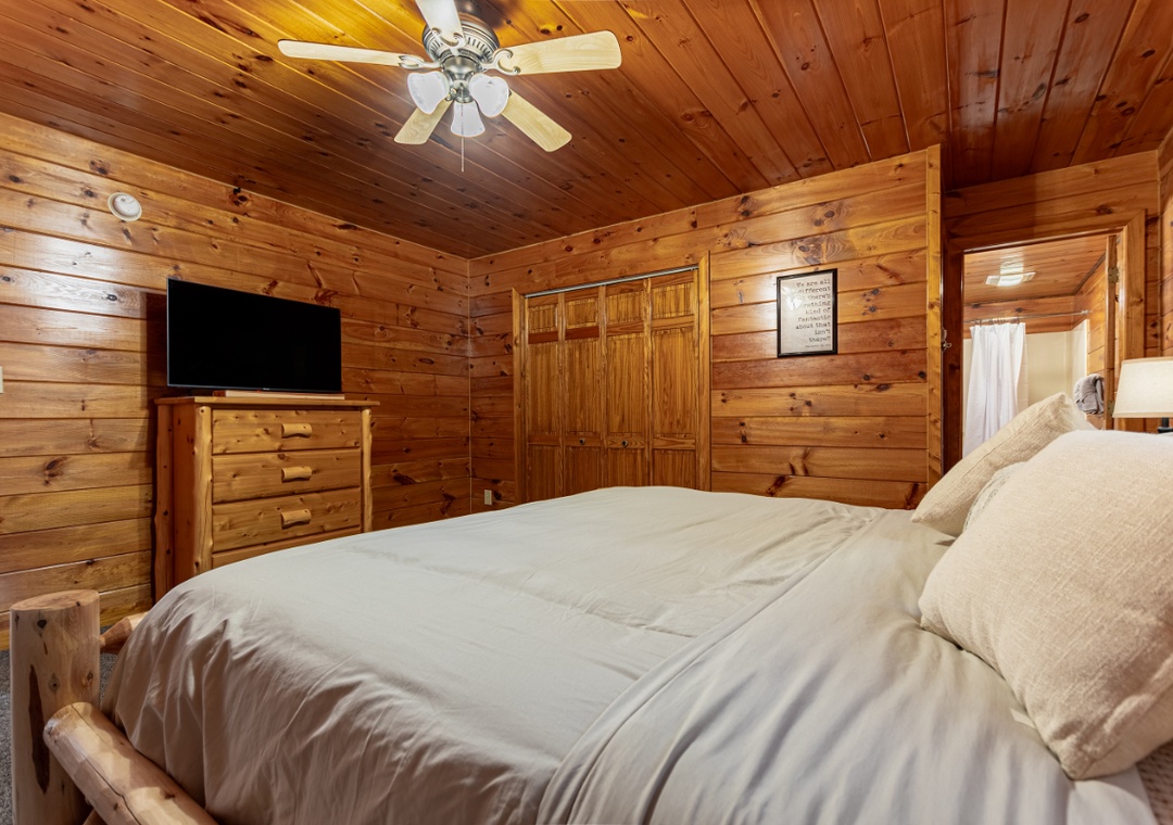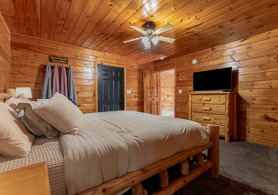 ✔ Bedroom #1 (Master Bedroom): Spacious Bedroom with a King-sized Bed and Flat-screen TV; Attached Full Bathroom with Shower/Tub Combo and Private Access to Hot Tub