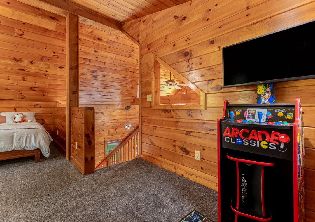 The heart of the cabin features a cozy living room with a gas fireplace, creating a warm and inviting atmosphere for game nights and movie marathons. It also comes equipped with an arcade and an assortment of board games that are sure to spark friendly competition and laughter. Step outside and you'll find a private gazebo with a propane grill, perfect for hosting a barbecue or enjoying a delicious al fresco meal. Adjacent to the gazebo, a wood firepit awaits for those classic outdoor experiences – gather around the fire, roast marshmallows, and share stories as the flames dance against the night sky. Our cabin also features a private hot tub on an enclosed porch perfect for unwinding after a day of adventures, allowing you to soak in the warm waters while taking in the serene views. Despite its tranquil setting, "Fantastic Mr. Fox" is conveniently close to downtown Pigeon Forge, offering easy access to the vibrant attractions and activities of the area. The excitement of Pigeon Forge is just 1/2 mile away, ensuring you have all the entertainment options you could wish for within easy reach.
