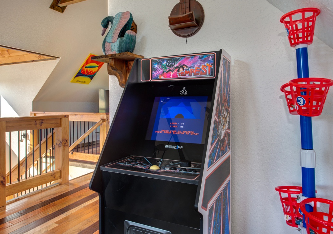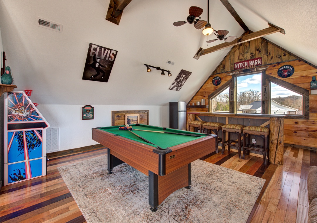 • Game loft with pool table, arcade machine, and bean bag bucket game