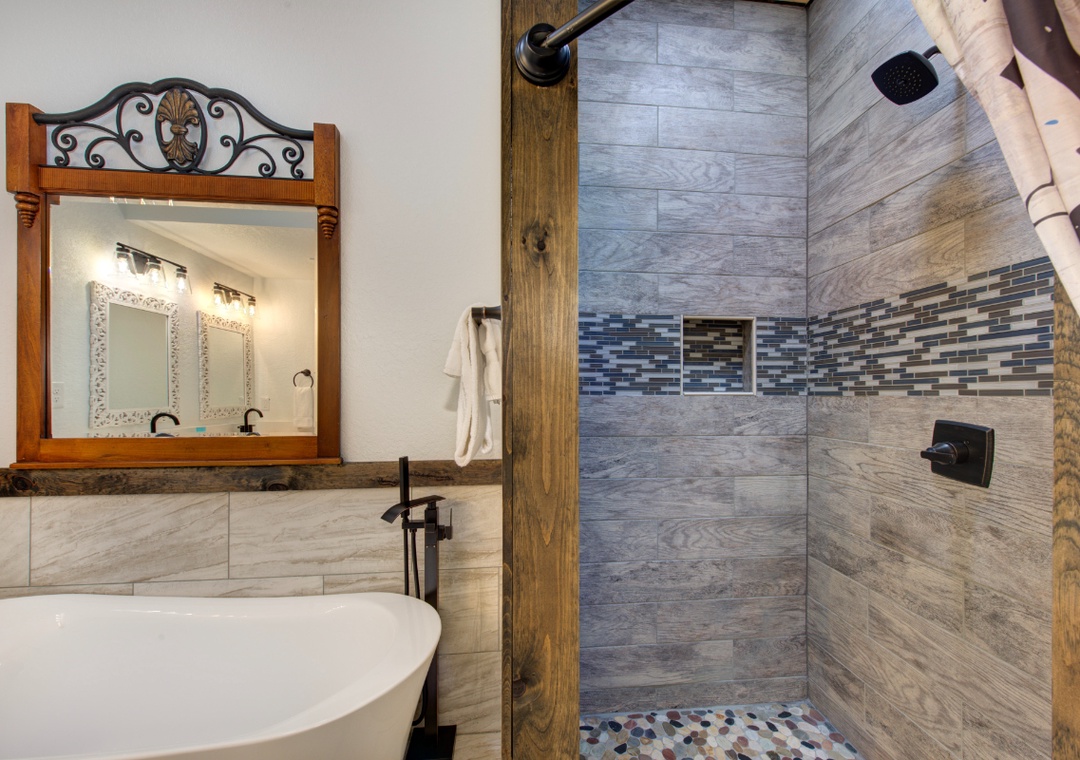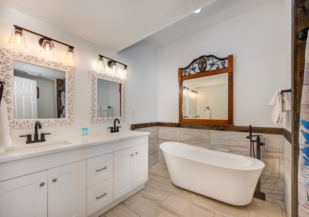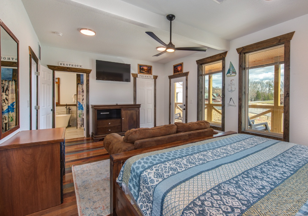 • Bedroom 1 (Second Level): King bed, flat-screen TV, en-suite full bath (shower + separate tub)