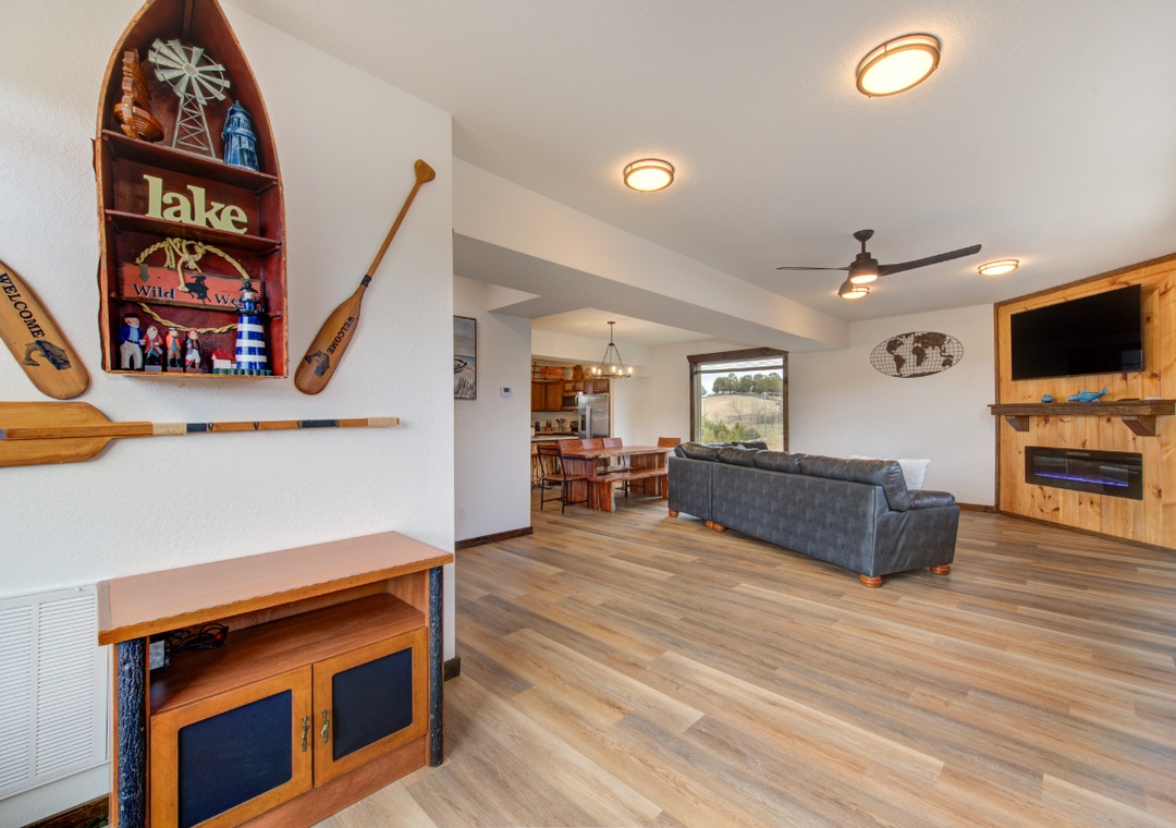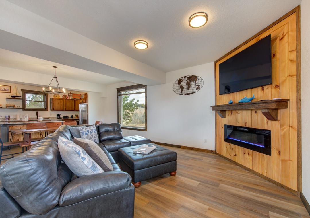 Relax in the open concept living room with plush seating, a 65″ Roku TV, and the