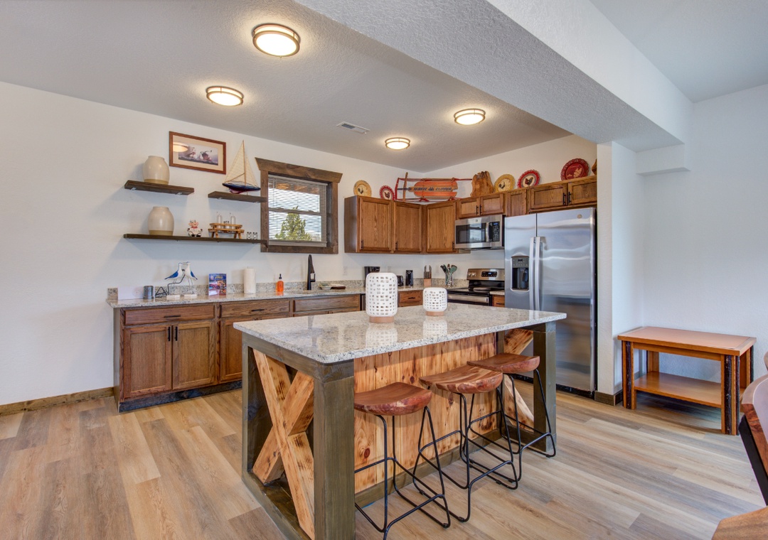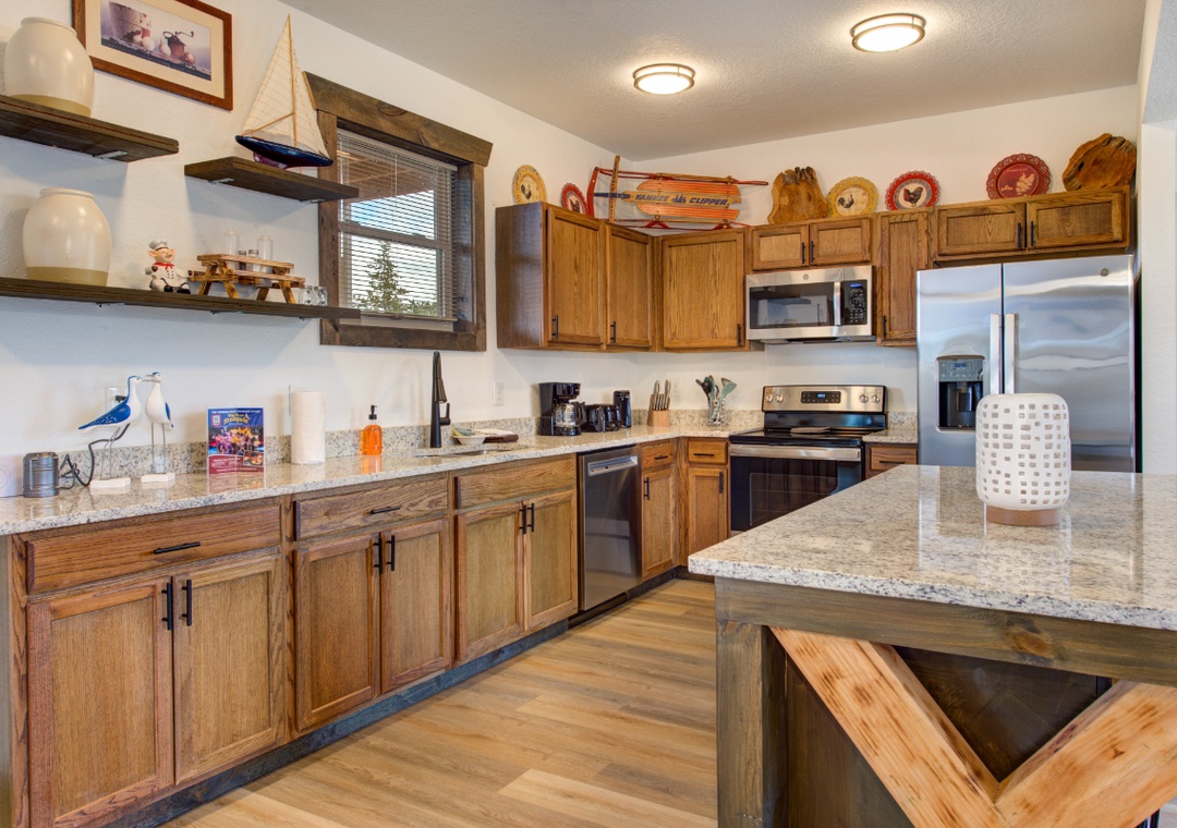 need—full-size refrigerator, stove, microwave, cookware, and tableware—perfect for preparing family meals.