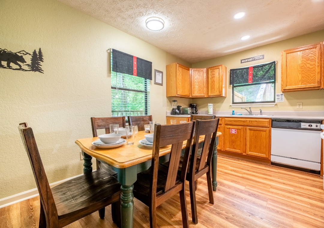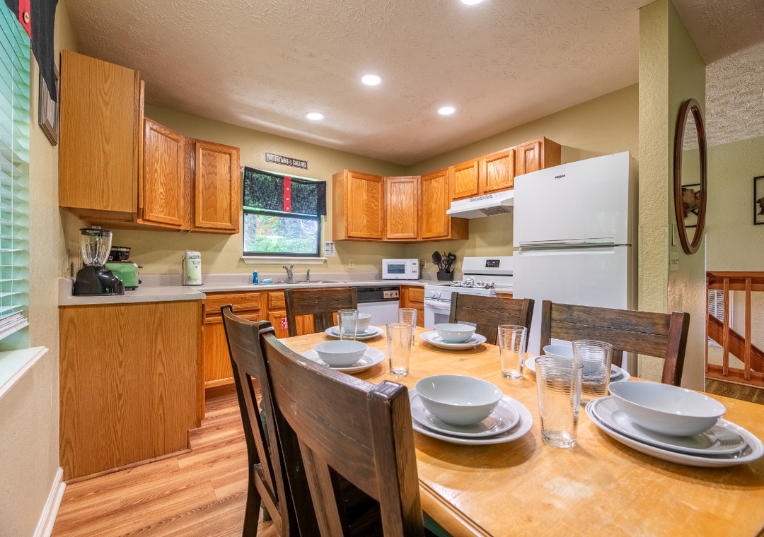 The fully-equipped kitchen boasts modern amenities, making it easy to prepare delicious meals for your family or friends. Well-appointed with a full-sized refrigerator, dishwasher, stove, microwave, and other kitchen appliances perfect for making breakfast, lunch, or dinner throughout your stay! All pots, pans, glasses, plates, silverware, etc., are also there for you! Gather around the inviting dining table to share stories and laughter, as it invites you to savor each bite while taking in the natural beauty of the surroundings.