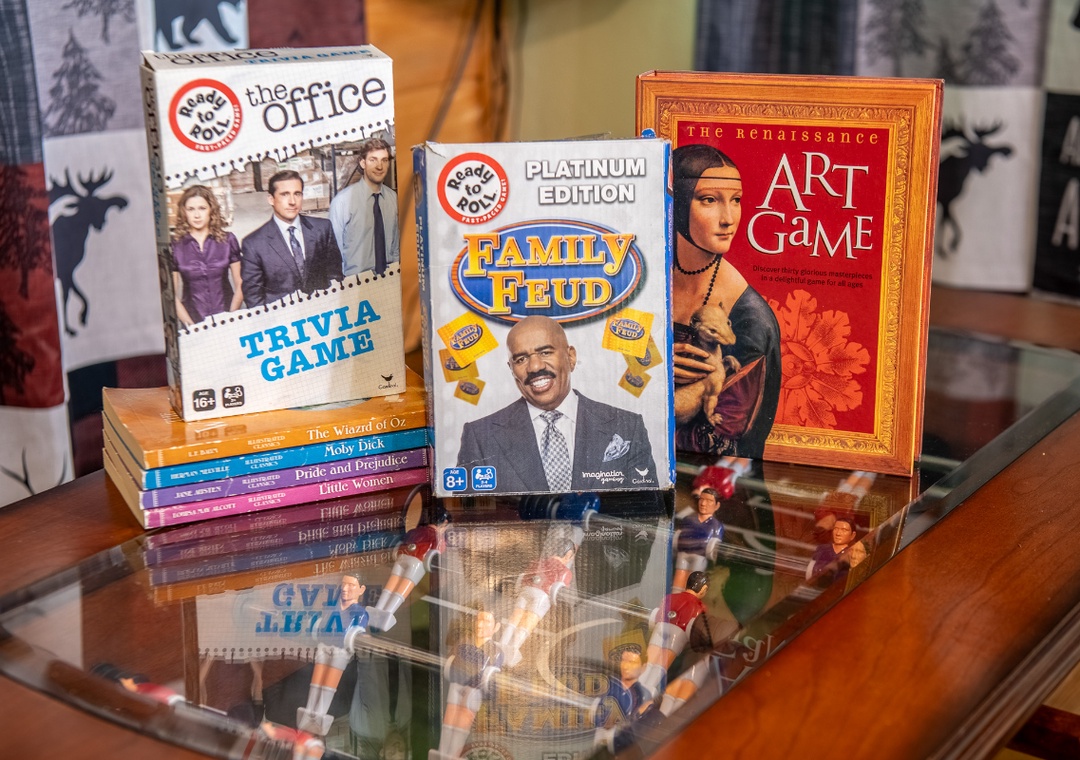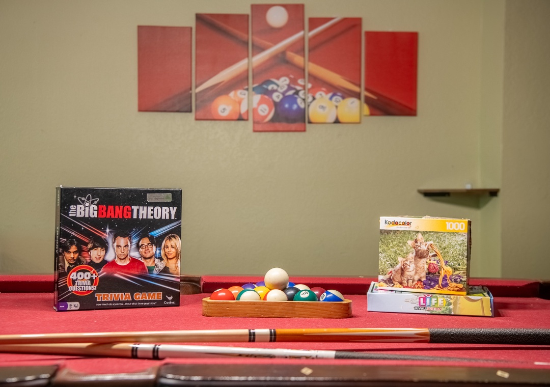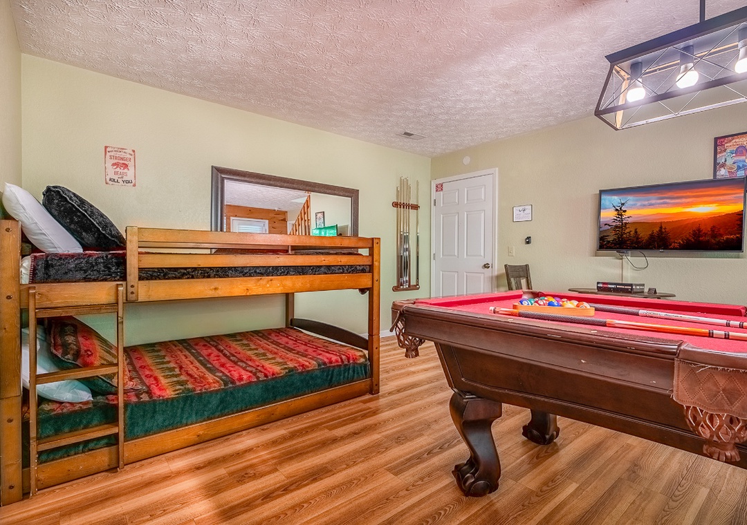 ✔ A Futon and a Full-over-Full Bunk Bed in the Game Room for additional sleeping space