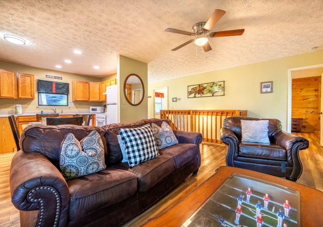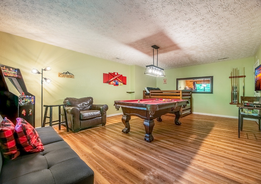 The heart of the home is the open-concept living room, where rustic charm meets modern comfort. A propane fireplace adds the perfect touch of warmth and comfort, especially during the cooler months or quiet evenings in. Gather around the fireplace with a cup of cocoa or glass of wine, or settle in for a movie night on the 42" LG TV, complete with a Roku Box that offers access to all your favorite streaming services. The kitchen is fully equipped with everything you need to cook and enjoy meals without ever leaving the comfort of the cottage. Downstairs, the expansive game room transforms the cottage into your very own entertainment hub. This lively space is designed for hours of indoor fun. Free WiFi is also available throughout the property.