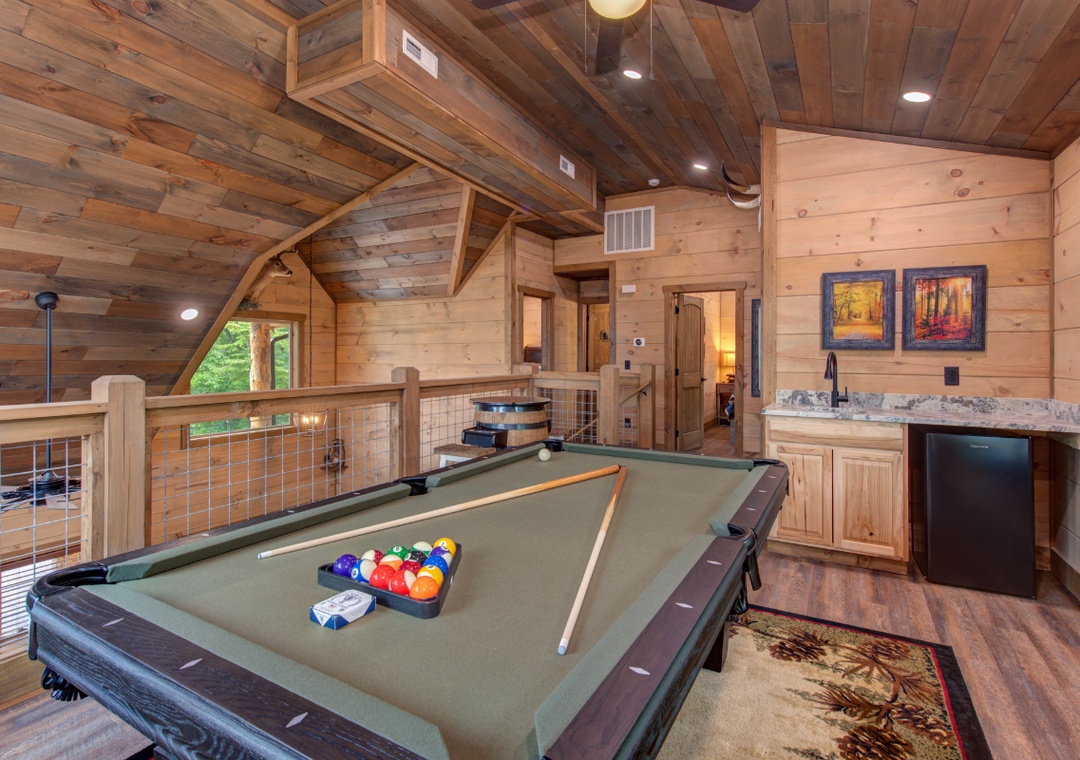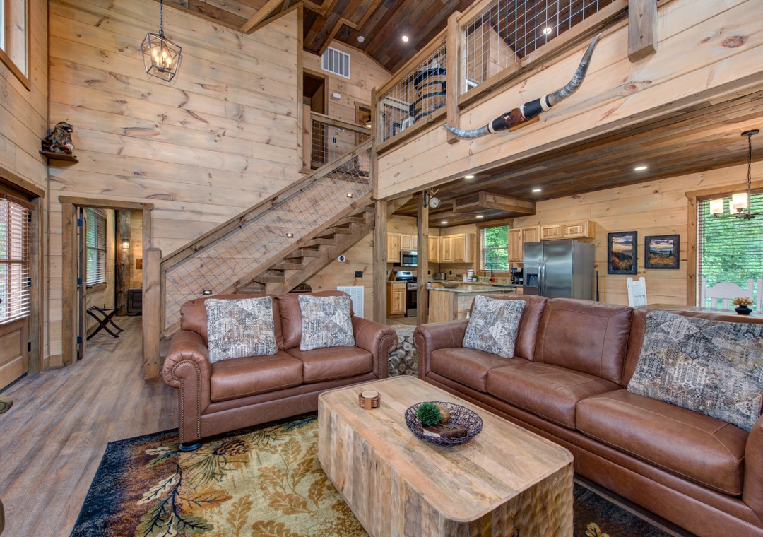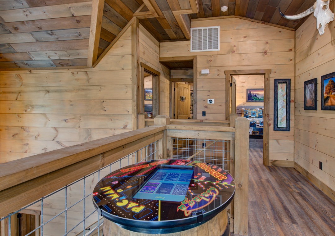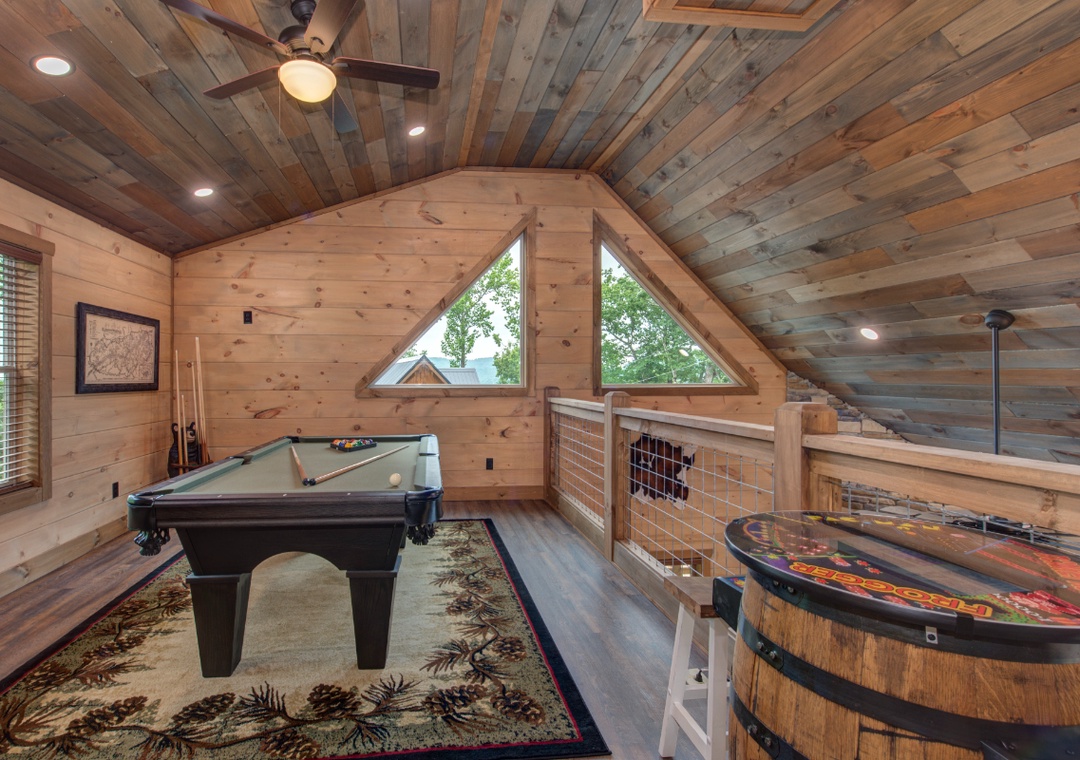 The heart of the cabin is the warm and welcoming living room, where rustic wood accents, vaulted ceilings, and large windows combine to create a bright yet cozy atmosphere. Gather around the 65" Roku TV for movie nights, sports events, or binge-watching your favorite series, all while relaxing on leather sofas that surround an inviting electric fireplace. The kitchen is fully equipped with all the essentials you’ll need for preparing meals, and the adjacent dining space is perfect for gathering around the table for a hearty breakfast or a long, laughter-filled dinner after a day of adventures. Upstairs, you’ll find the game loft that offers unbeatable indoor entertainment. Free WiFi is also available throughout the property.