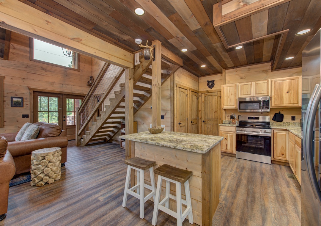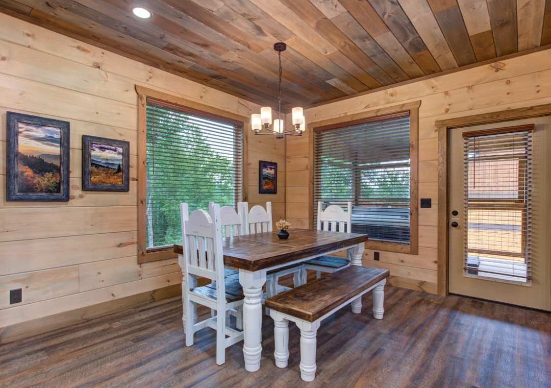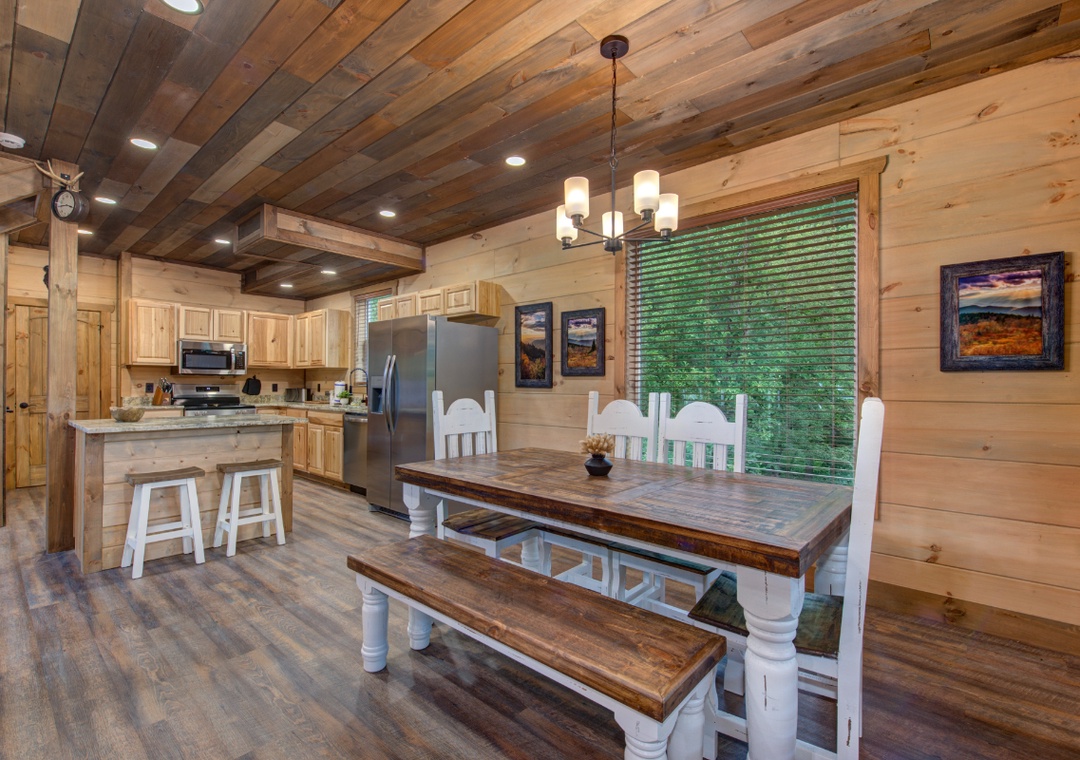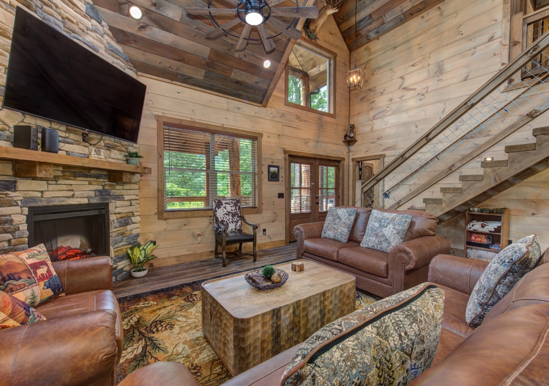 The heart of the cabin is the warm and welcoming living room, where rustic wood accents, vaulted ceilings, and large windows combine to create a bright yet cozy atmosphere. Gather around the 65" Roku TV for movie nights, sports events, or binge-watching your favorite series, all while relaxing on leather sofas that surround an inviting electric fireplace. The kitchen is fully equipped with all the essentials you’ll need for preparing meals, and the adjacent dining space is perfect for gathering around the table for a hearty breakfast or a long, laughter-filled dinner after a day of adventures. Upstairs, you’ll find the game loft that offers unbeatable indoor entertainment. Free WiFi is also available throughout the property.