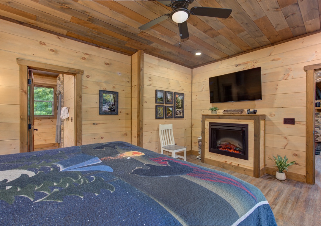✔ Bedroom #1 (Main Level): Spacious Bedroom with a King-sized Bed, an Electtric Fireplace and flat-screen TV; Attached Full Bathroom with a Stand Up Shower
