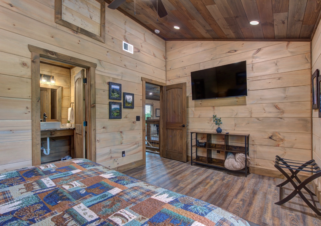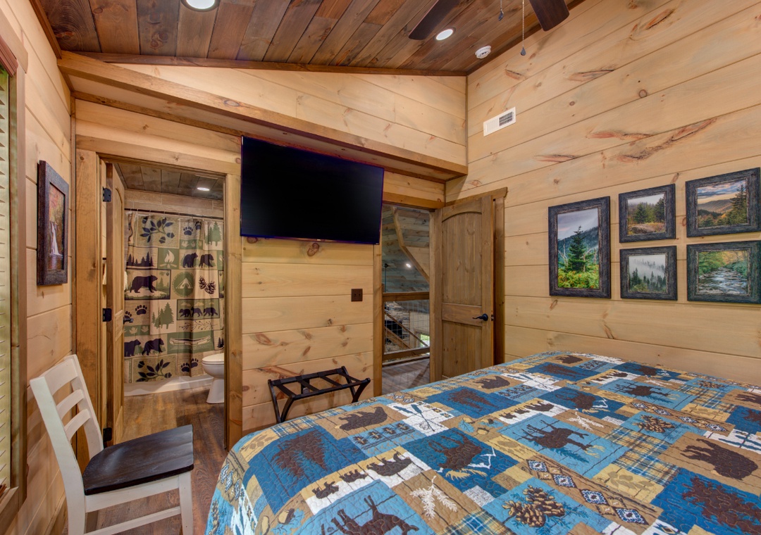 ✔ Bedroom #2 (Upper Level): Comfortable Bedroom with a King-sized Bed and flat-screen TV; Attached Full Bathroom with Shower/Tub Combo