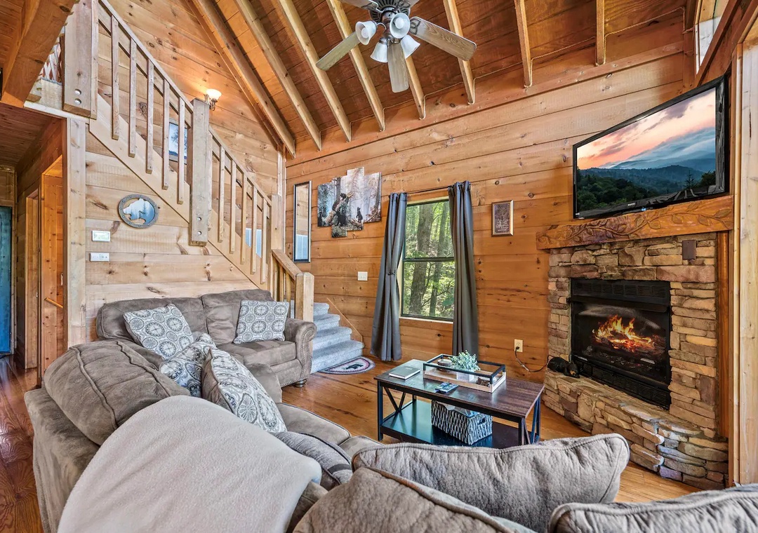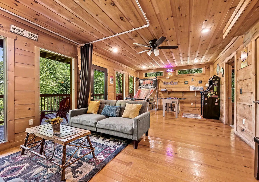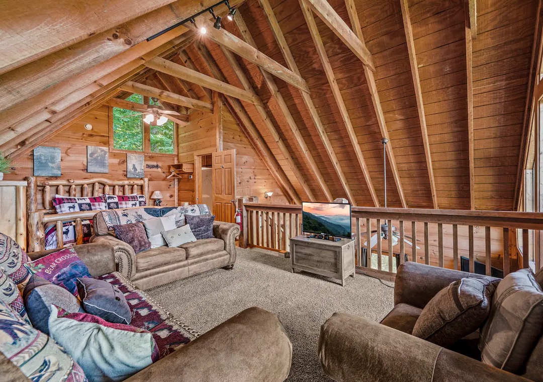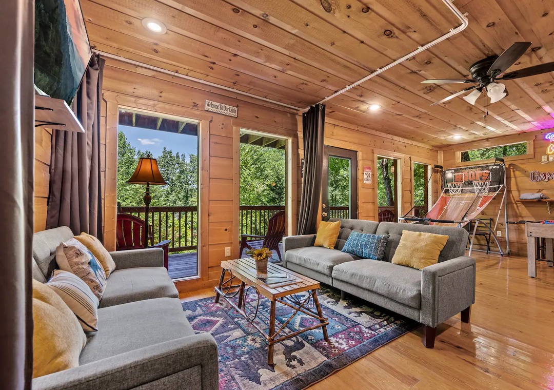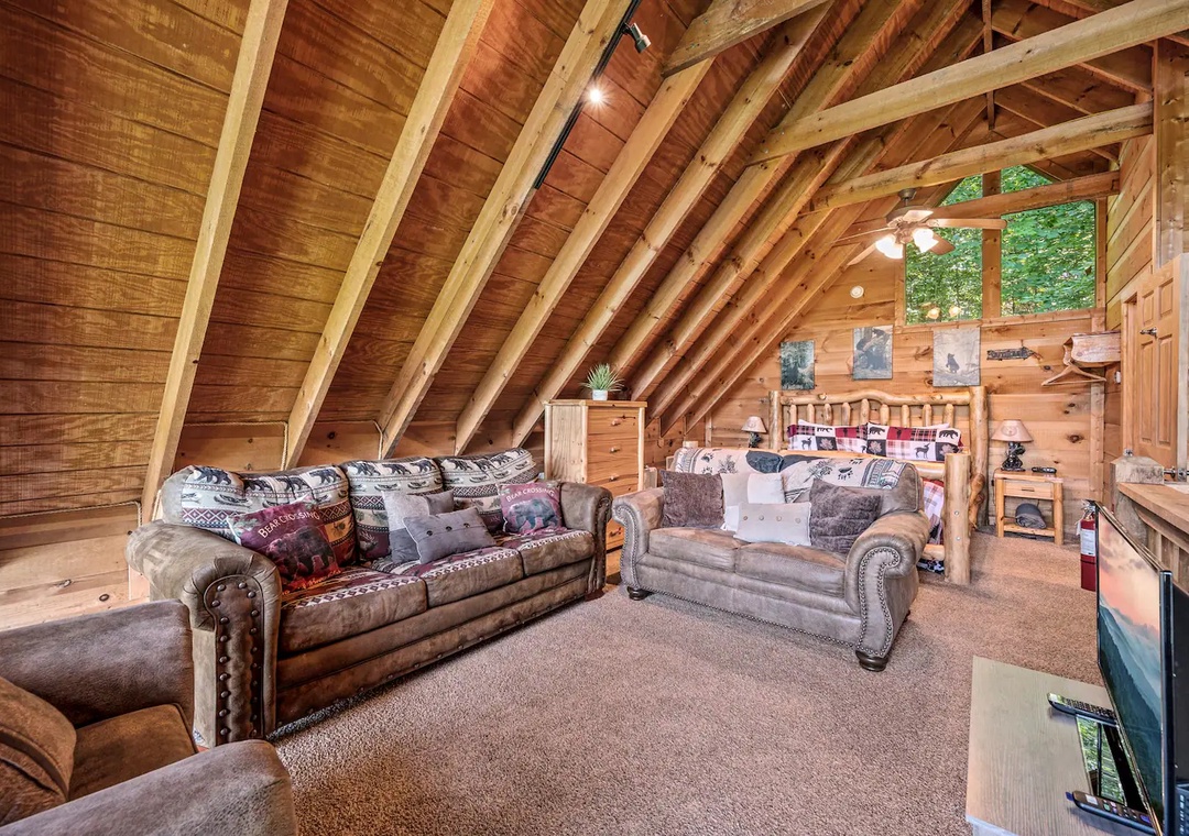 Fully furnished cabin, smart TVs, large open living area, stone fireplace in living room, large game room with basketball game + futons, spacious loft with King bed and living area, fully equipped kitchen, indoor jacuzzi tub