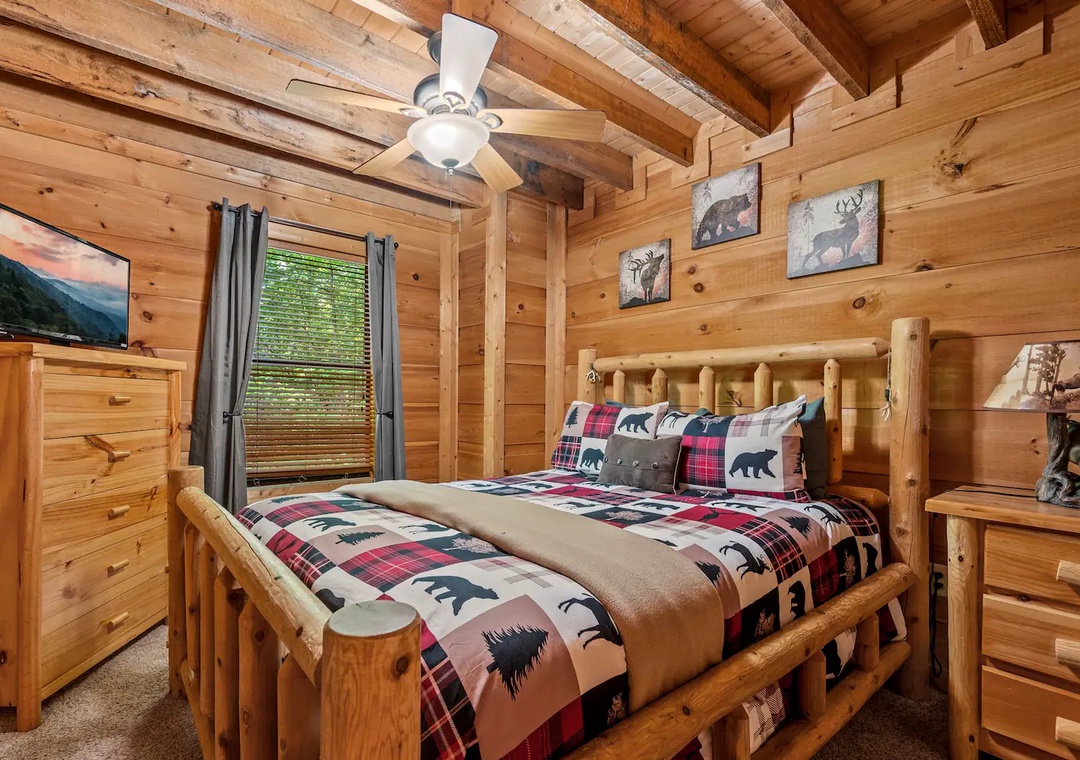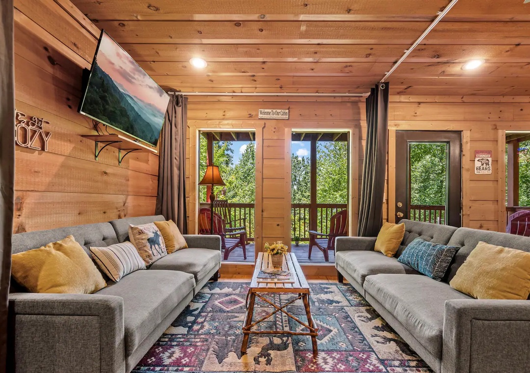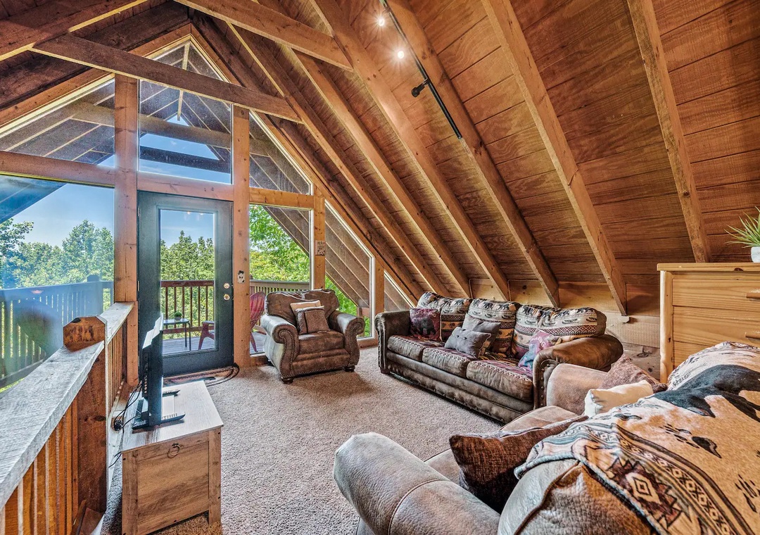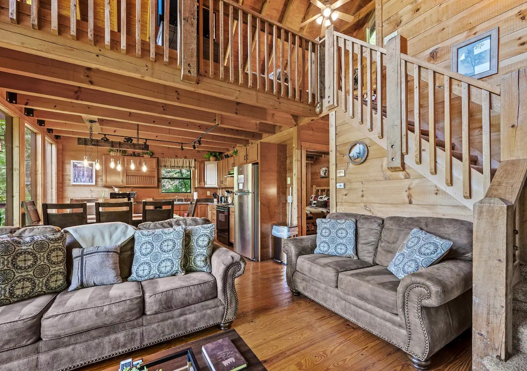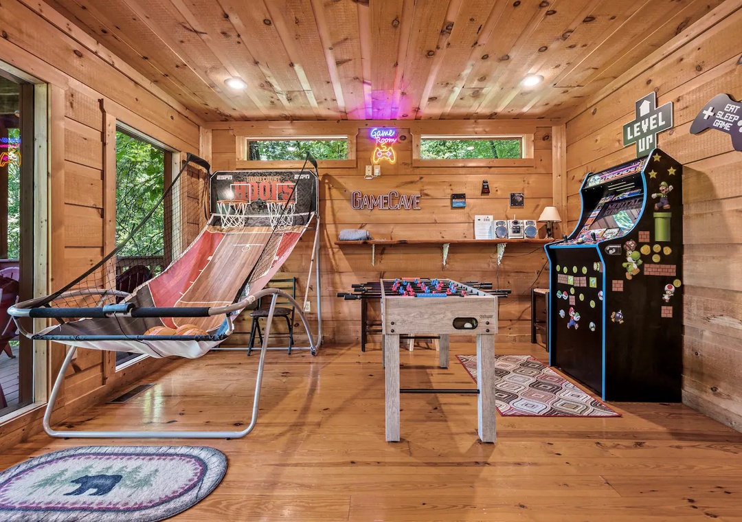 Fully furnished cabin, smart TVs, large open living area, stone fireplace in living room, large game room with basketball game + futons, spacious loft with King bed and living area, fully equipped kitchen, indoor jacuzzi tub